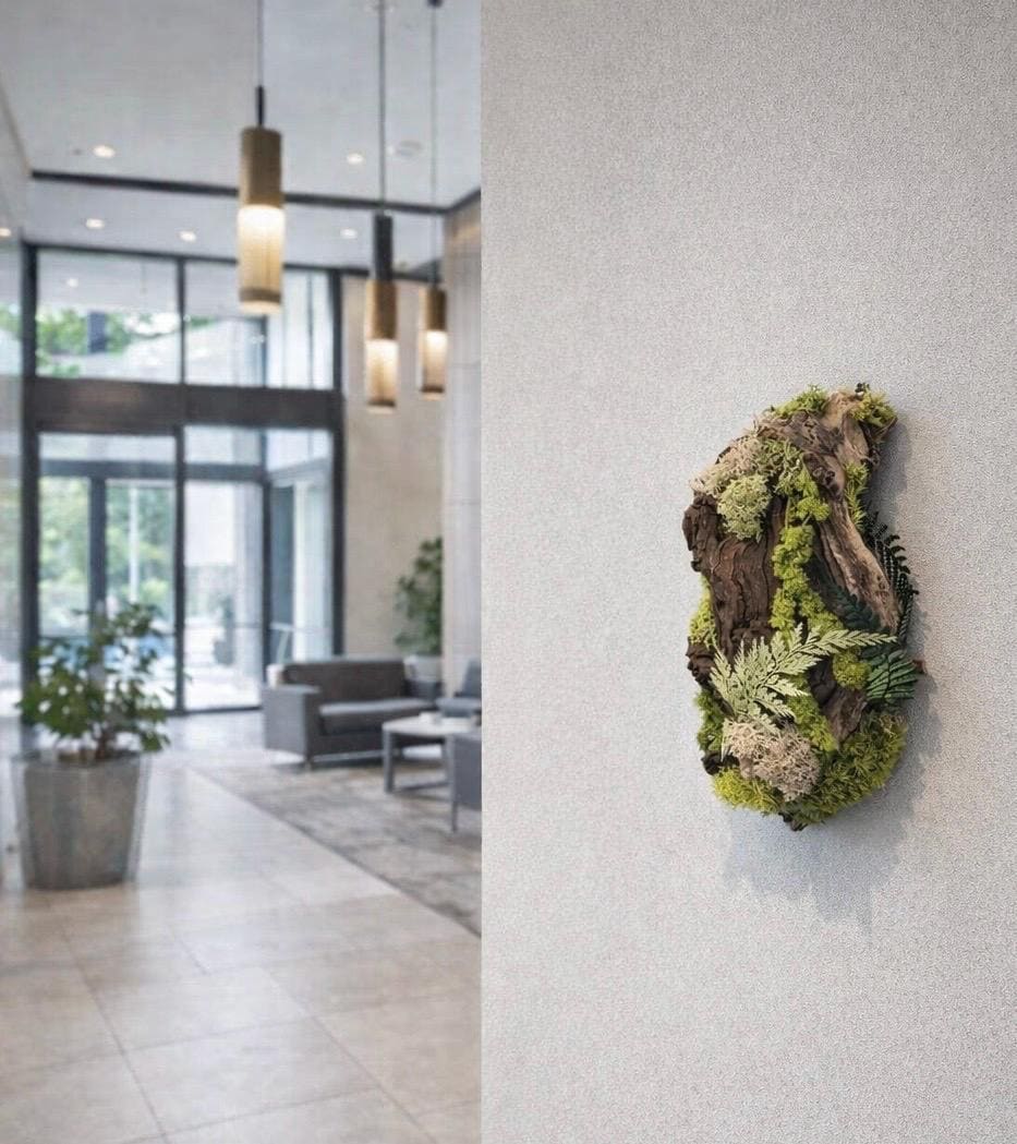 Chaque courbe et nœud raconte l’histoire de l’arbre, patiemment façonnée par les années. La racine est enrichie à la main de mousses stabilisées, lichens, et feuillages naturels, dans un camaïeu de verts doux et de textures variées.