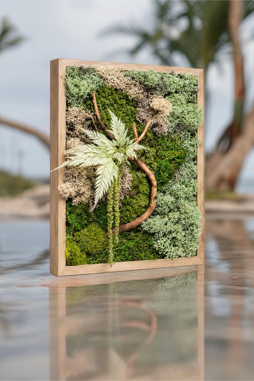 Ce tableau est composé de mousses stabilisées, de feuillages naturels et de bois soigneusement sélectionnés, créant une composition texturée, harmonieuse et apaisante. Monté sur un fond bois clair qui met en valeur les nuances de vert, beige et brun, il s’intègre facilement dans une déco moderne, bohème, ou naturelle.