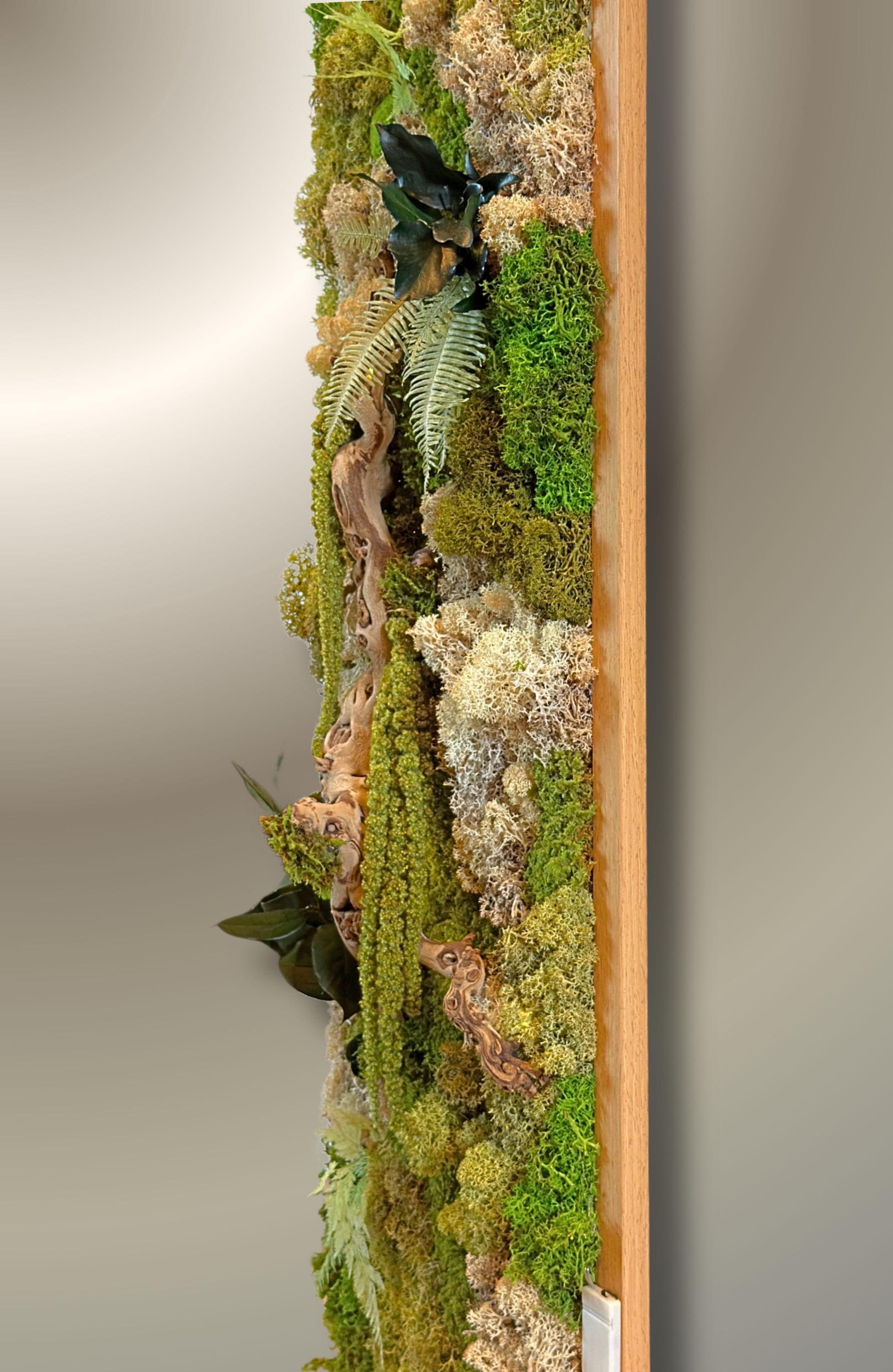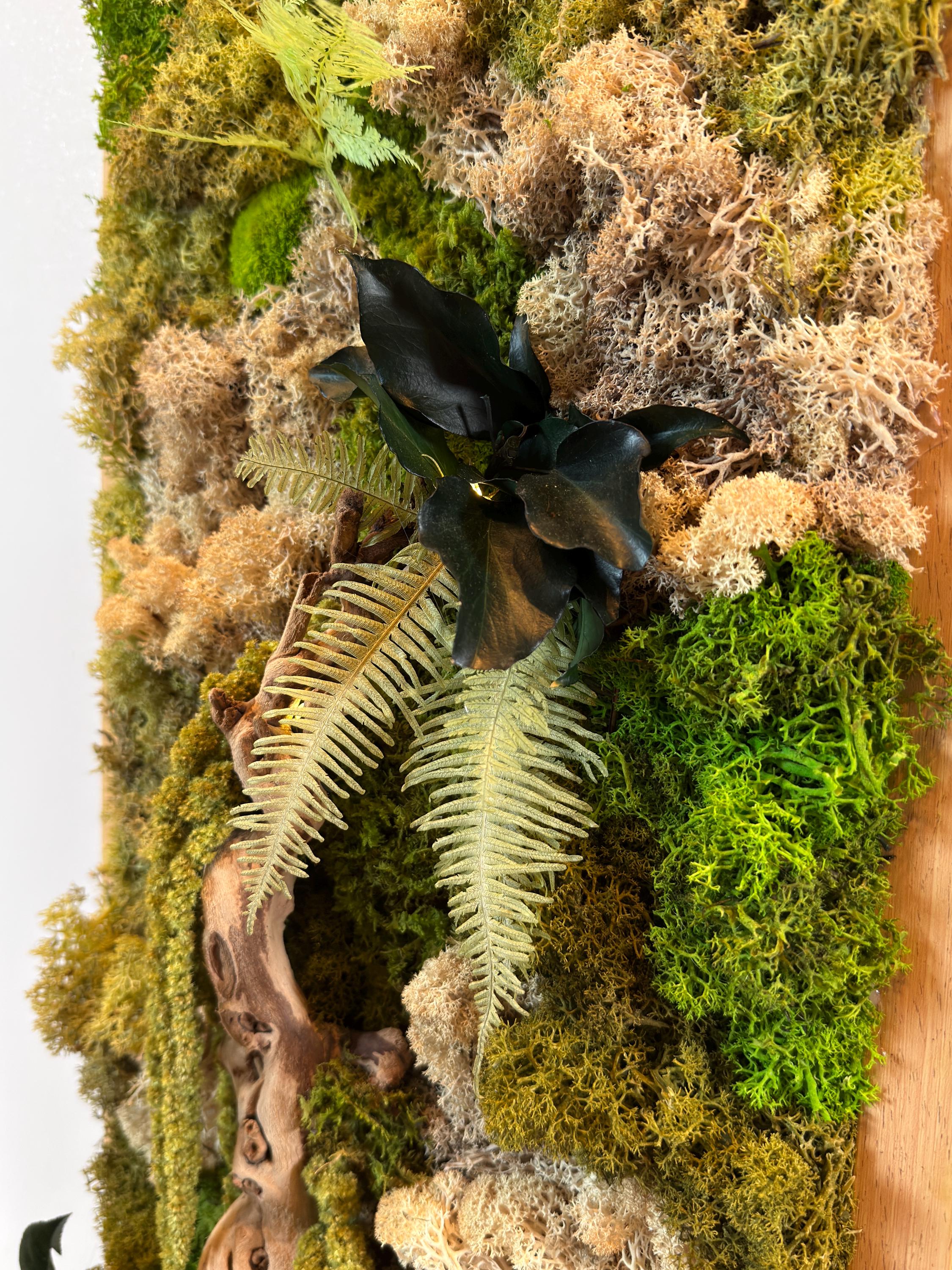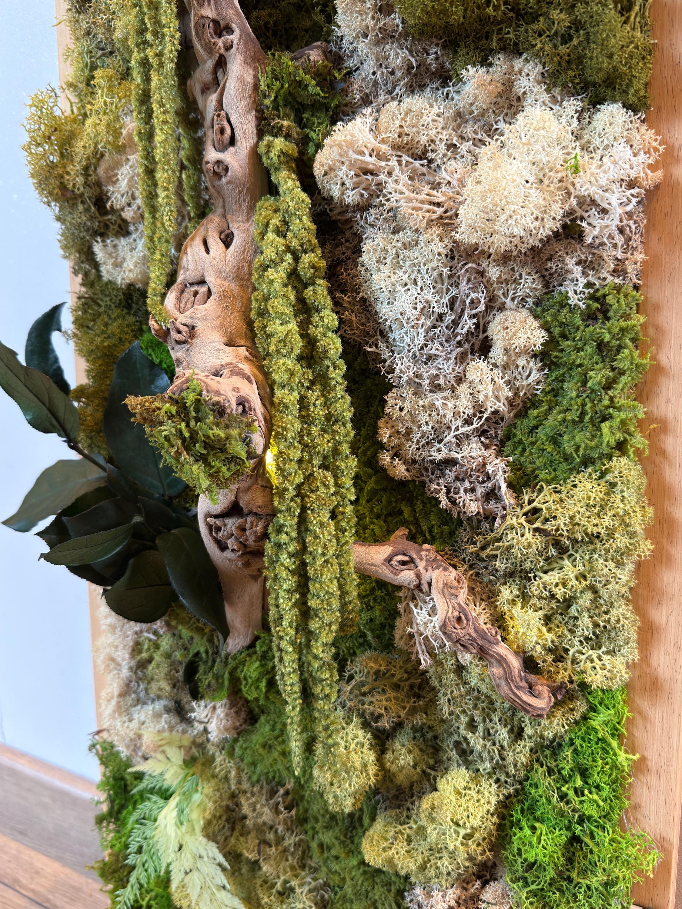 Apportez une touche de nature apaisante à votre intérieur avec ce cadre végétal mural composé de mousses stabilisées, de feuillages soigneusement choisis et d’un élégant bois flotté sculptural. Chaque élément a été sélectionné avec soin pour créer un tableau vivant, à la fois texturé et harmonieux.
