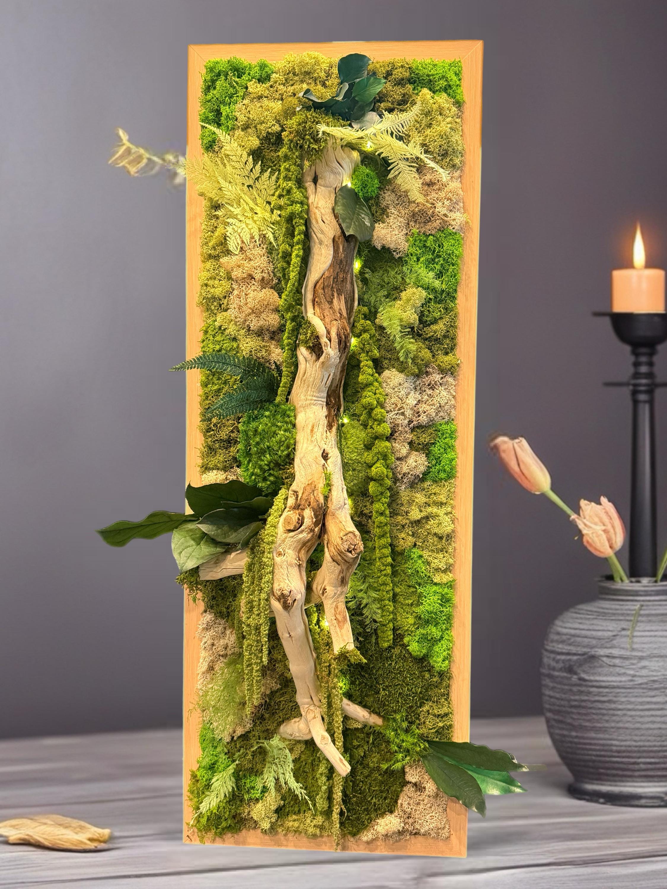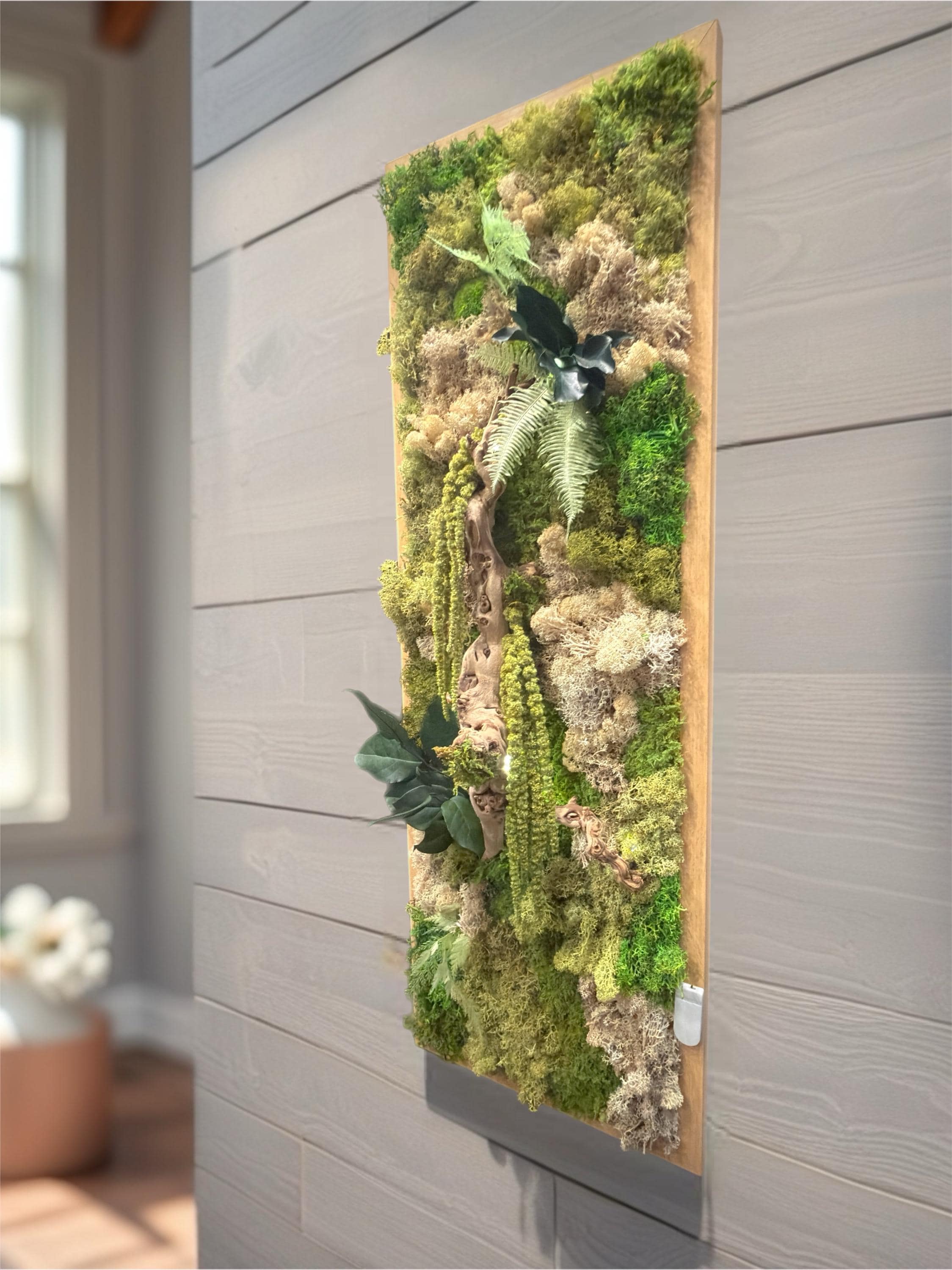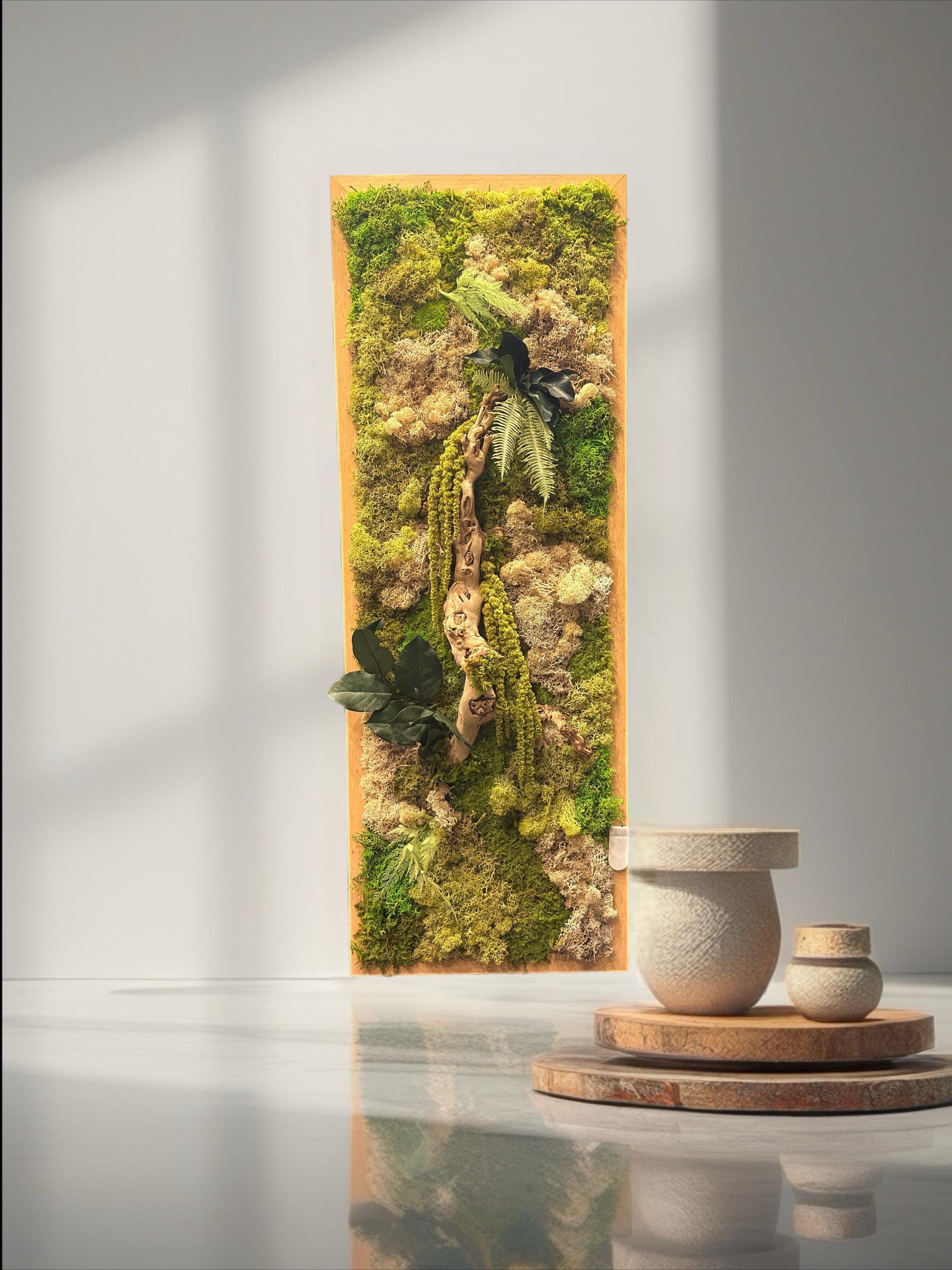 Apportez une touche de nature apaisante à votre intérieur avec ce cadre végétal mural composé de mousses stabilisées, de feuillages soigneusement choisis et d’un élégant bois flotté sculptural. Chaque élément a été sélectionné avec soin pour créer un tableau vivant, à la fois texturé et harmonieux.