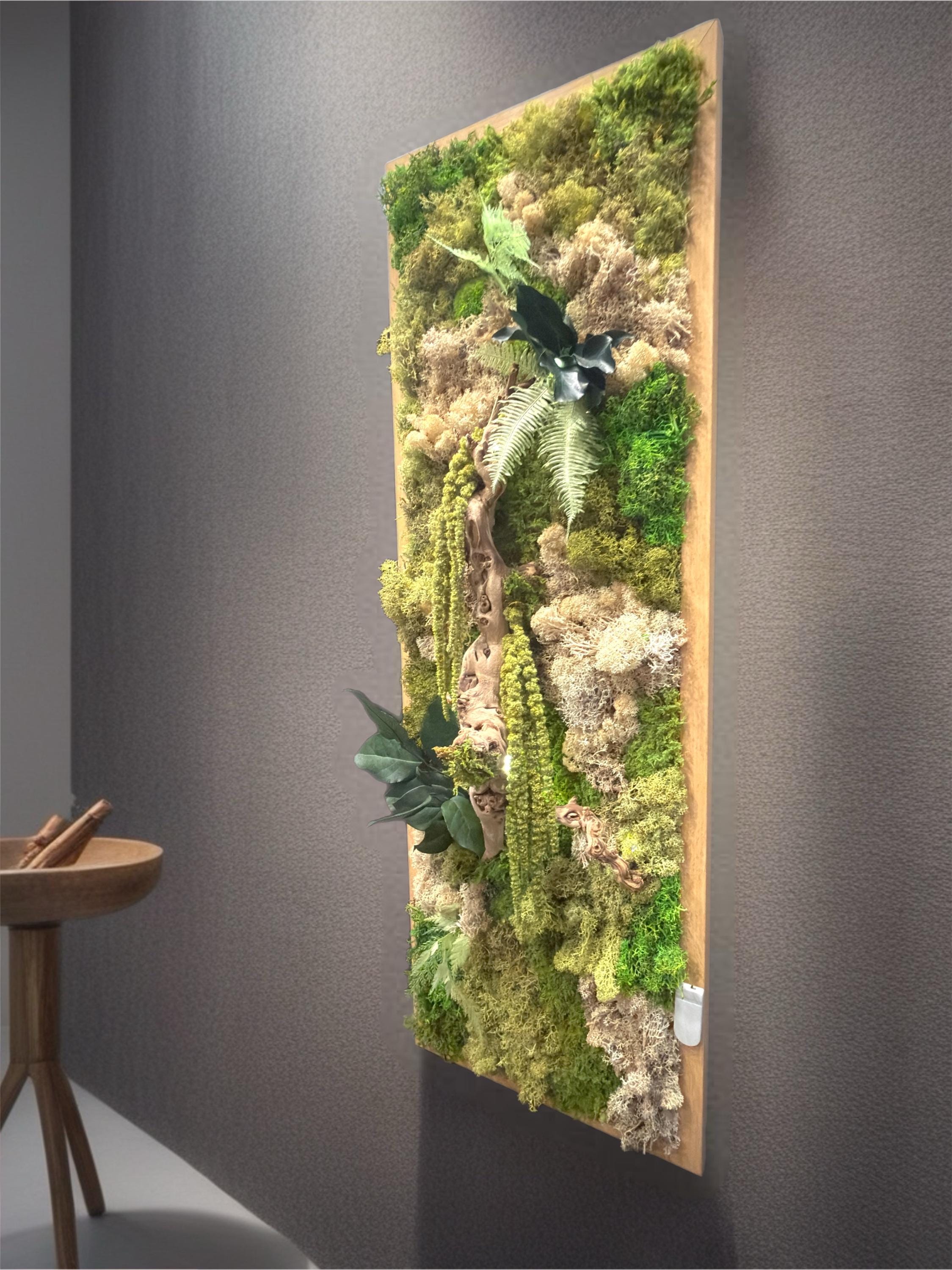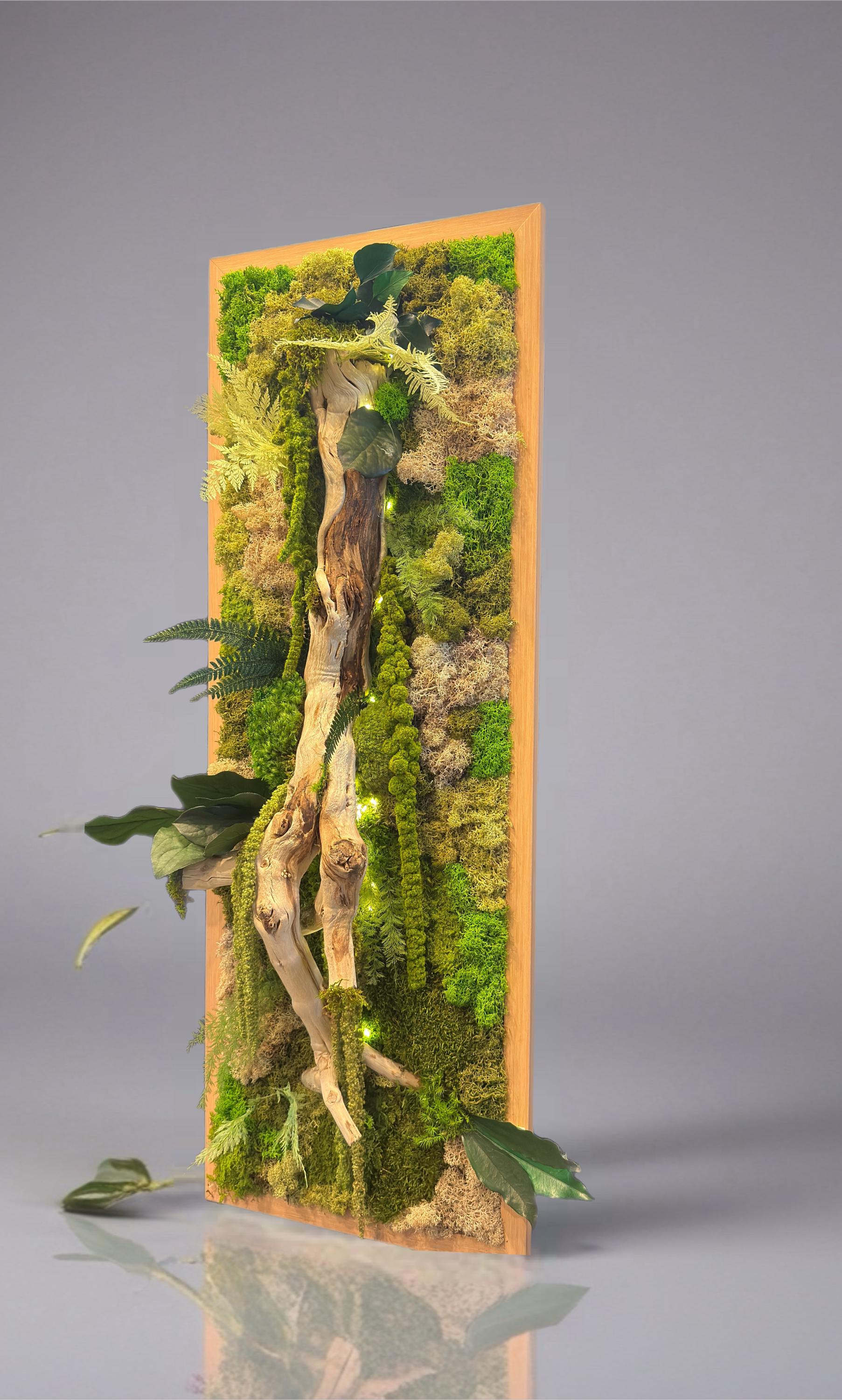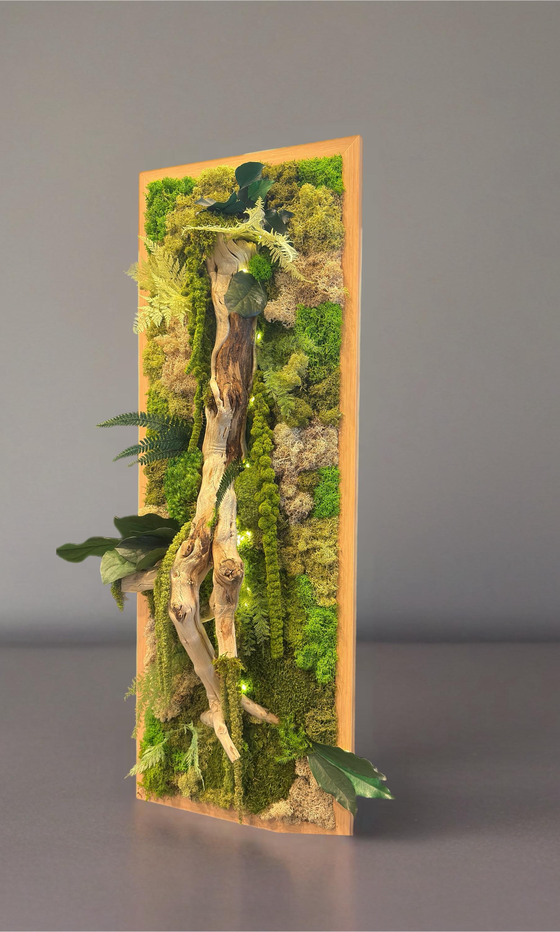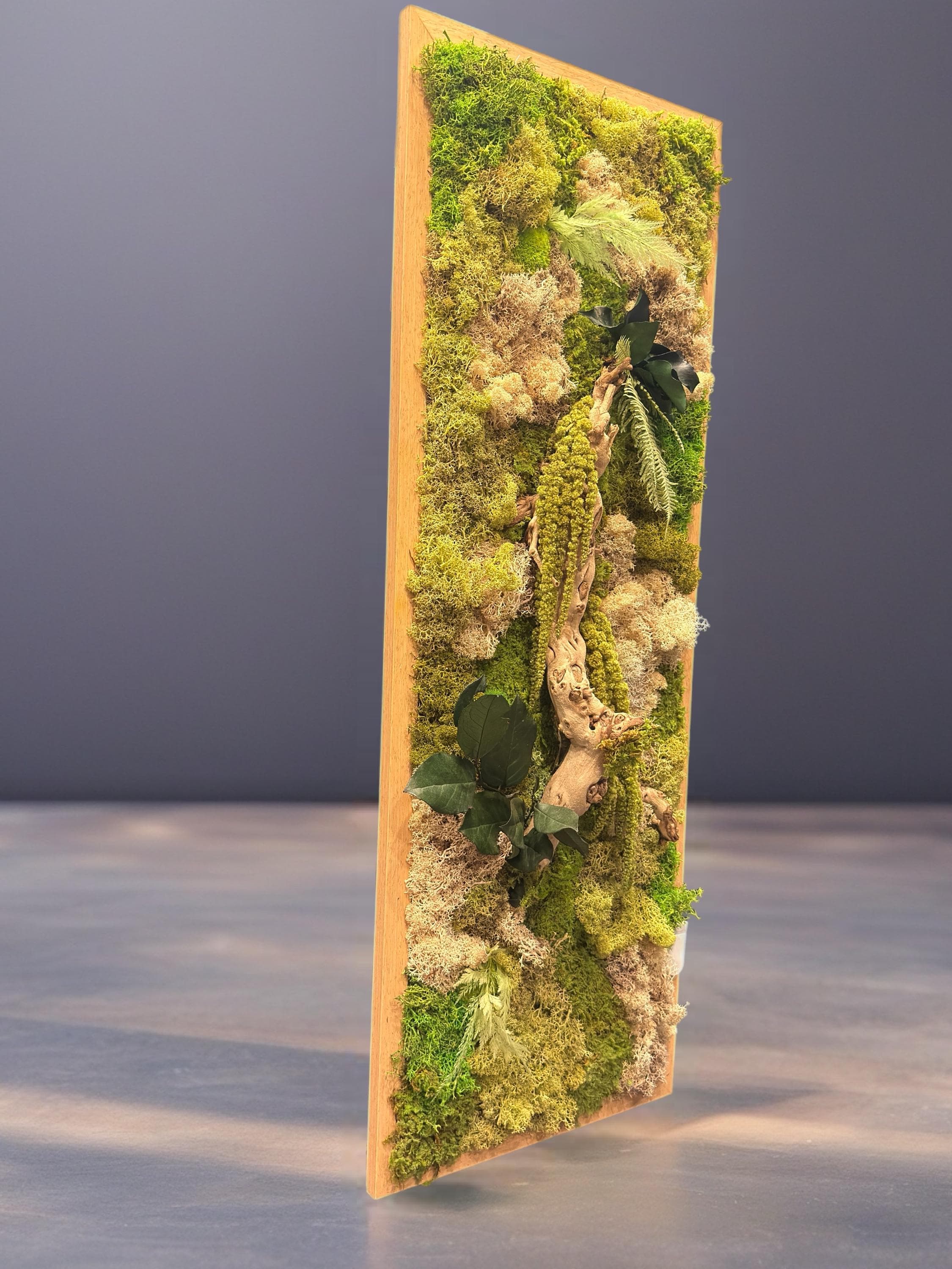 Apportez une touche de nature apaisante à votre intérieur avec ce cadre végétal mural composé de mousses stabilisées, de feuillages soigneusement choisis et d’un élégant bois flotté sculptural. Chaque élément a été sélectionné avec soin pour créer un tableau vivant, à la fois texturé et harmonieux.