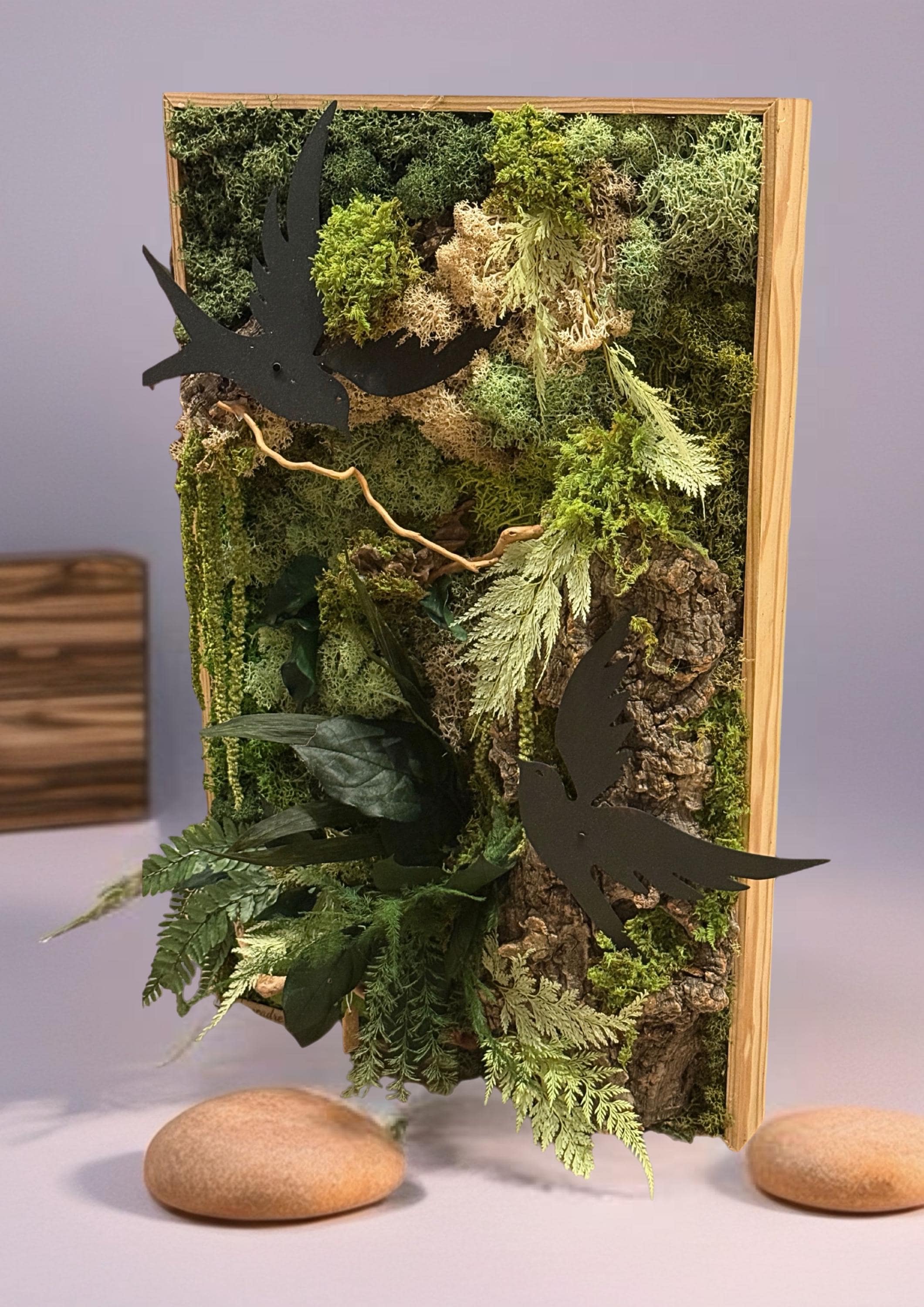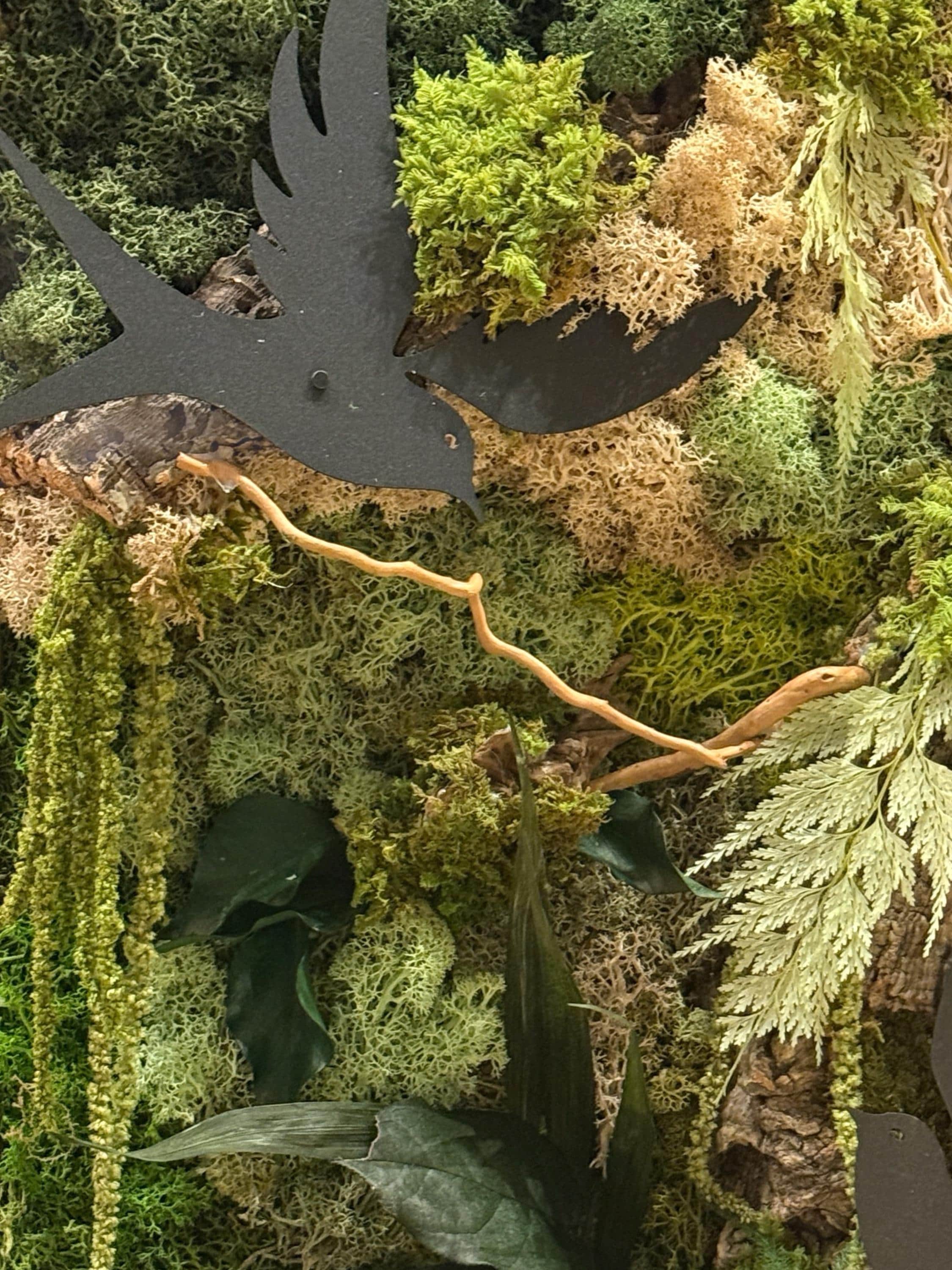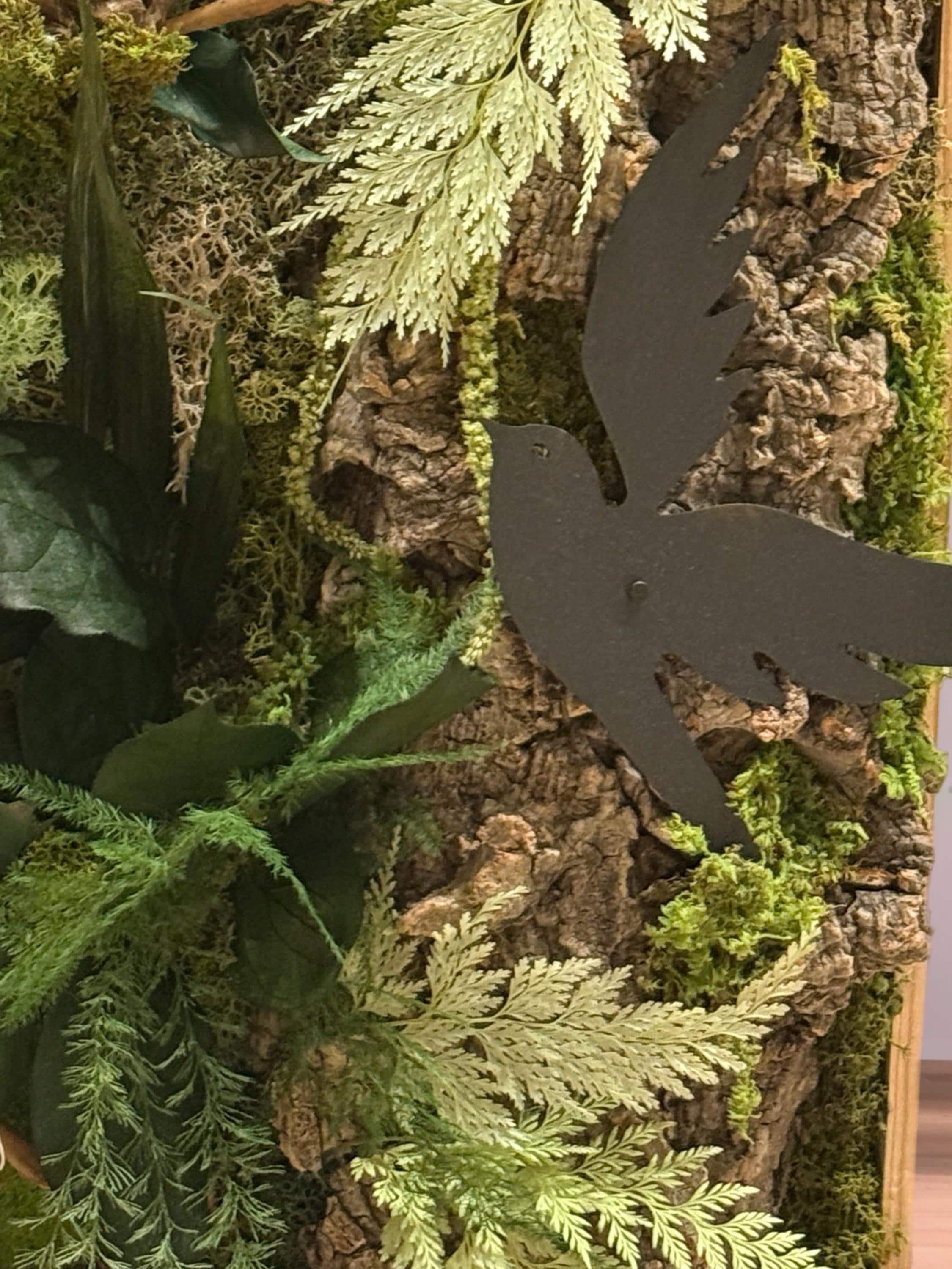 Invitez la nature dans votre intérieur avec ce cadre végétal unique en relief, inspiré des sous-bois féeriques. Chaque élément a été minutieusement sélectionné et assemblé à la main : mousse stabilisée aux multiples nuances de vert, écorces naturelles, fougères délicates, feuillages profonds… et au cœur de cette composition, un oiseau en métal noir dans son nid semble s’élancer dans un envol poétique, symbole de liberté et de légèreté.