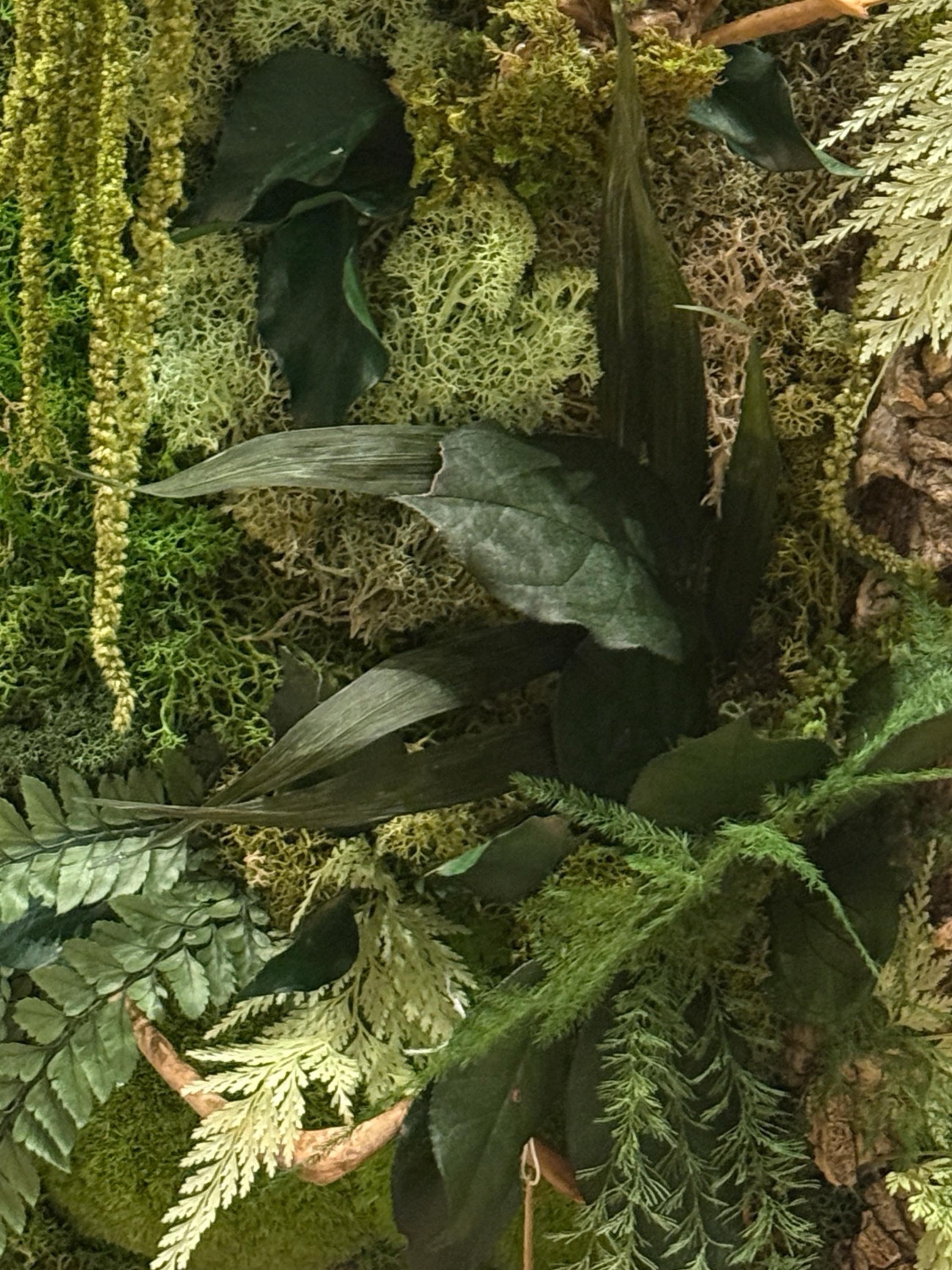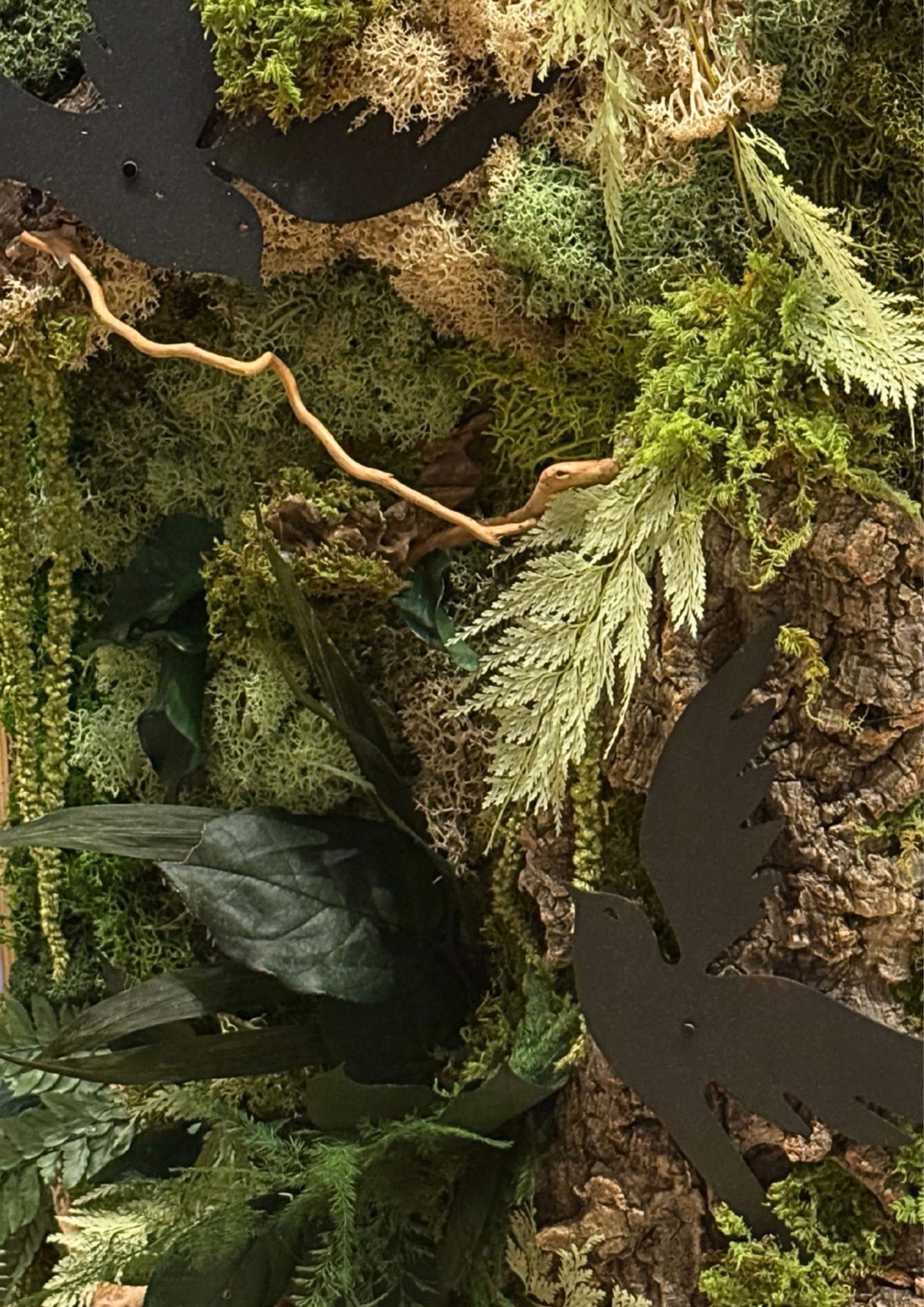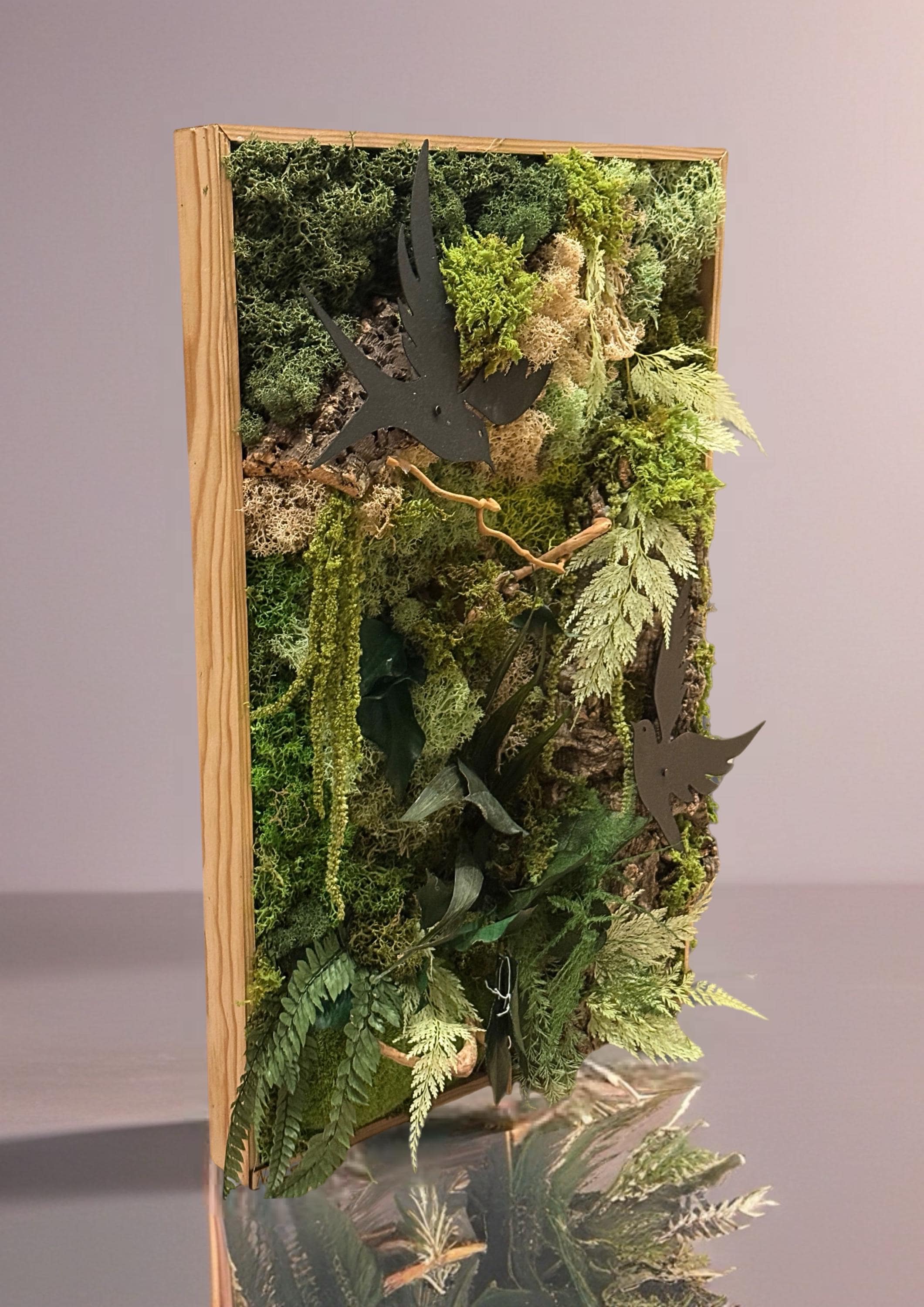Invitez la nature dans votre intérieur avec ce cadre végétal unique en relief, inspiré des sous-bois féeriques. Chaque élément a été minutieusement sélectionné et assemblé à la main : mousse stabilisée aux multiples nuances de vert, écorces naturelles, fougères délicates, feuillages profonds… et au cœur de cette composition, un oiseau en métal noir dans son nid semble s’élancer dans un envol poétique, symbole de liberté et de légèreté.