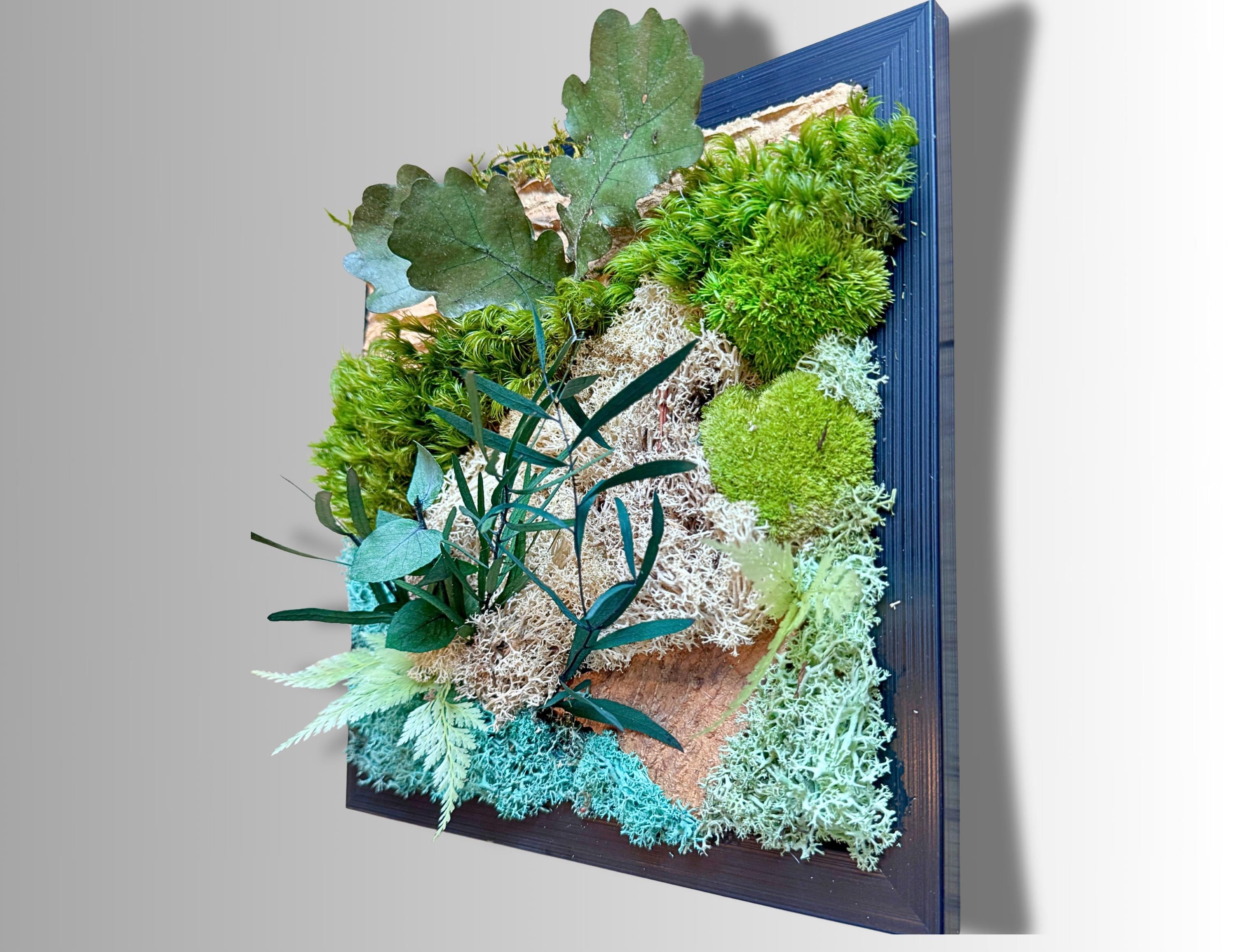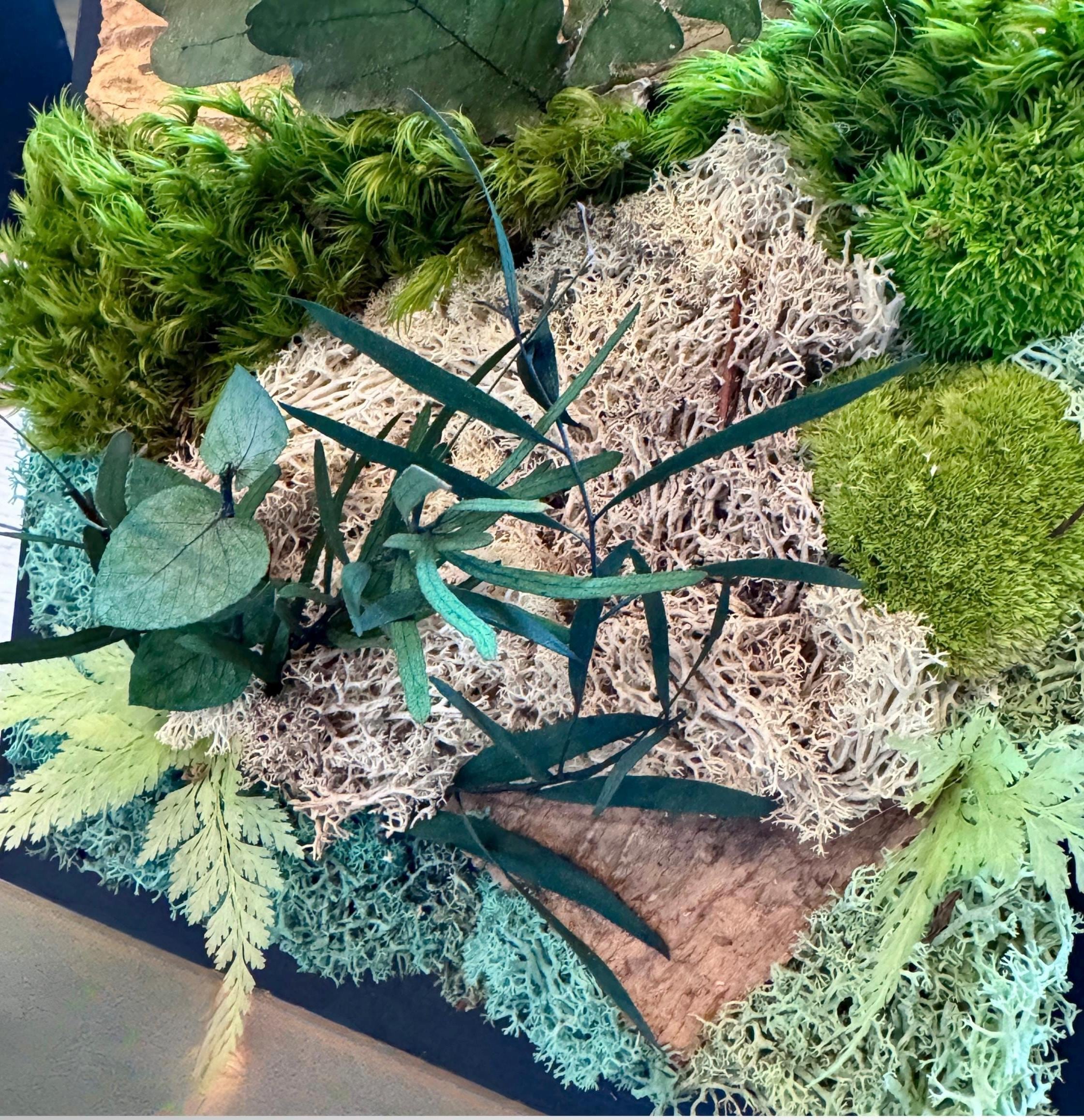 Chaque composition est unique et associe des mousses stabilisées (mousse boule, lichen coloré, mousse plate), des feuillages naturels stabilisés (chêne, fougère, eucalyptus, feuillages graphiques) et une base texturée en bois, le tout sublimé dans un cadre noir design.