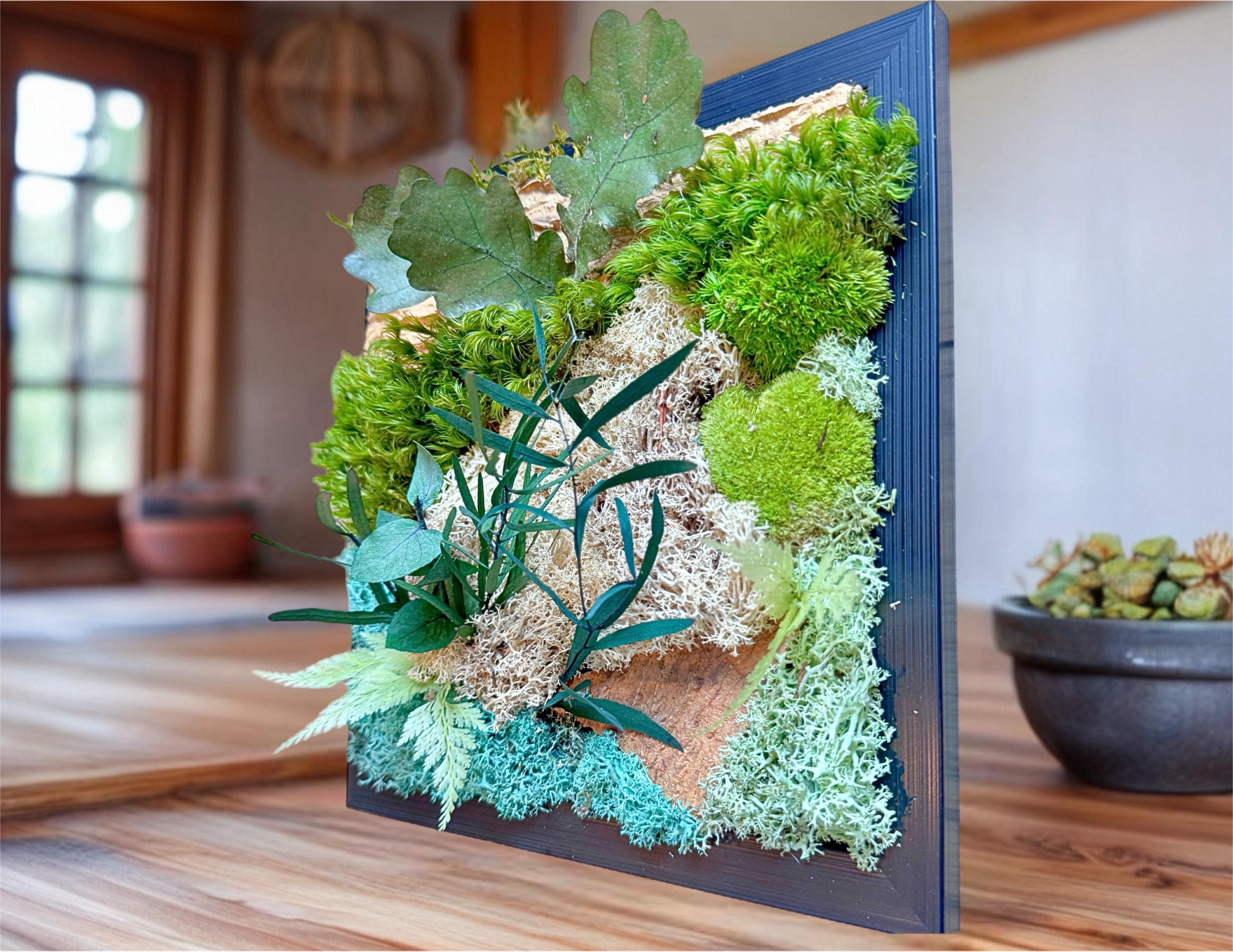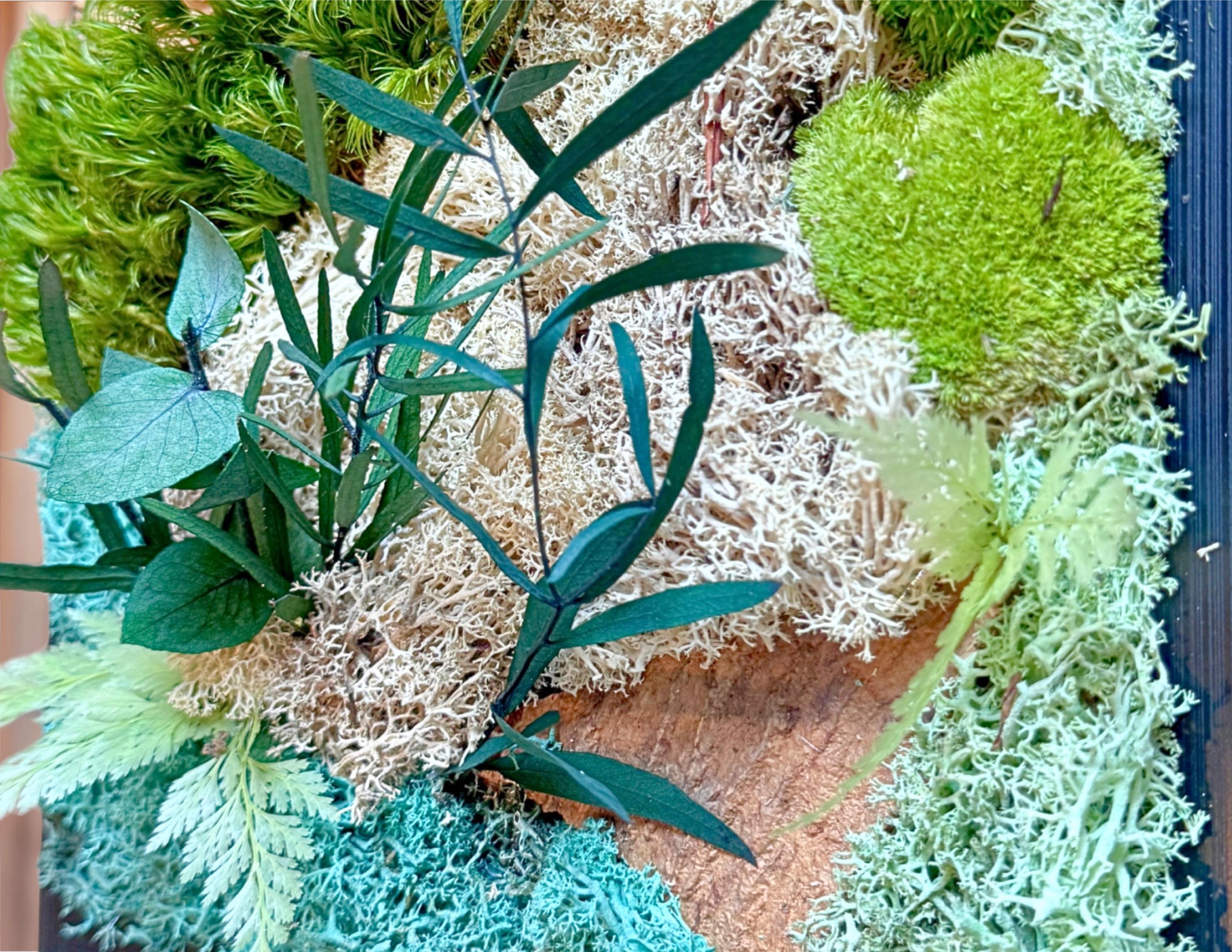Chaque composition est unique et associe des mousses stabilisées (mousse boule, lichen coloré, mousse plate), des feuillages naturels stabilisés (chêne, fougère, eucalyptus, feuillages graphiques) et une base texturée en bois, le tout sublimé dans un cadre noir design.
