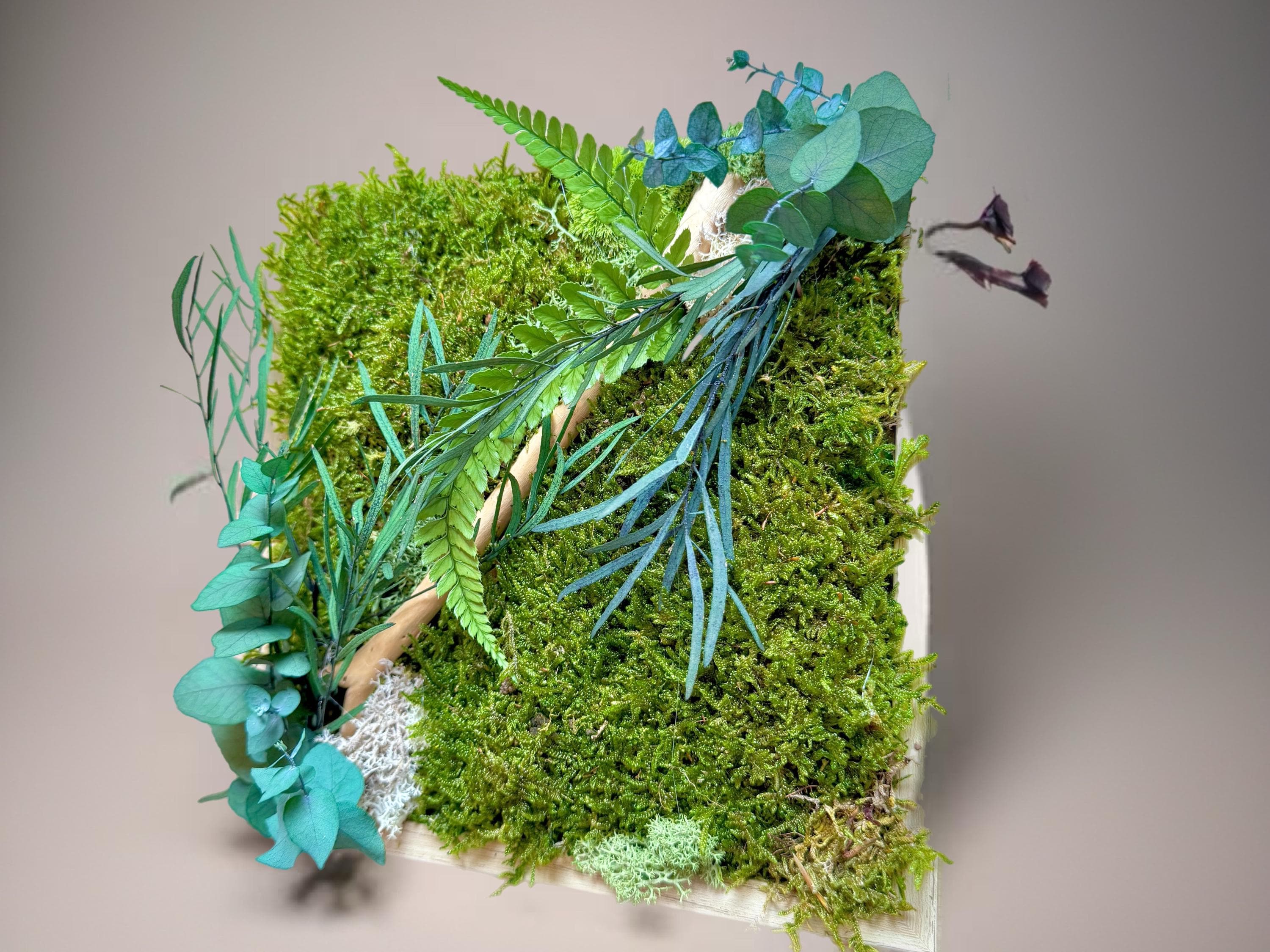 🍃Composition de mousses stabilisées et feuillages (eucalyptus, fougère, lichen, etc.)
