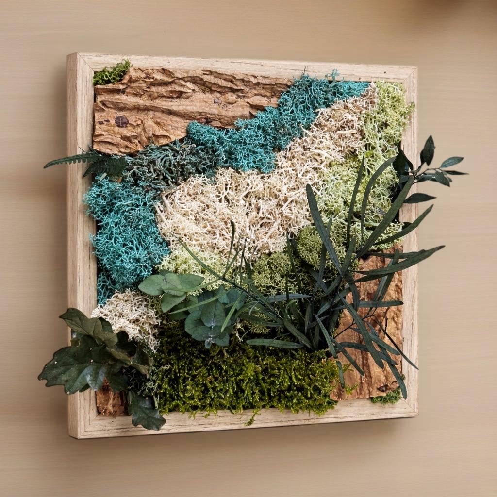 Cadre végétal stabilisé en mousse et feuillage – décoration murale naturelle avec écorce de bois – tableau végétal artisanal fait main