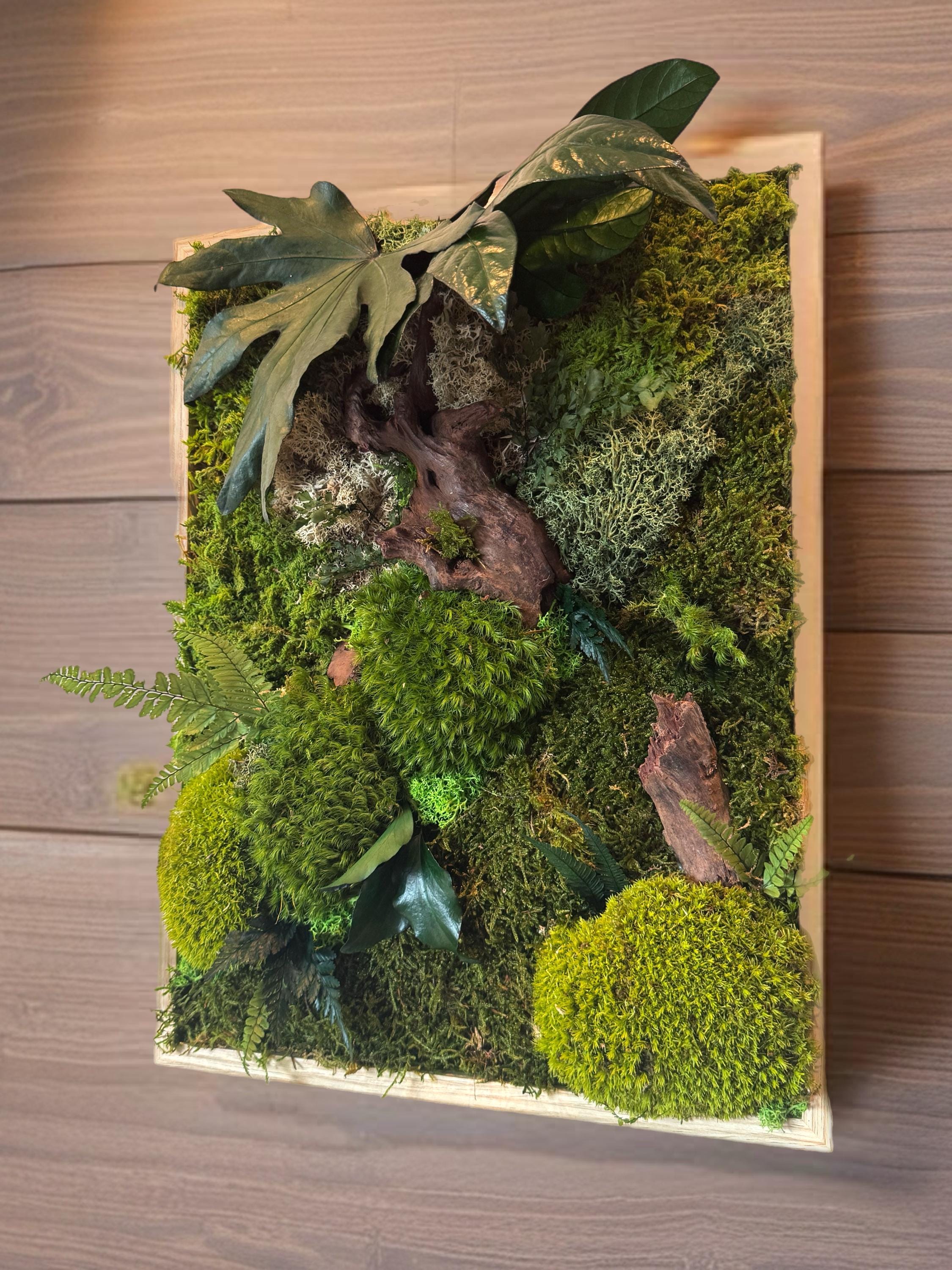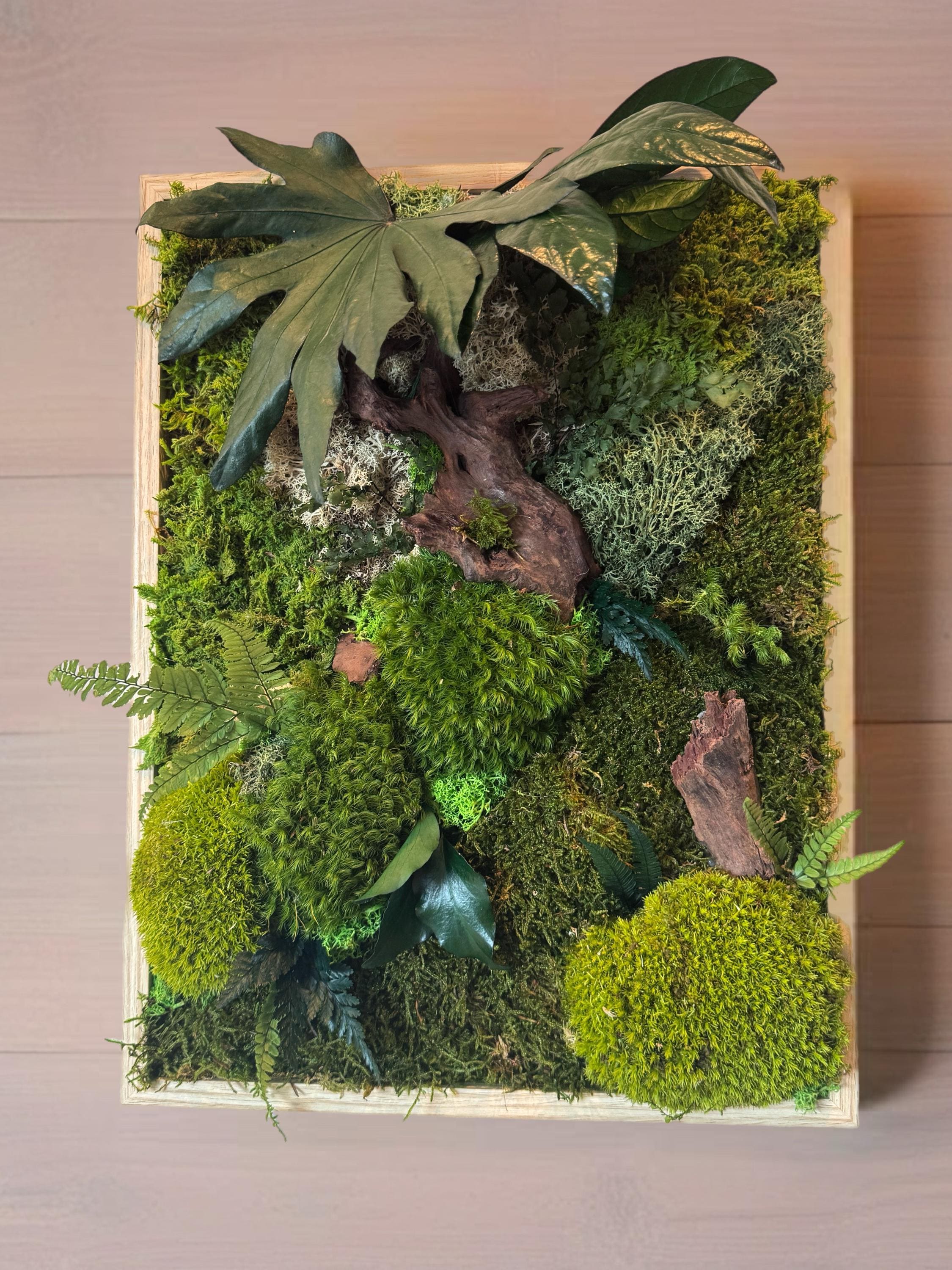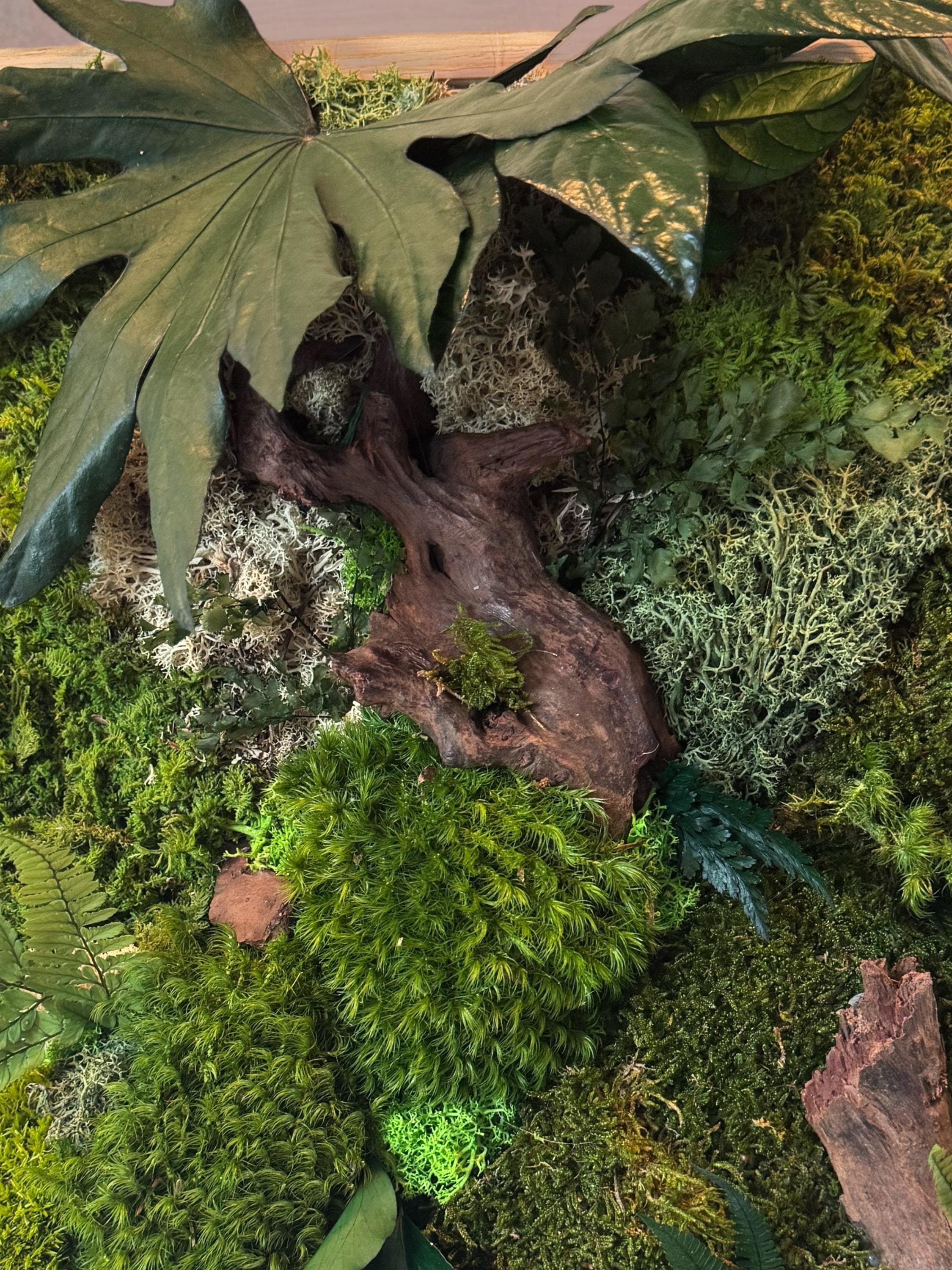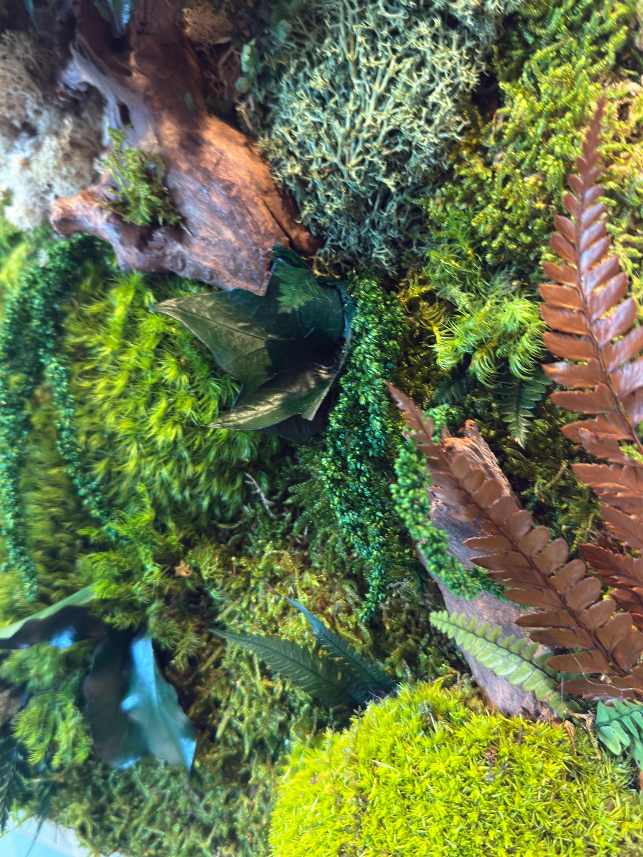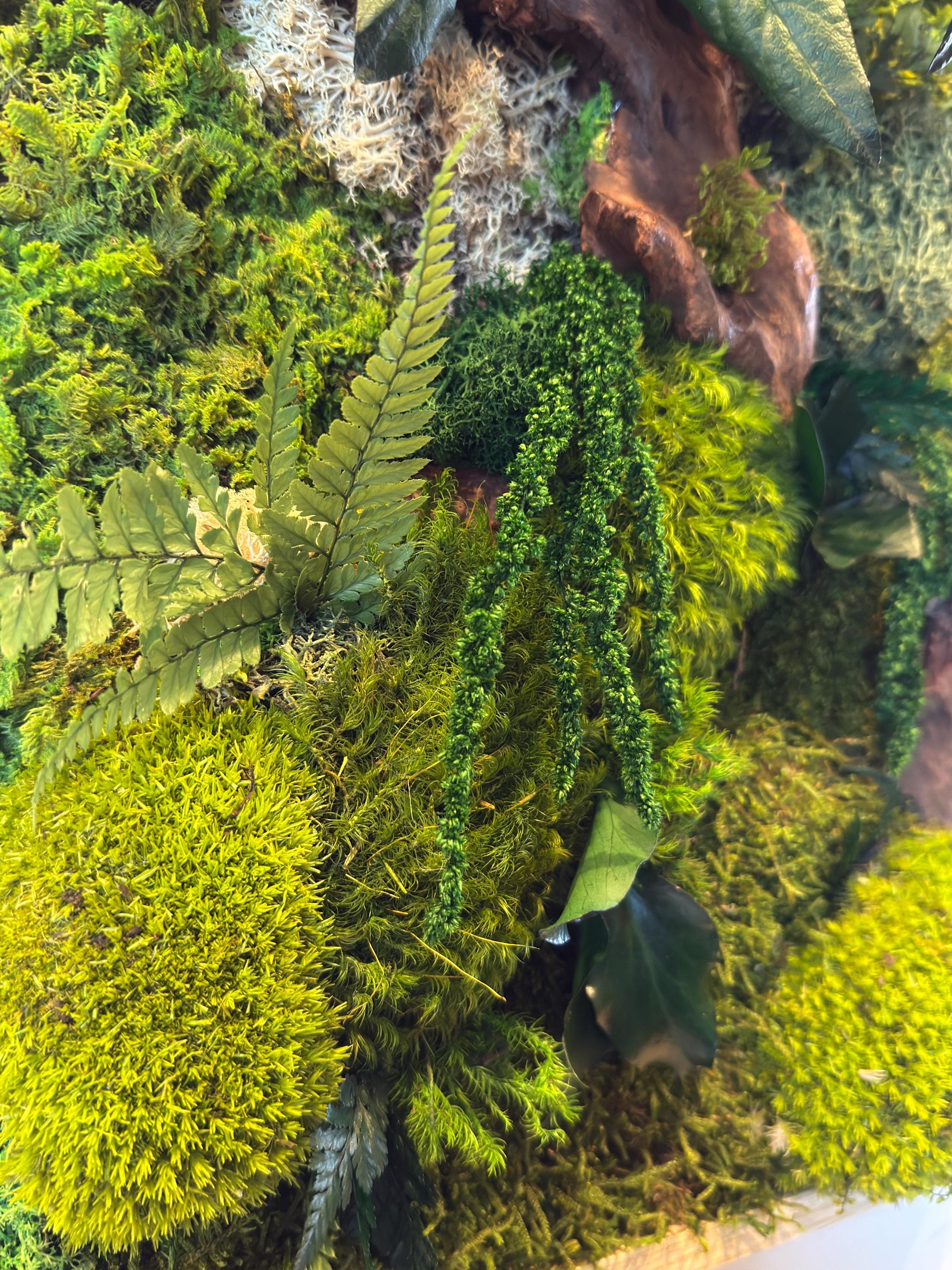 Chaque composition est unique, réalisée à la main avec des éléments naturels soigneusement sélectionnés : mousses bombées et plates, fougères, feuillages stabilisés et morceaux de bois décoratifs.