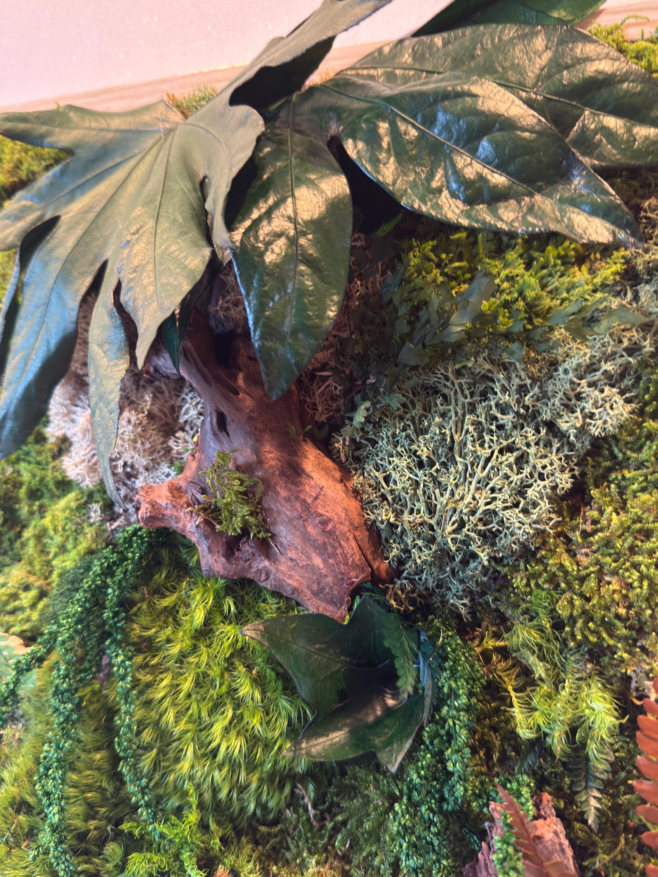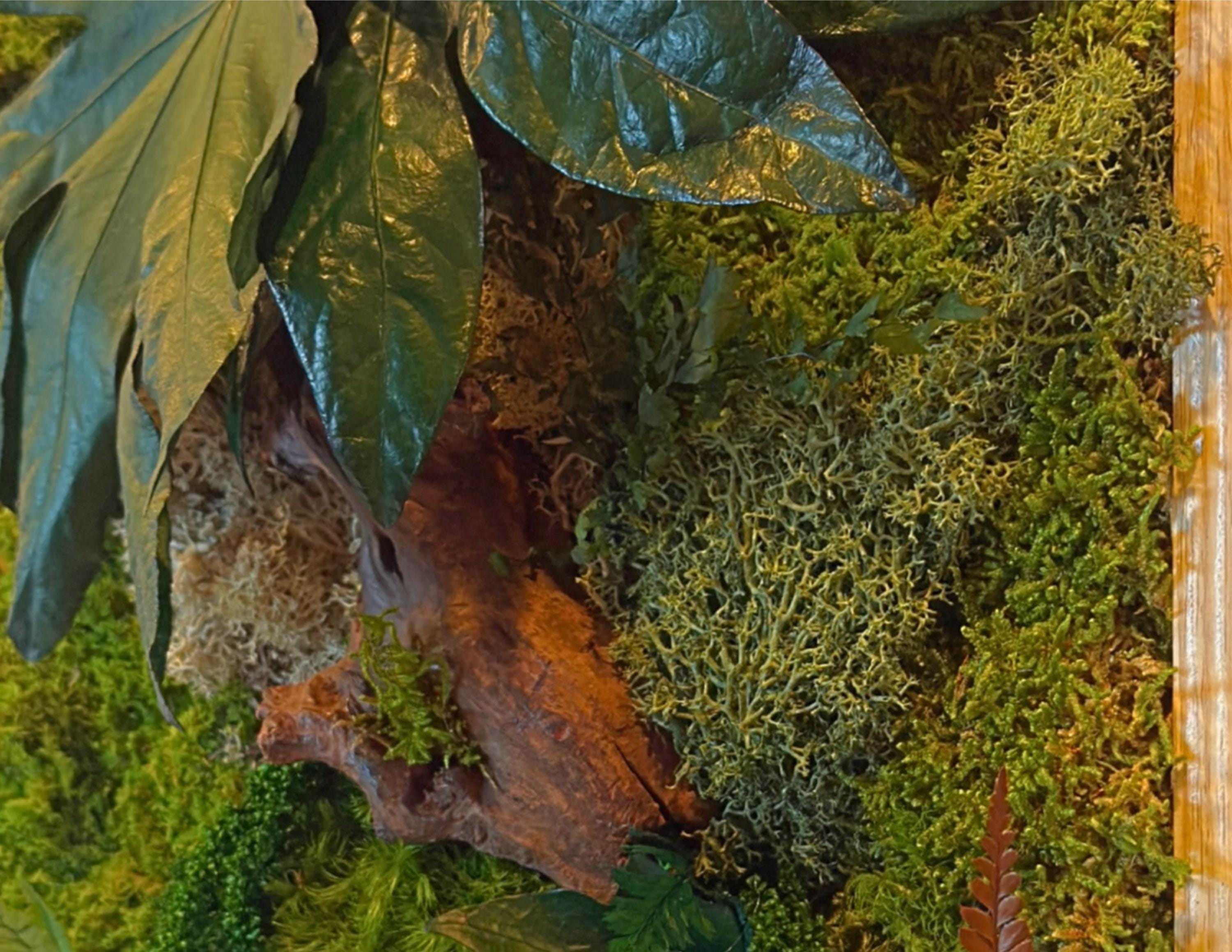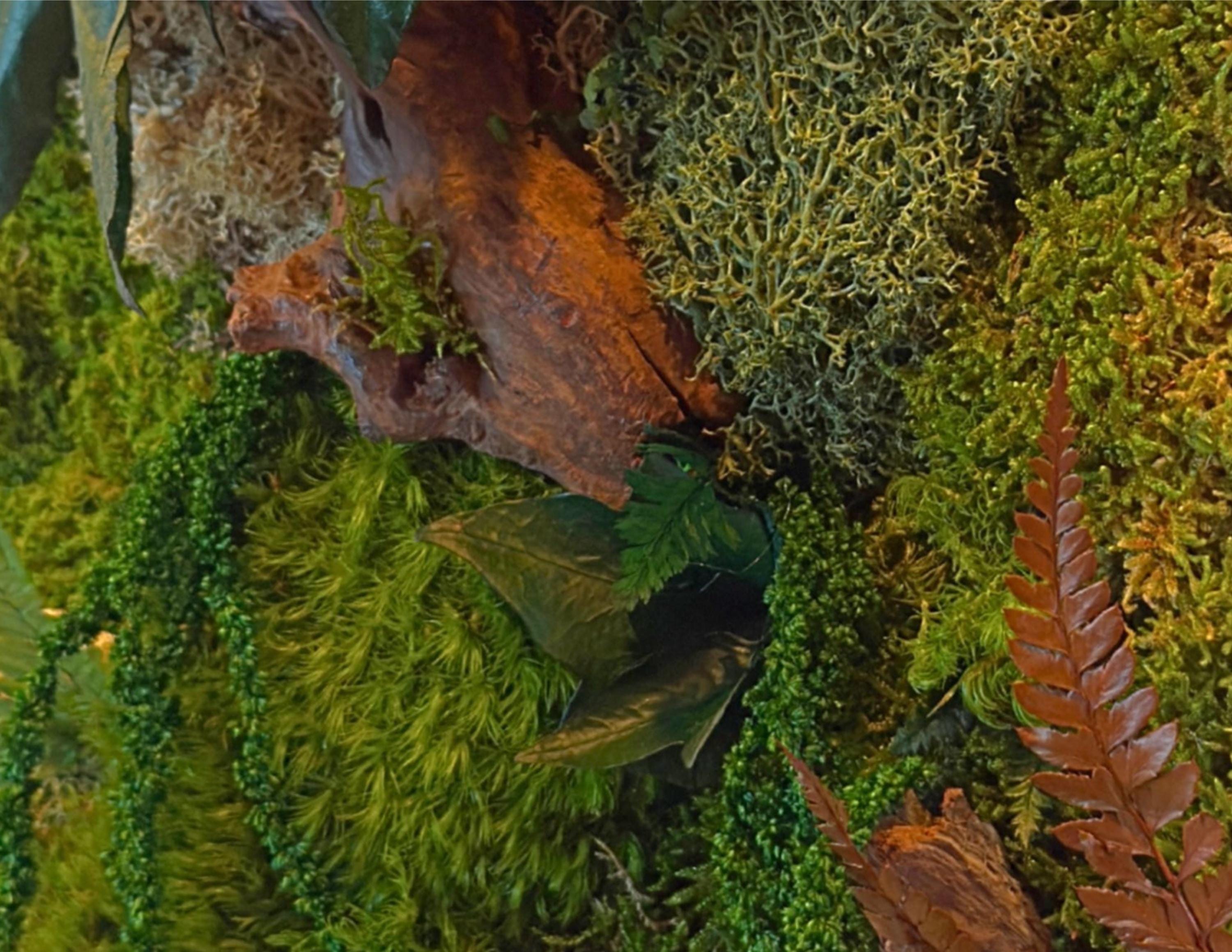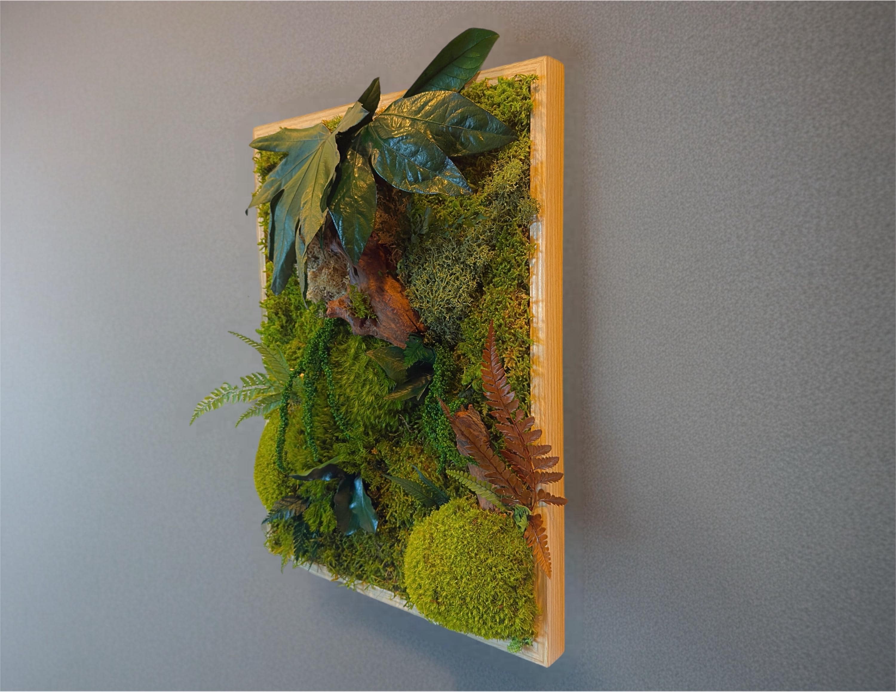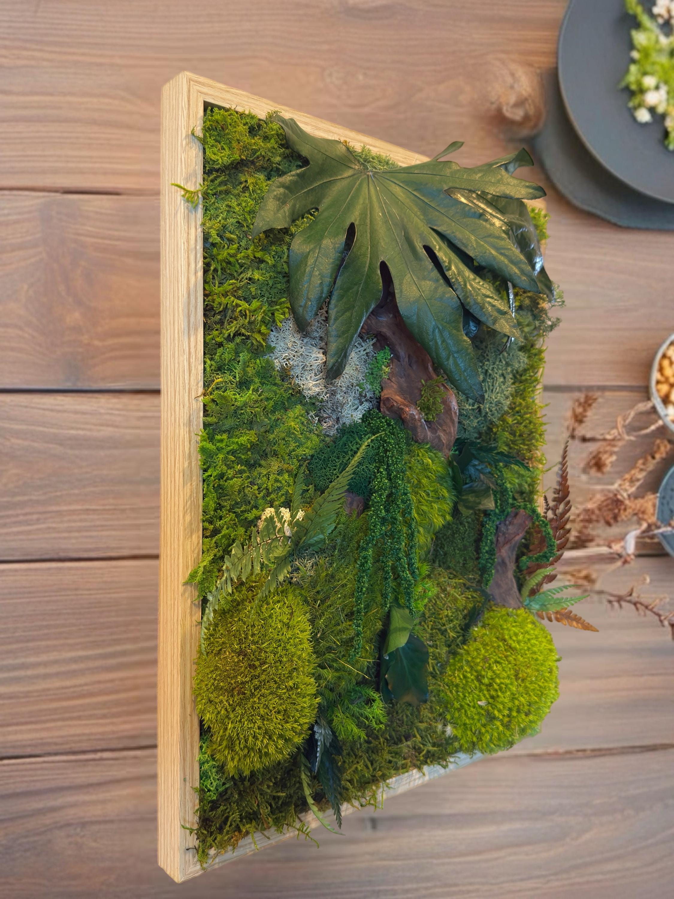 Chaque composition est unique, réalisée à la main avec des éléments naturels soigneusement sélectionnés : mousses bombées et plates, fougères, feuillages stabilisés et morceaux de bois décoratifs.