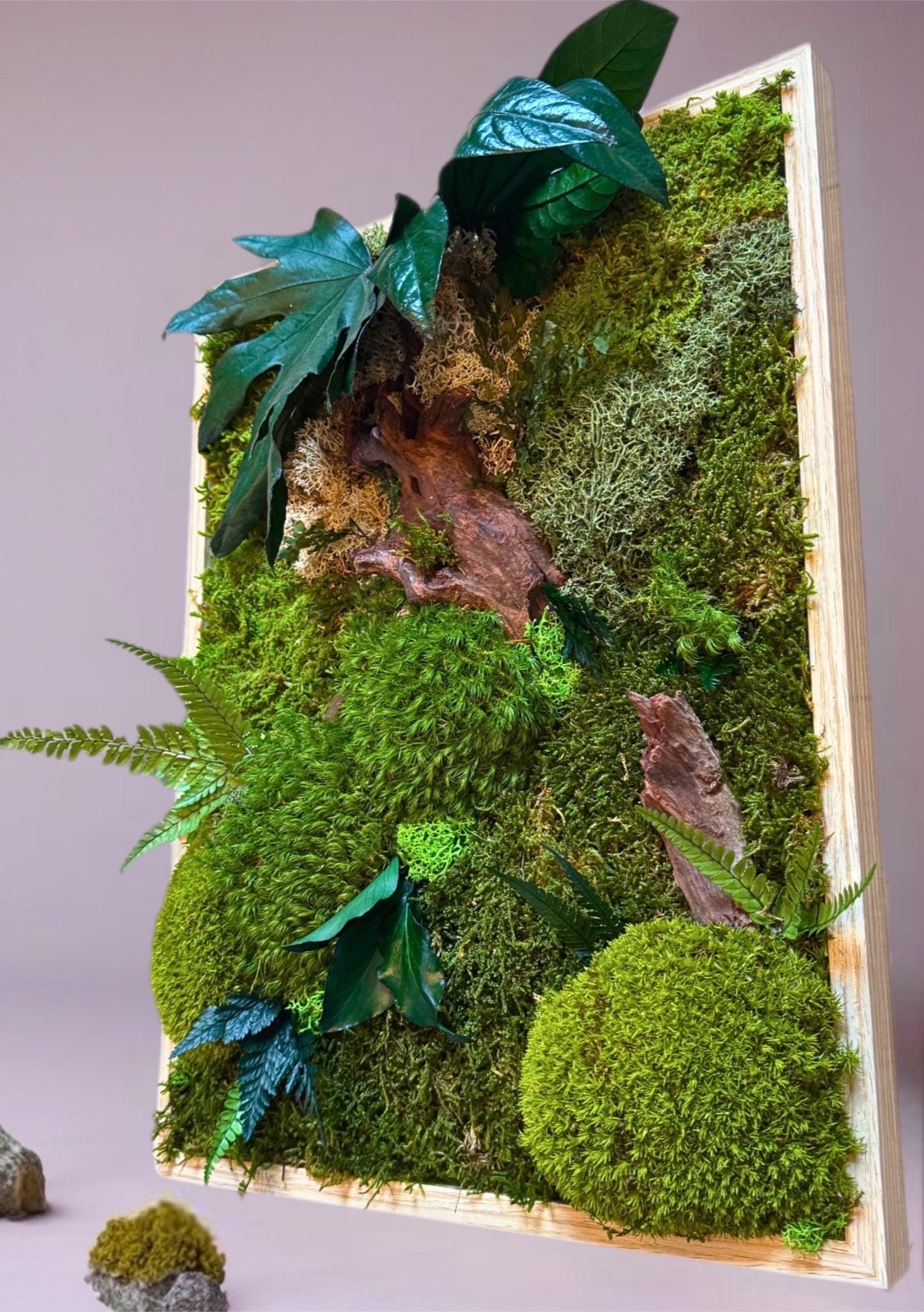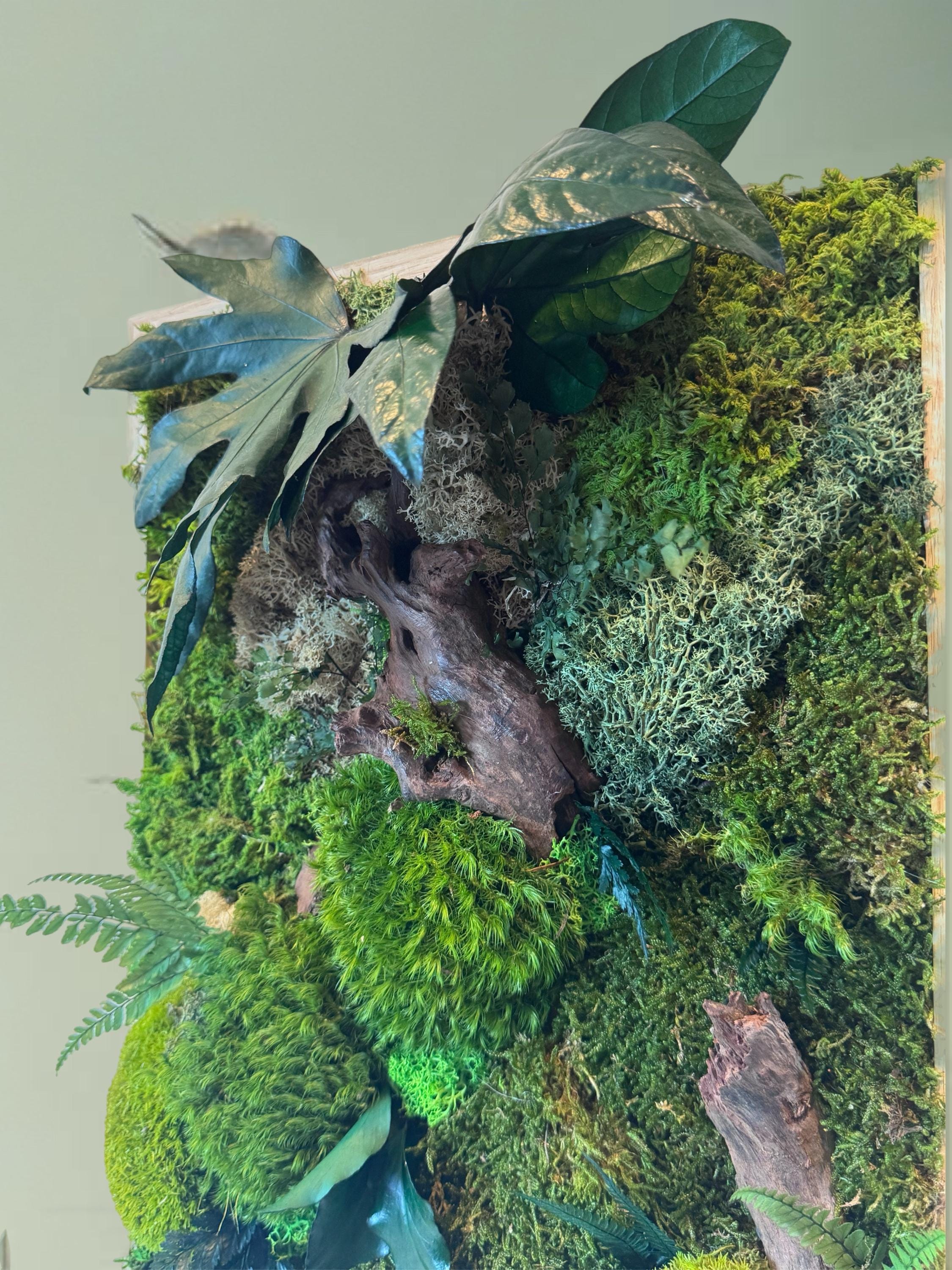 Chaque composition est unique, réalisée à la main avec des éléments naturels soigneusement sélectionnés : mousses bombées et plates, fougères, feuillages stabilisés et morceaux de bois décoratifs.