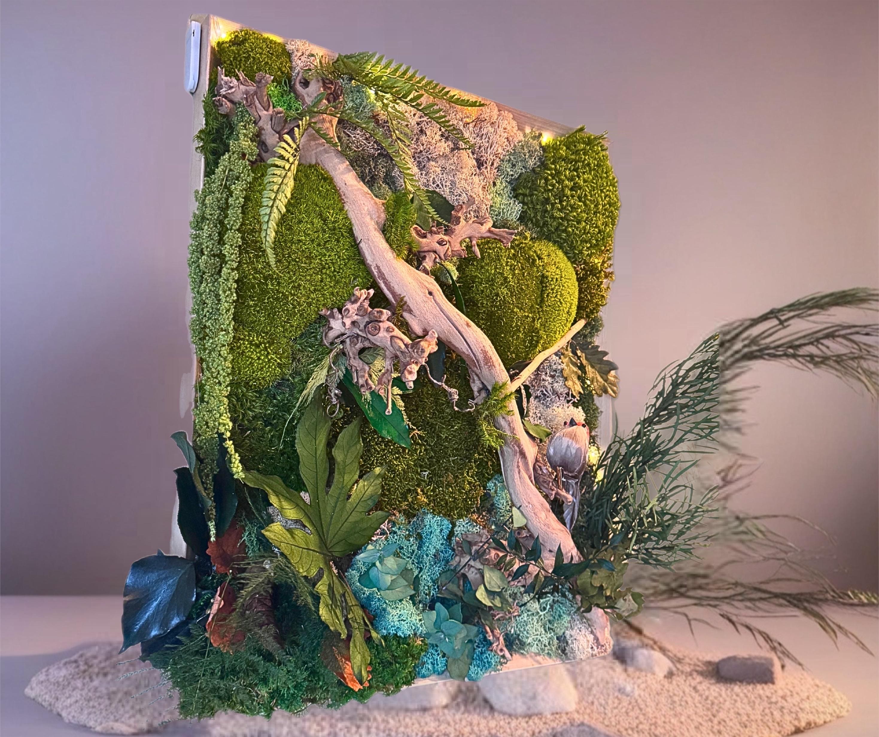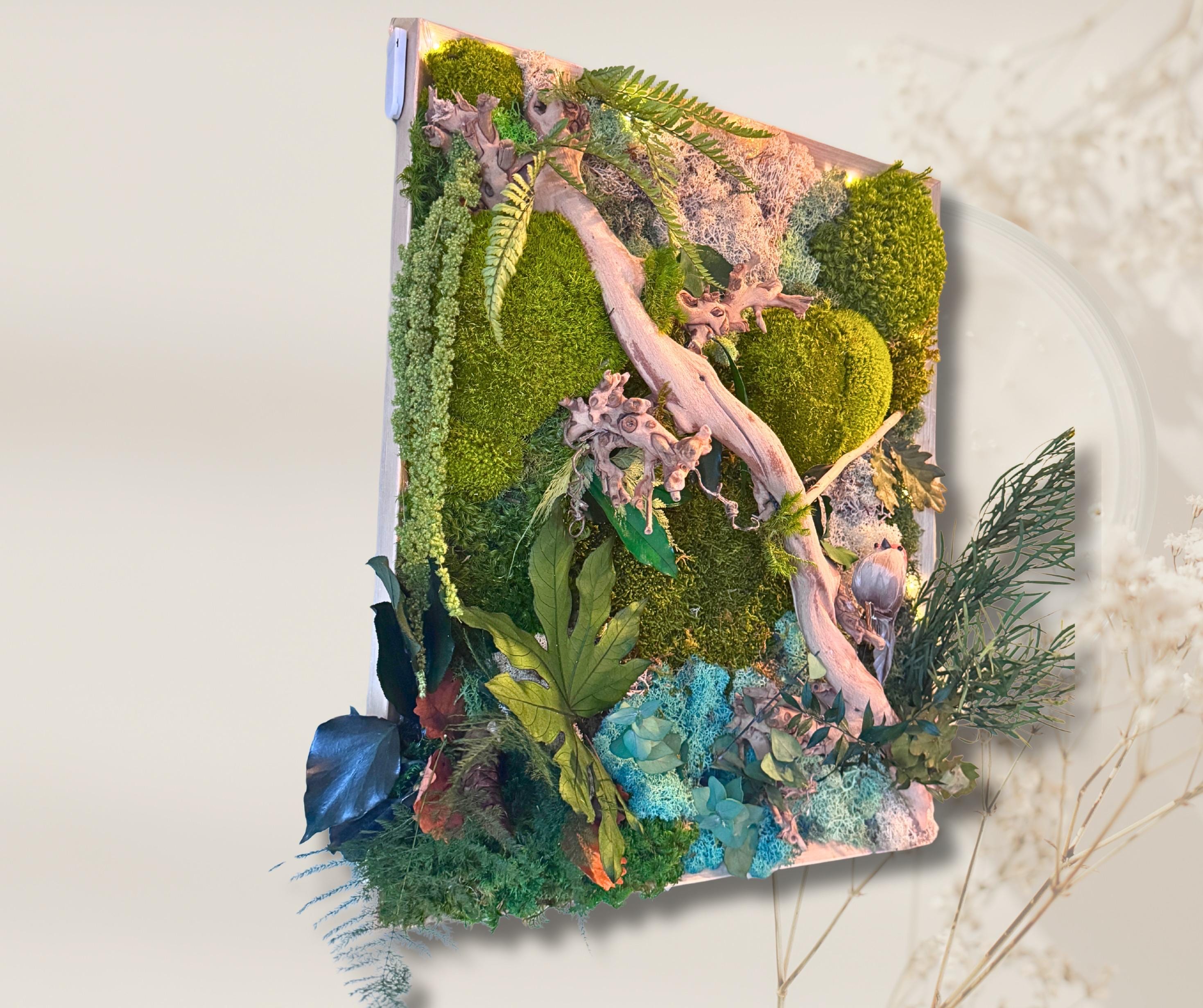 • Réalisé avec des végétaux stabilisés 100% naturels (mousses, fougères, feuillages, branches)
