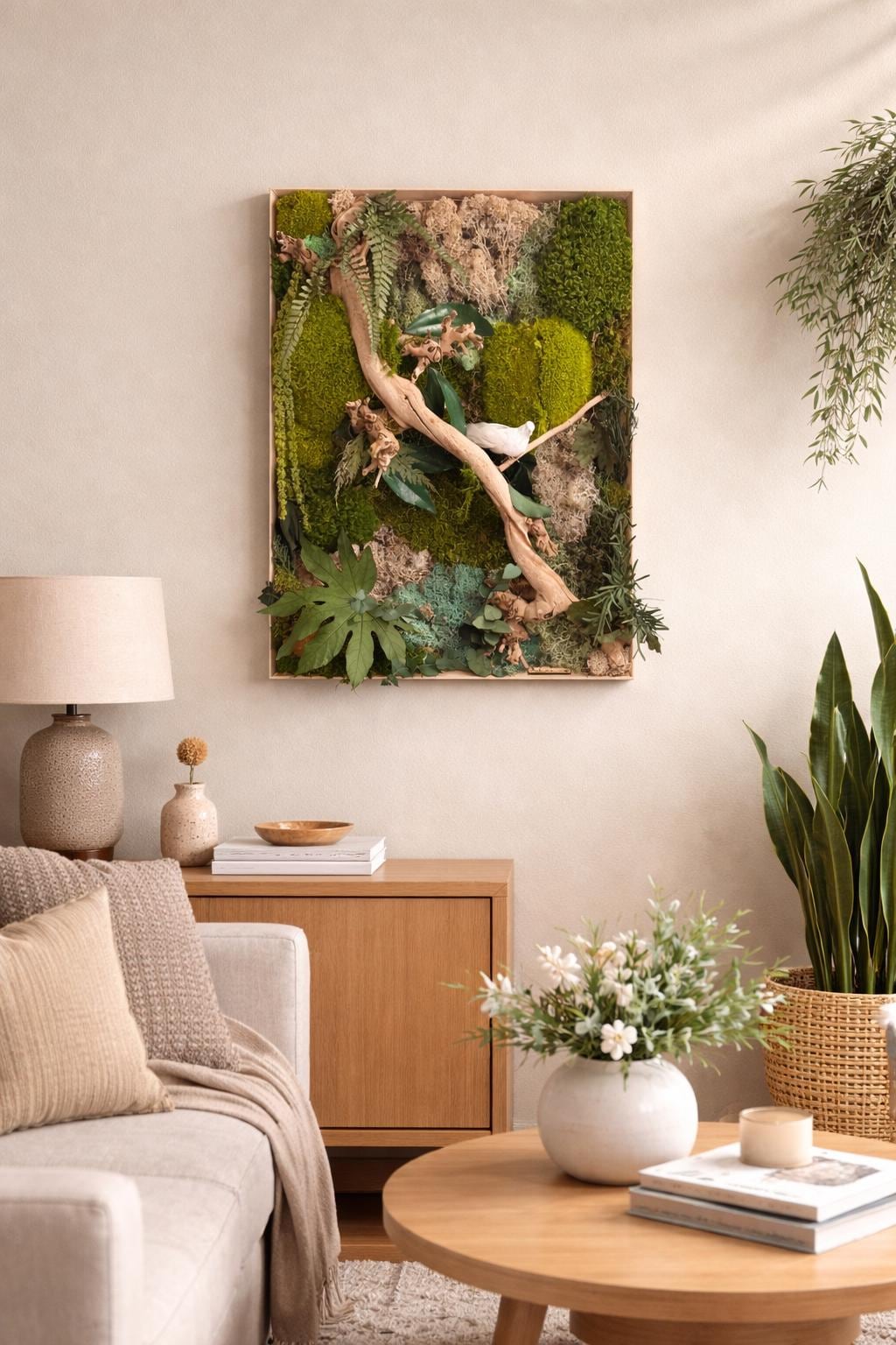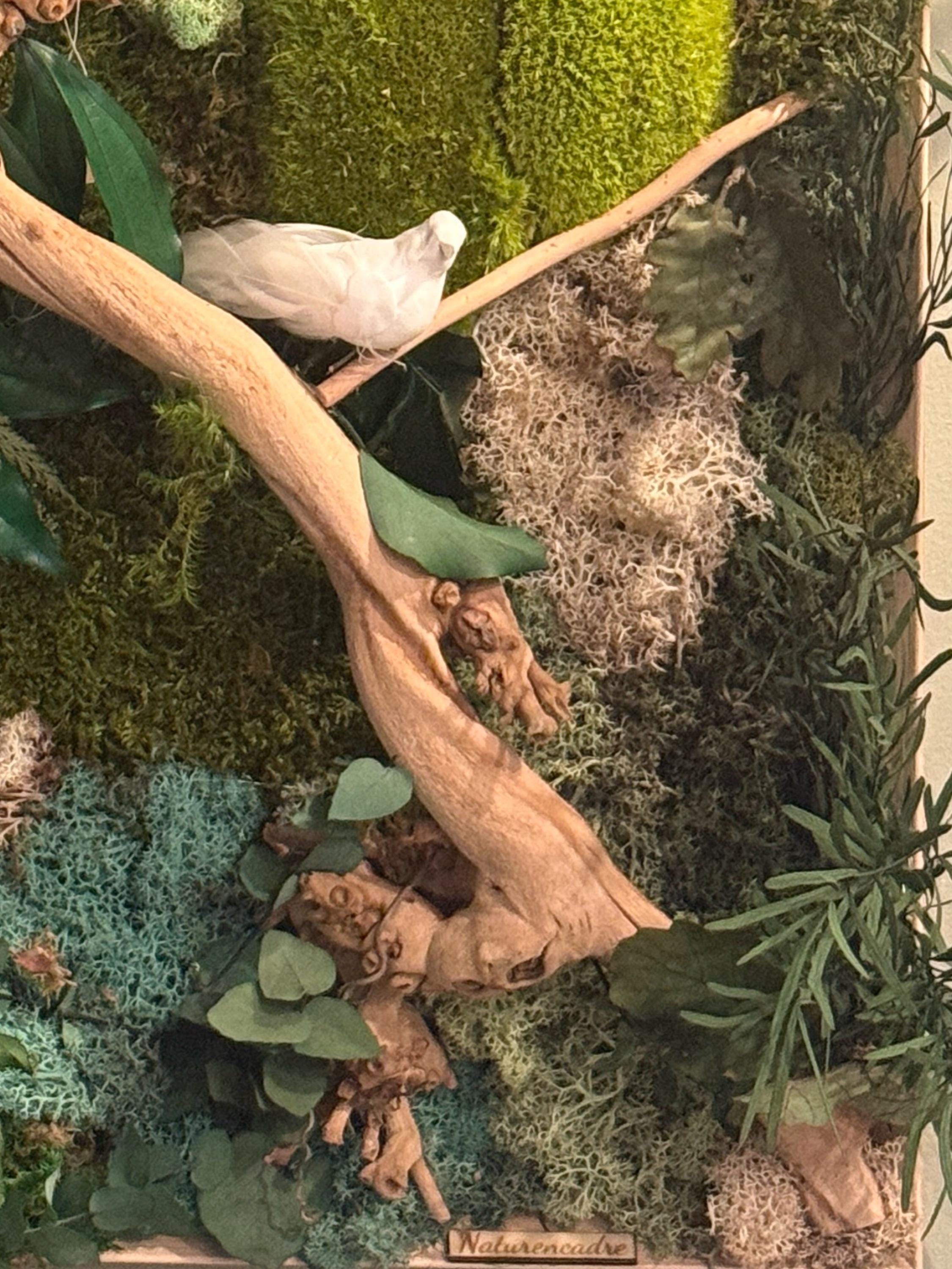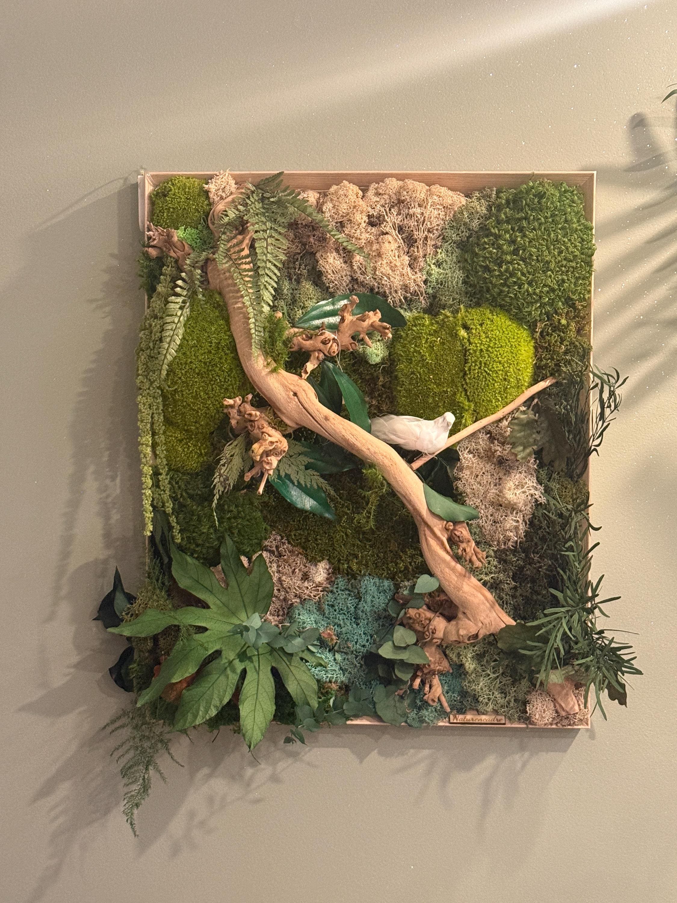 Apportez une touche de verdure et de lumière à votre intérieur avec ce cadre végétal stabilisé unique, créé artisanalement. Conçu avec des mousses stabilisées , feuillages et bois flotté, il offre un décor naturel durable, sans aucun entretien.
