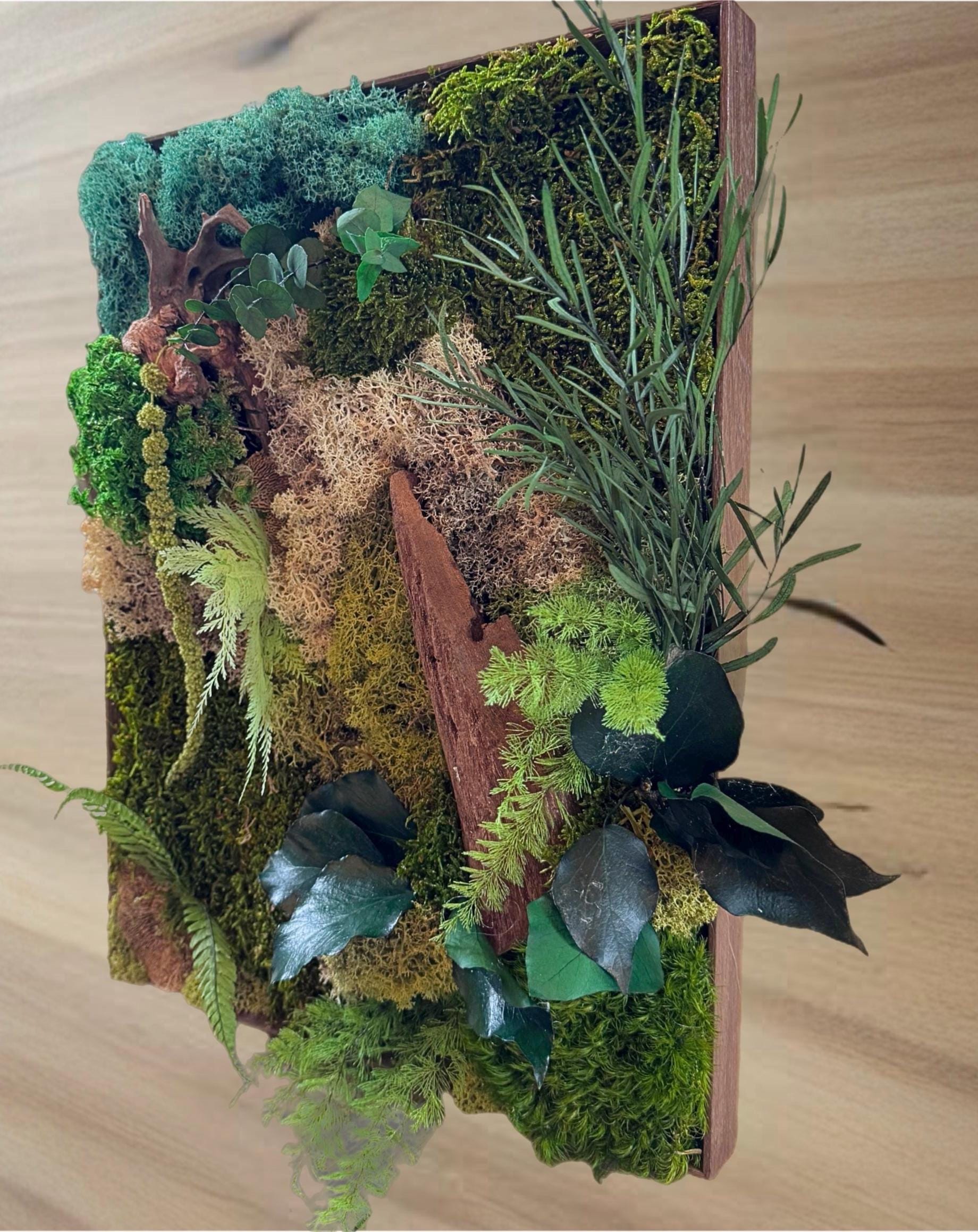 Apportez une touche de nature dans votre intérieur avec ce cadre végétal en mousse stabilisee naturelle fait main, inspiré d’une forêt luxuriante.