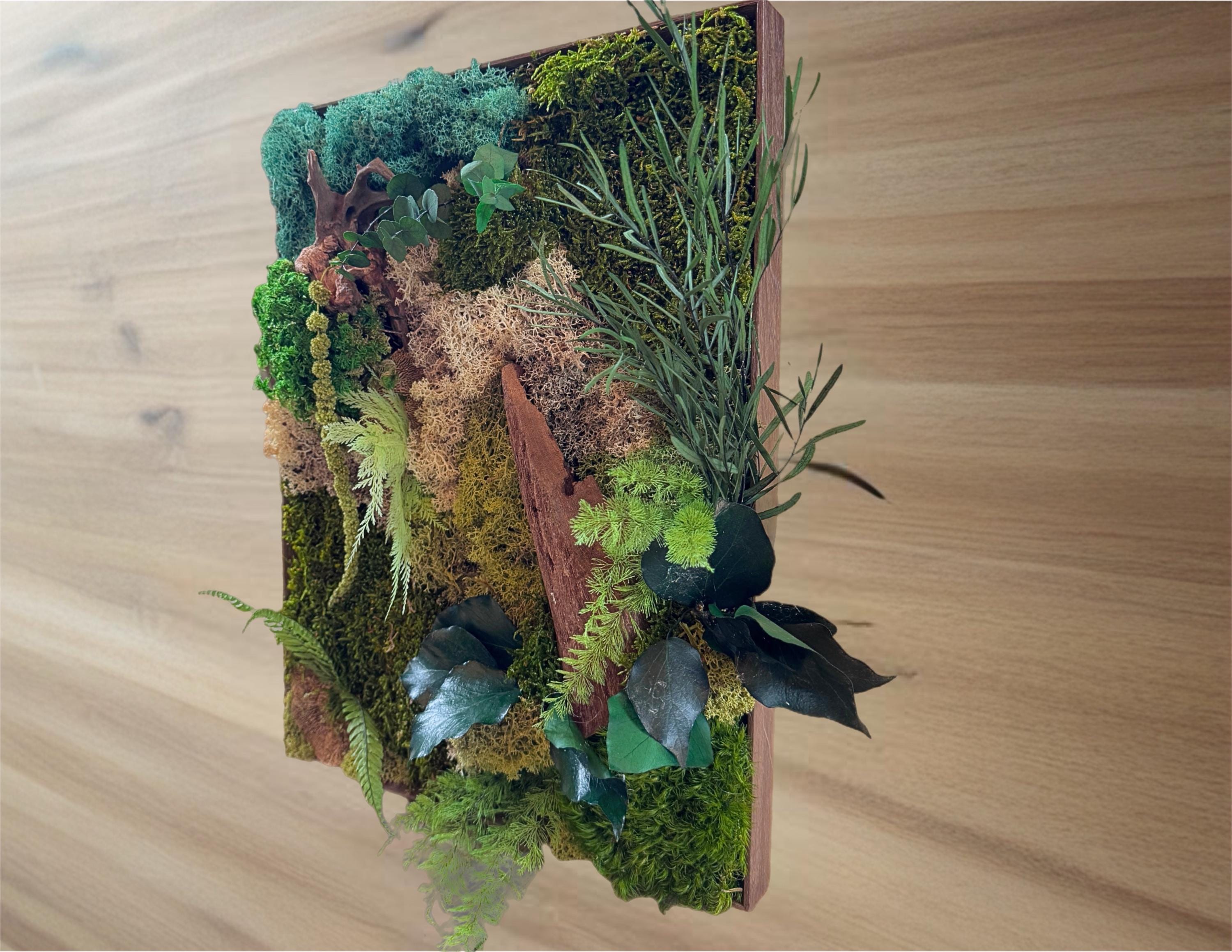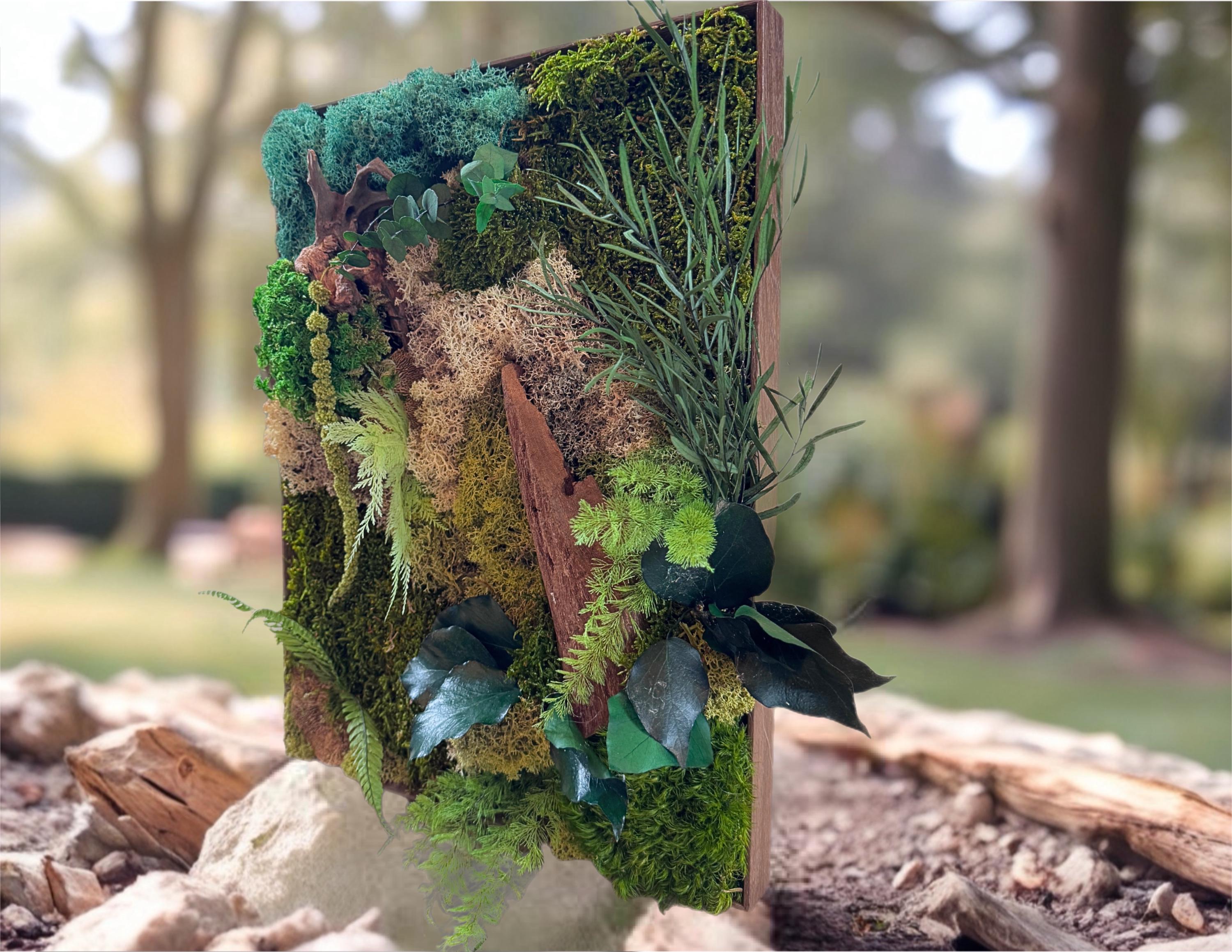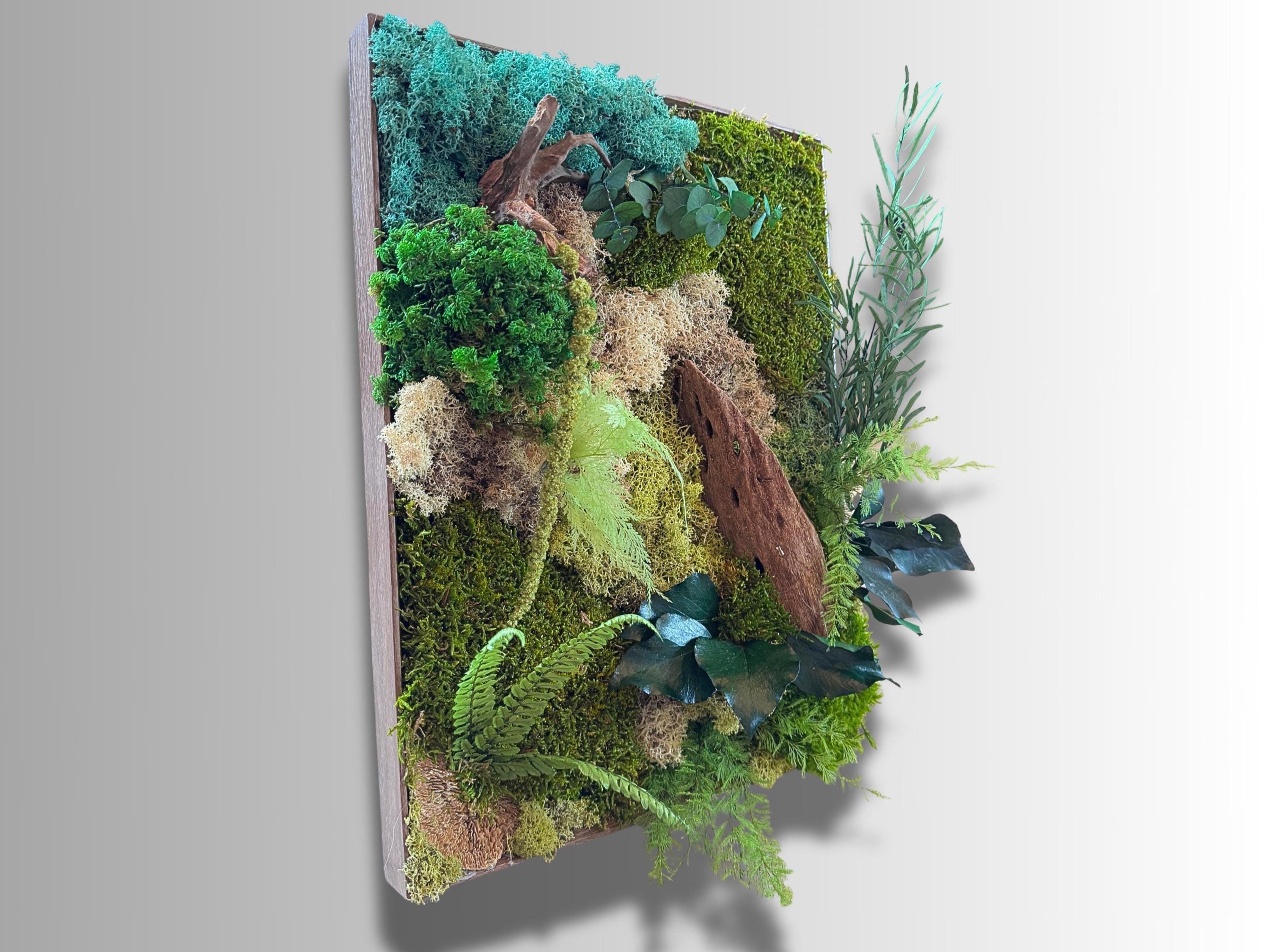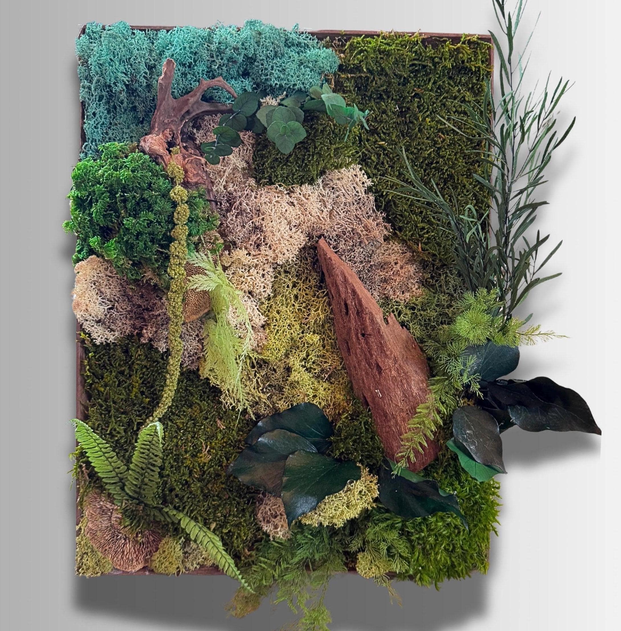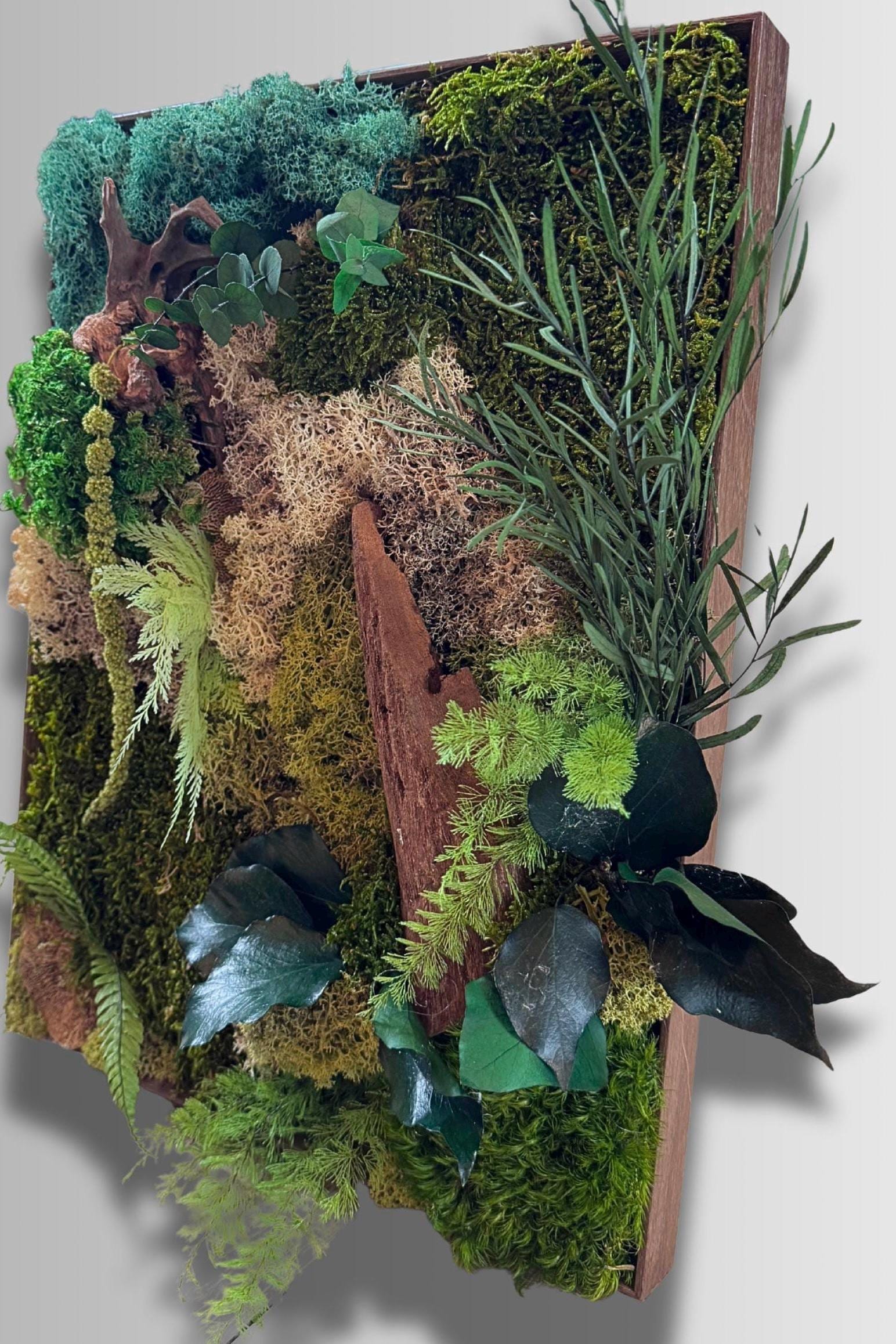 Apportez une touche de nature dans votre intérieur avec ce cadre végétal en mousse stabilisee naturelle fait main, inspiré d’une forêt luxuriante.