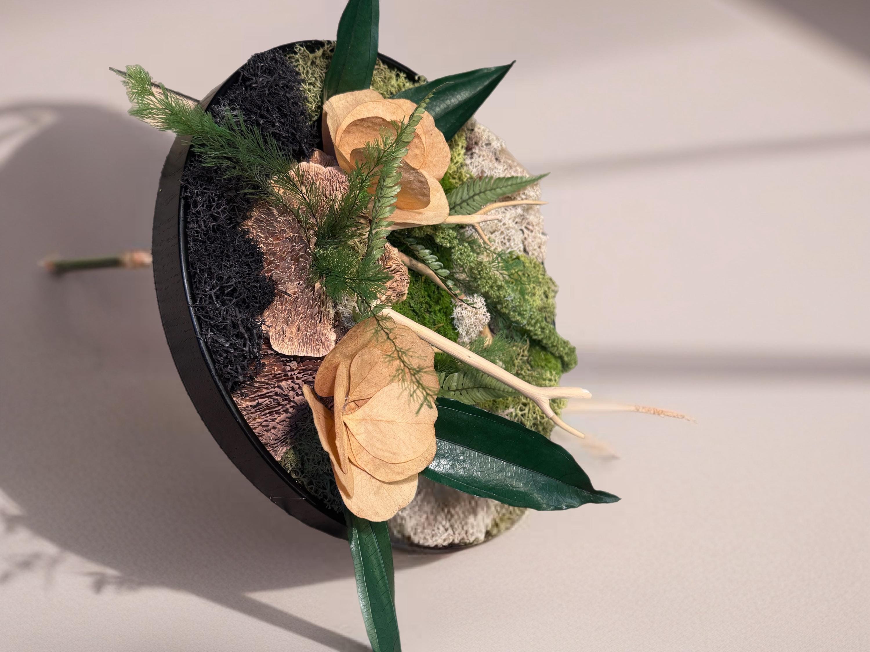 Chaque création est unique : les végétaux sont naturels et stabilisés (technique écologique qui fige leur aspect frais et souple sans entretien).