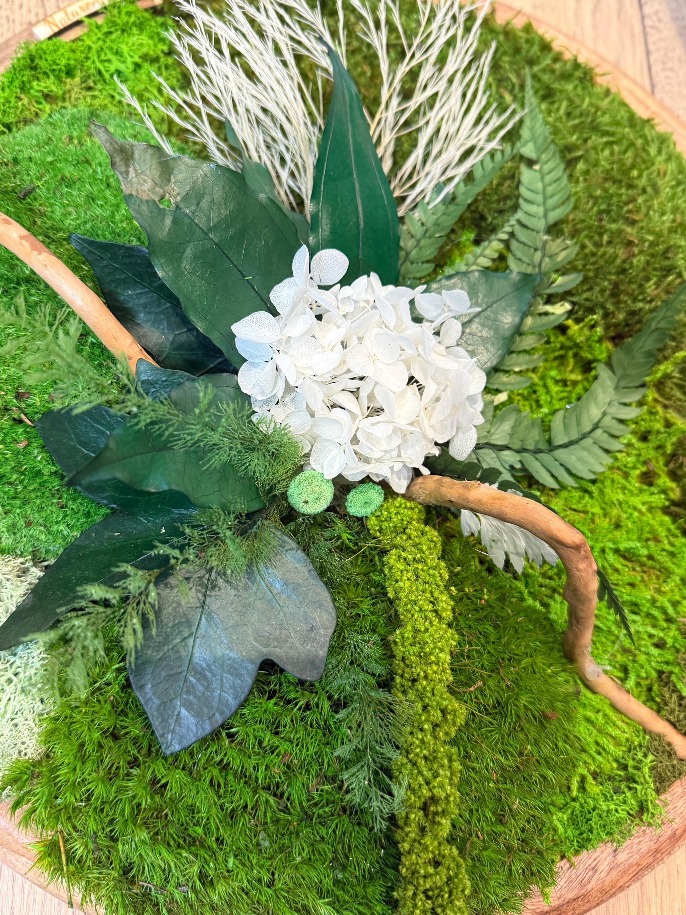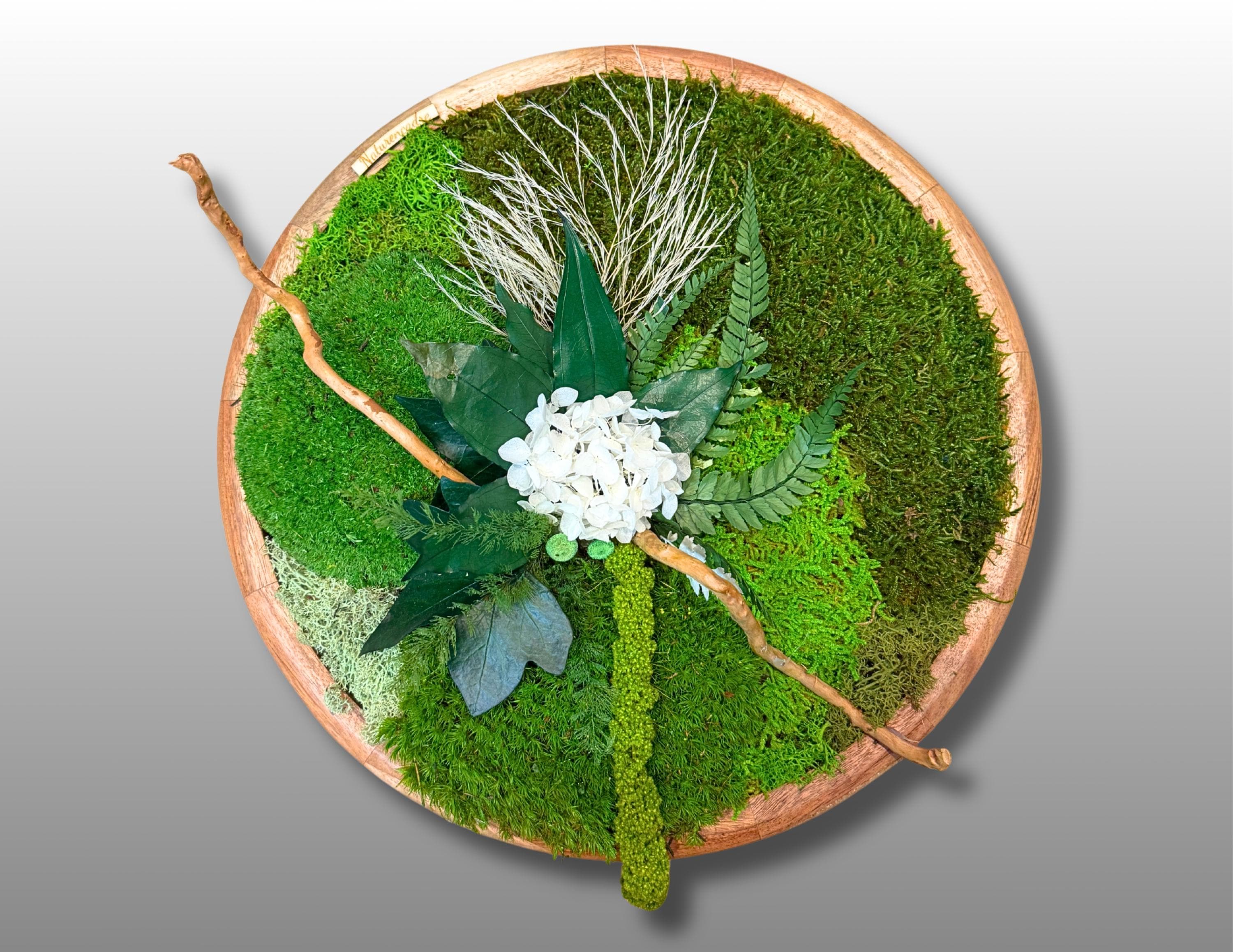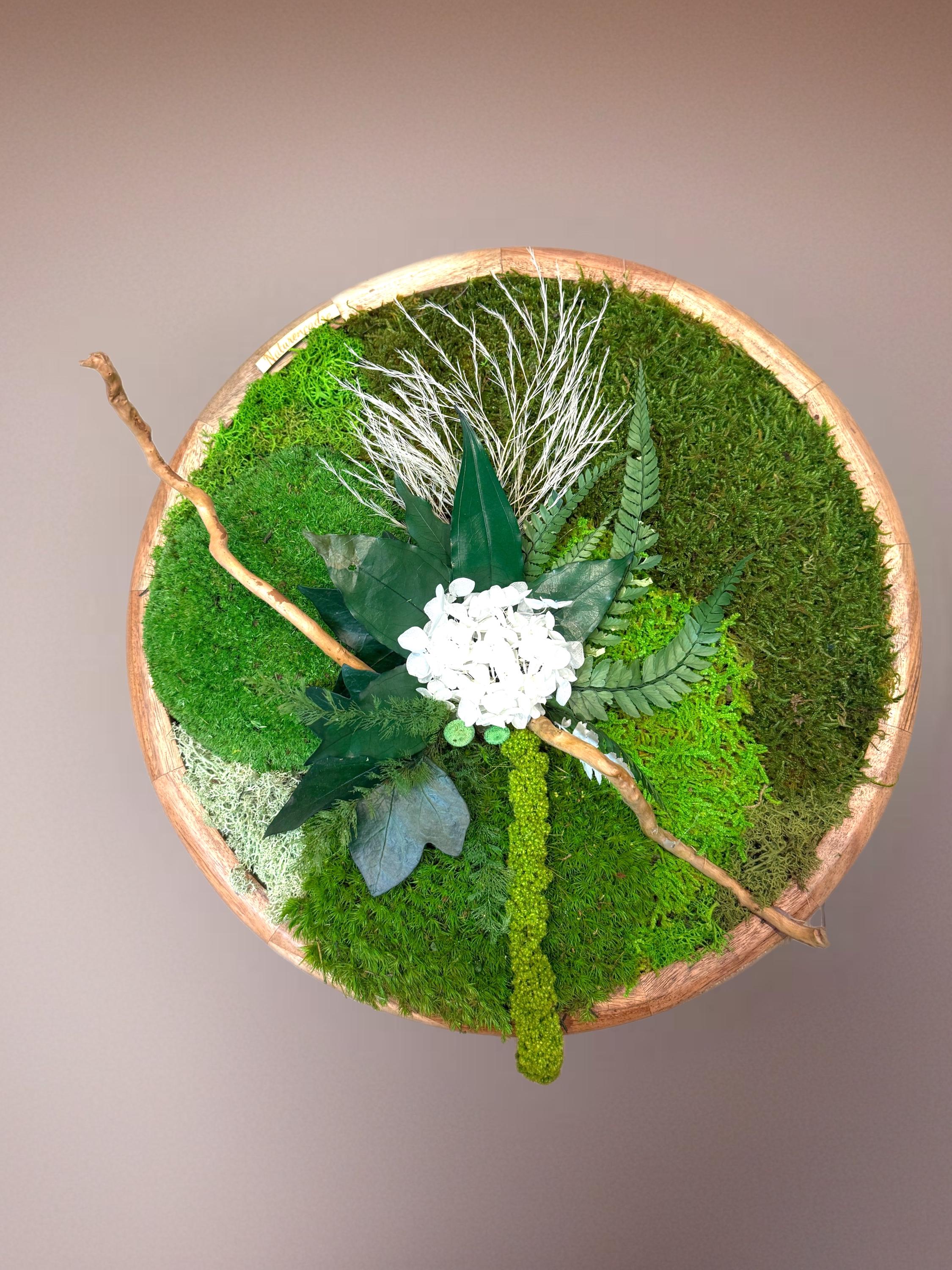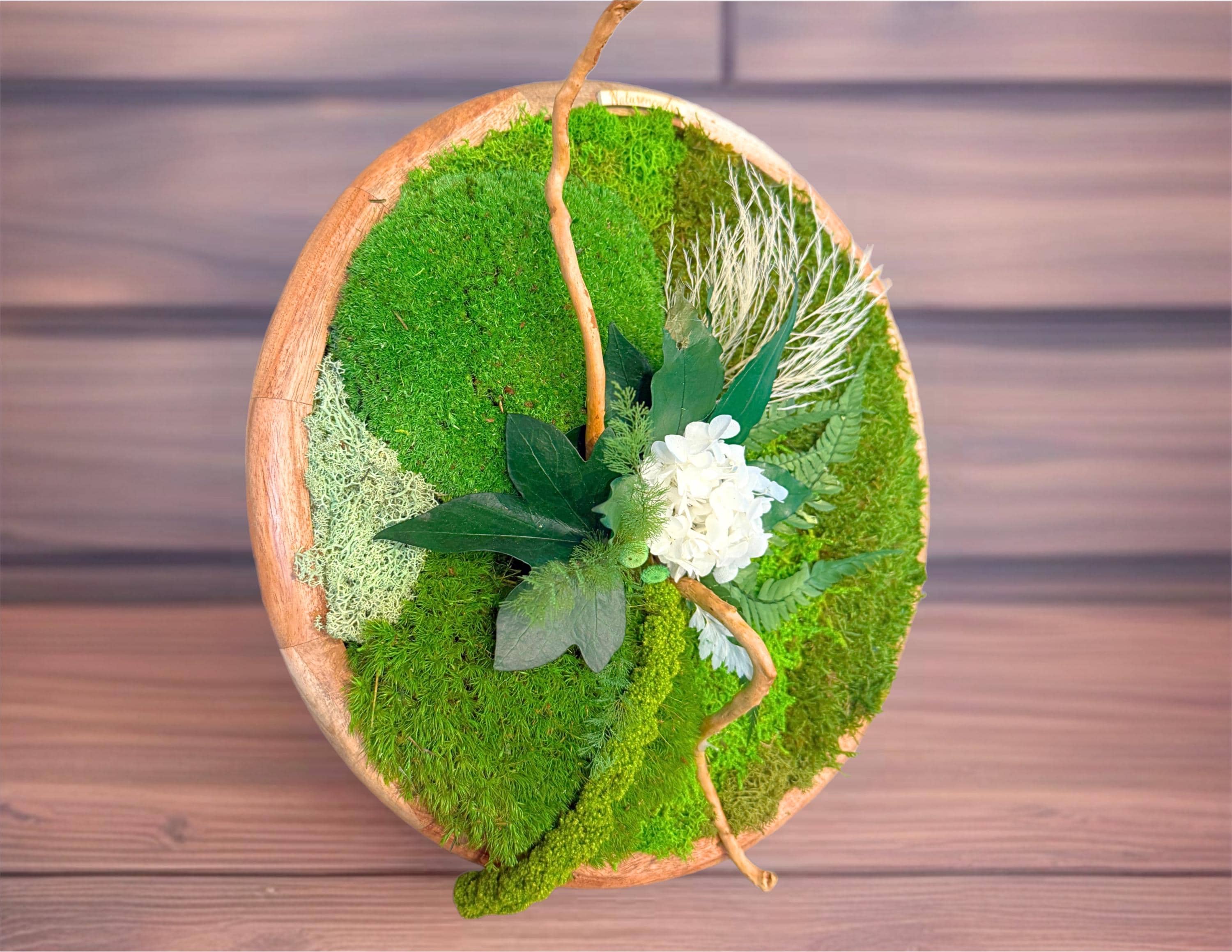 Cadre végétal rond en bois composé de mousses, fougères et feuillages stabilisés, elle allie charme naturel et élégance contemporaine.