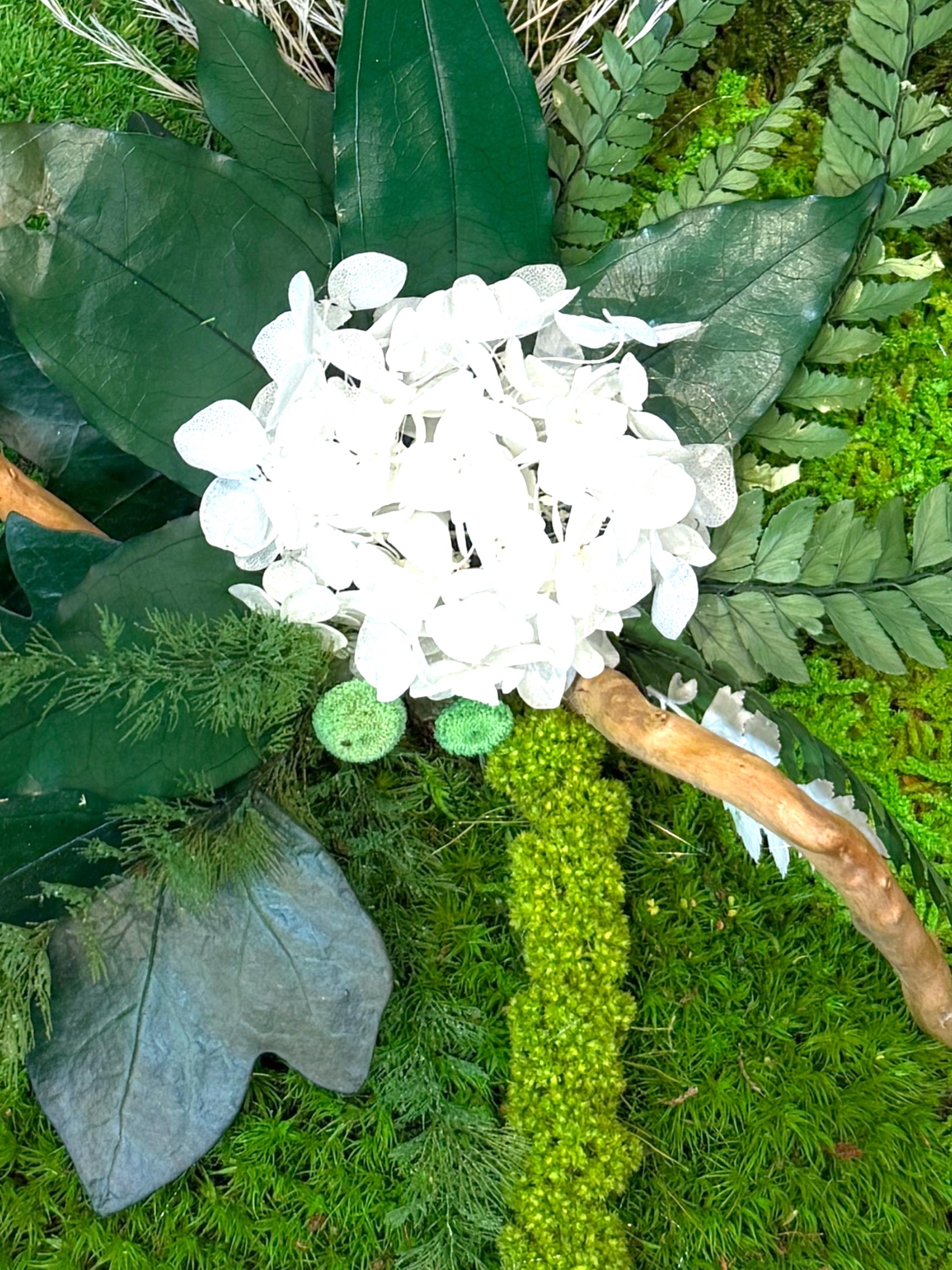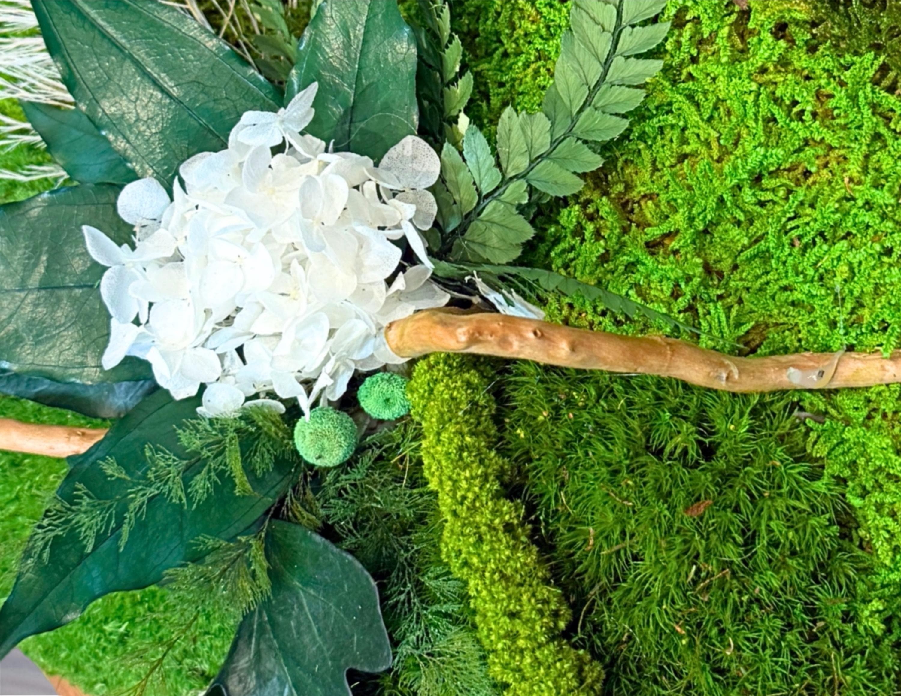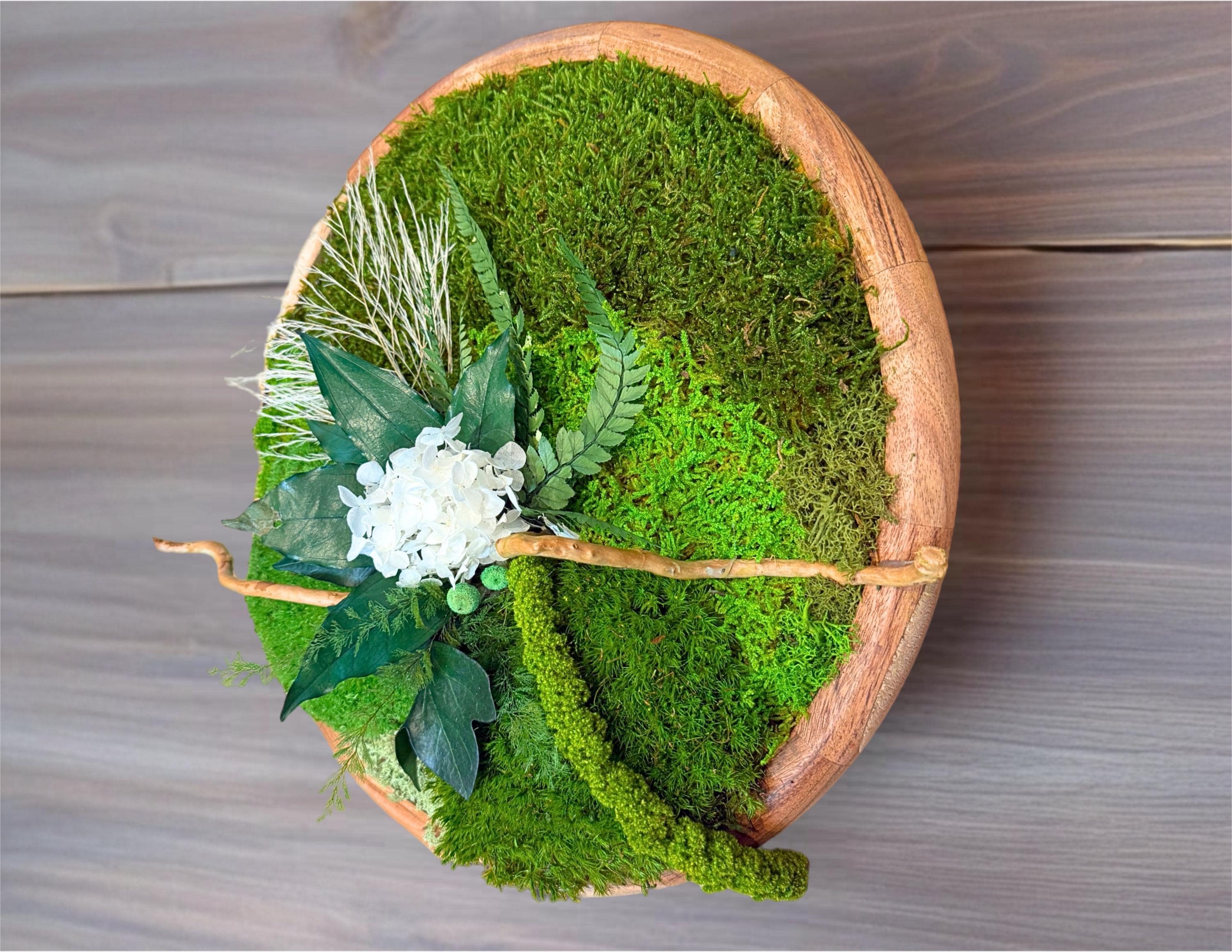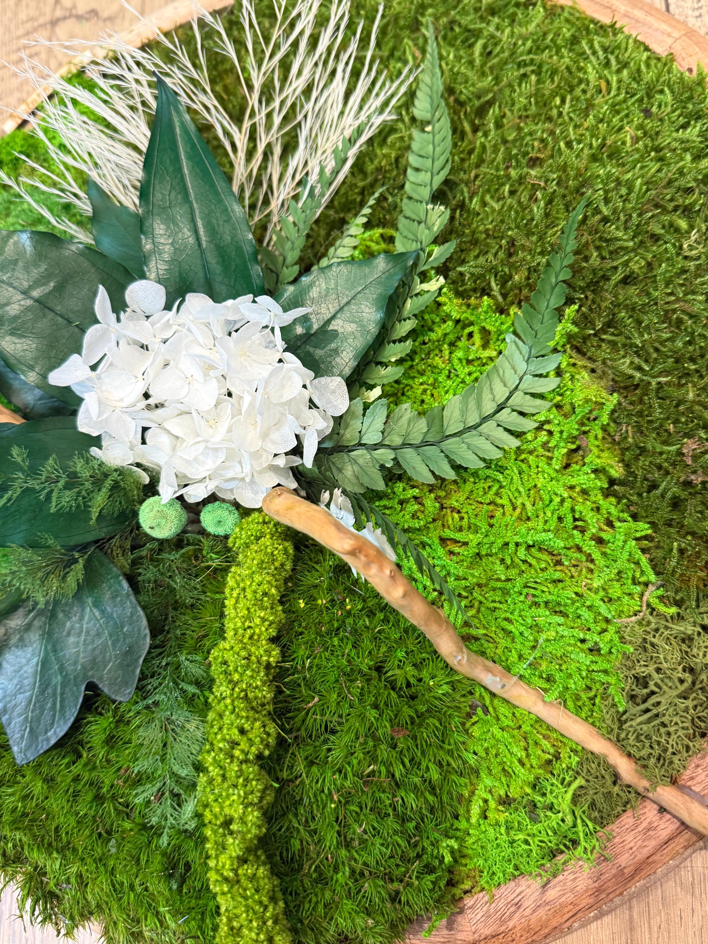 Cadre végétal rond en bois composé de mousses, fougères et feuillages stabilisés, elle allie charme naturel et élégance contemporaine.