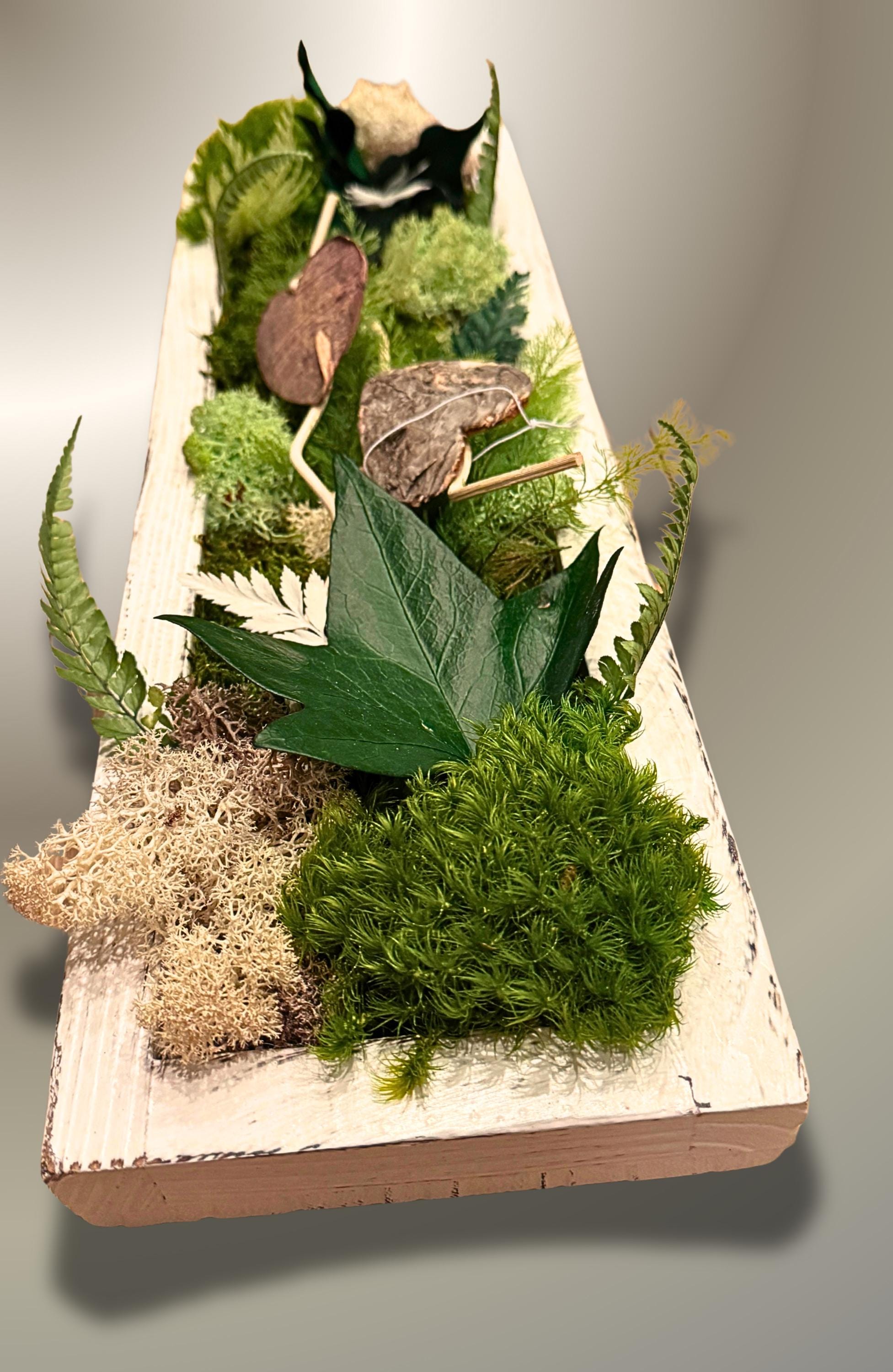 • Composition : mousse plate et boule stabilisée, lichens, fougères, lierre et feuillage stabilisé
