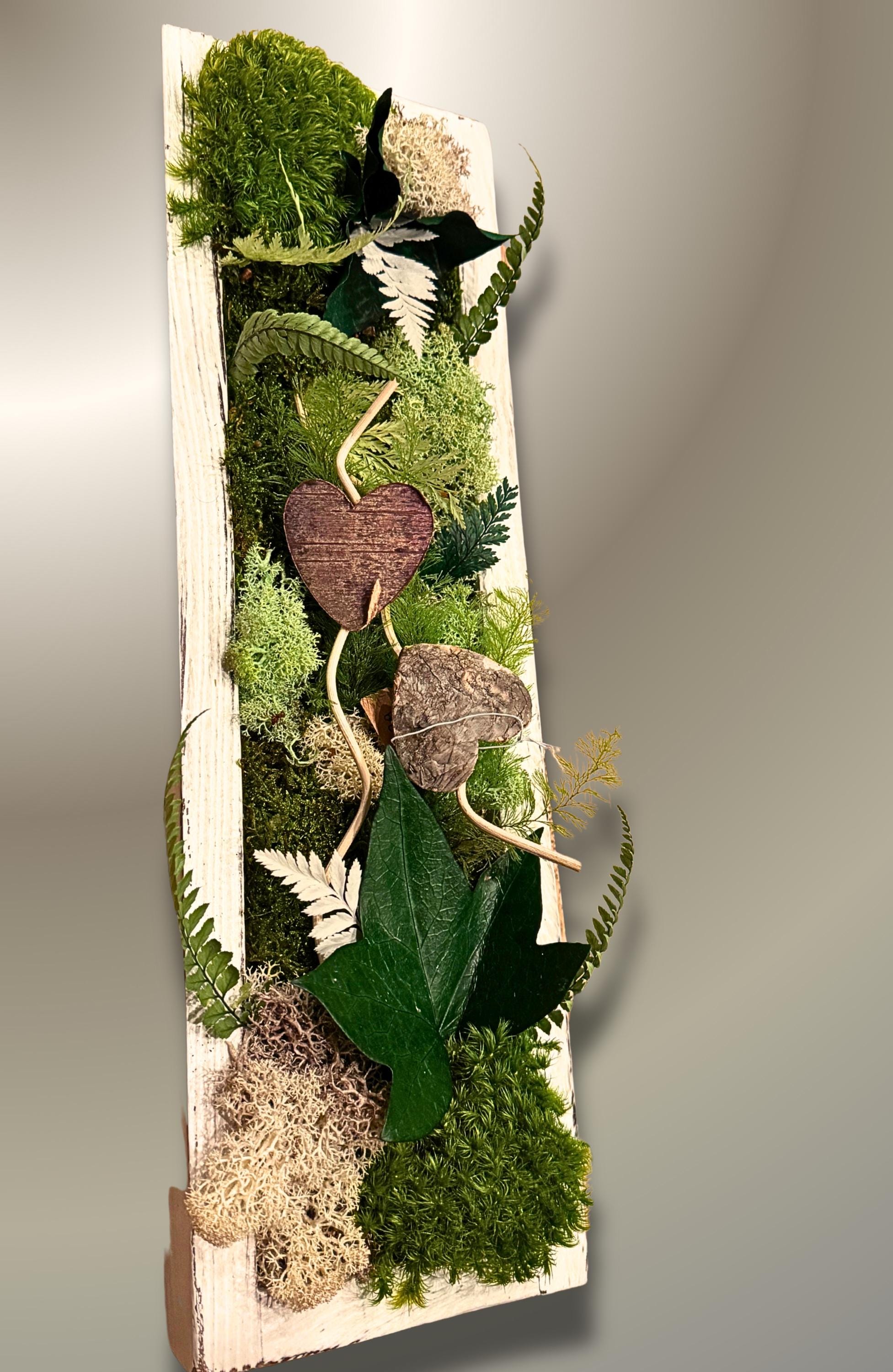 Réalisé dans un cadre en bois patiné blanc, il met en valeur un mélange harmonieux de mousses stabilisées, de feuillages naturels, et de détails en forme de cœur en bois, pour une décoration murale unique et poétique.