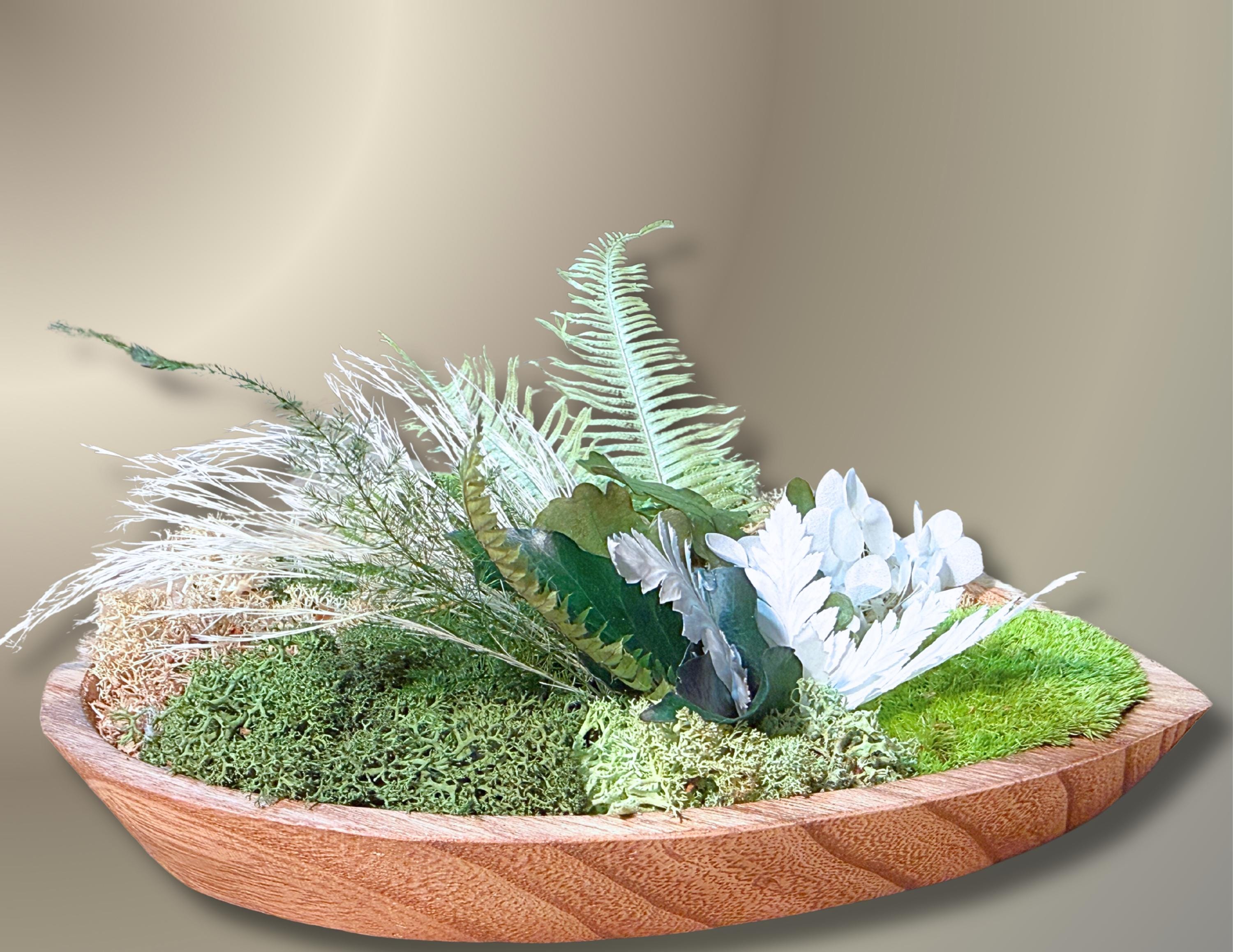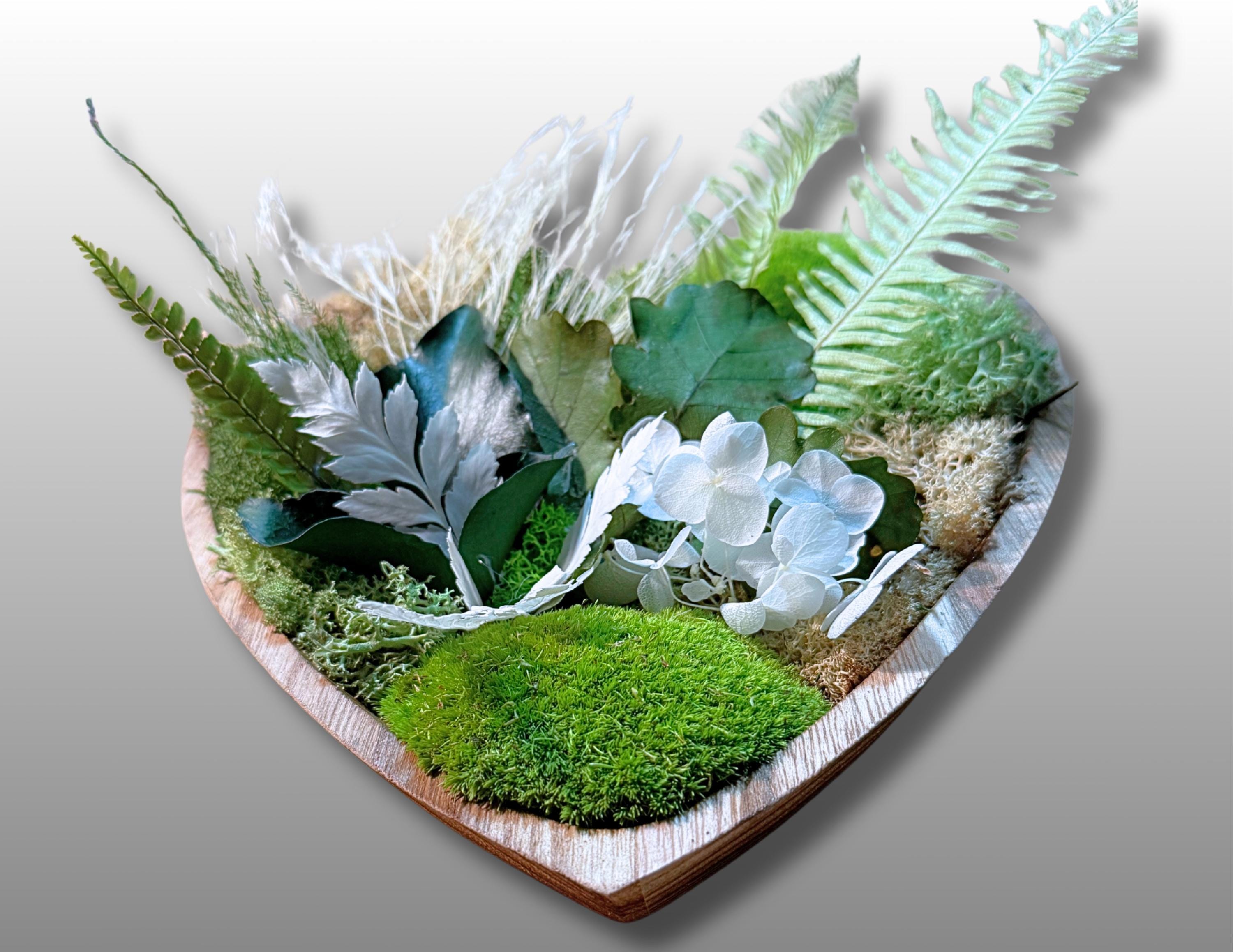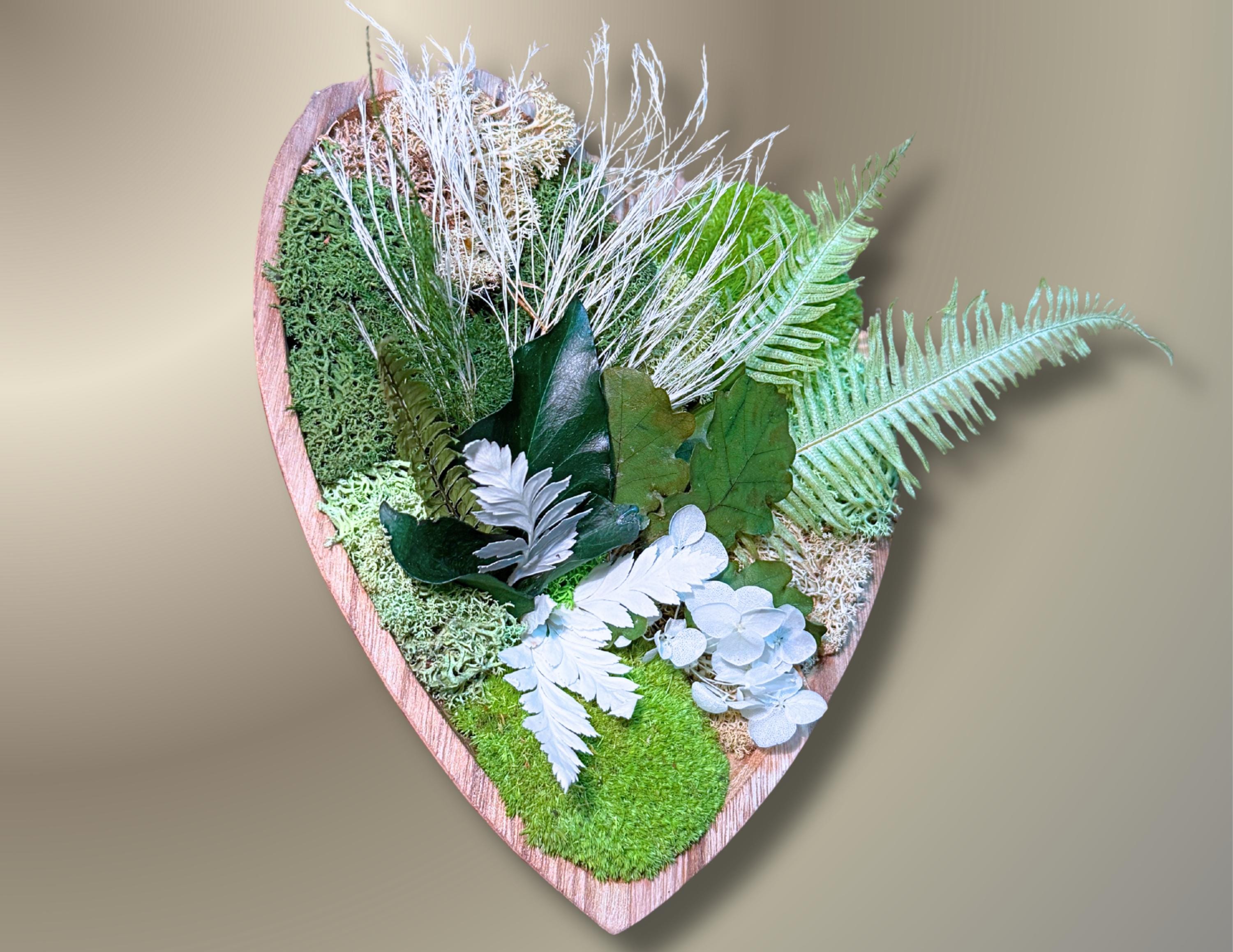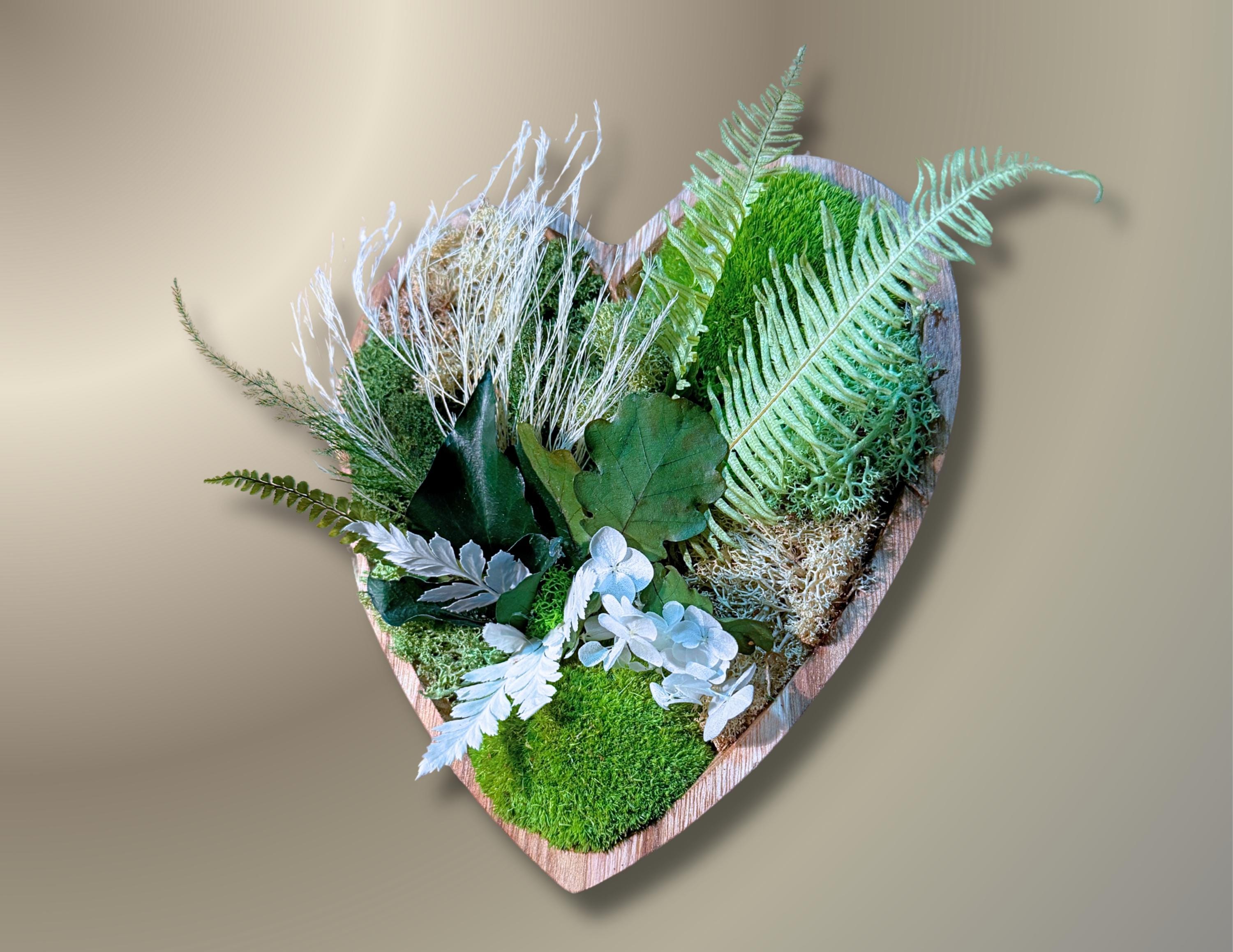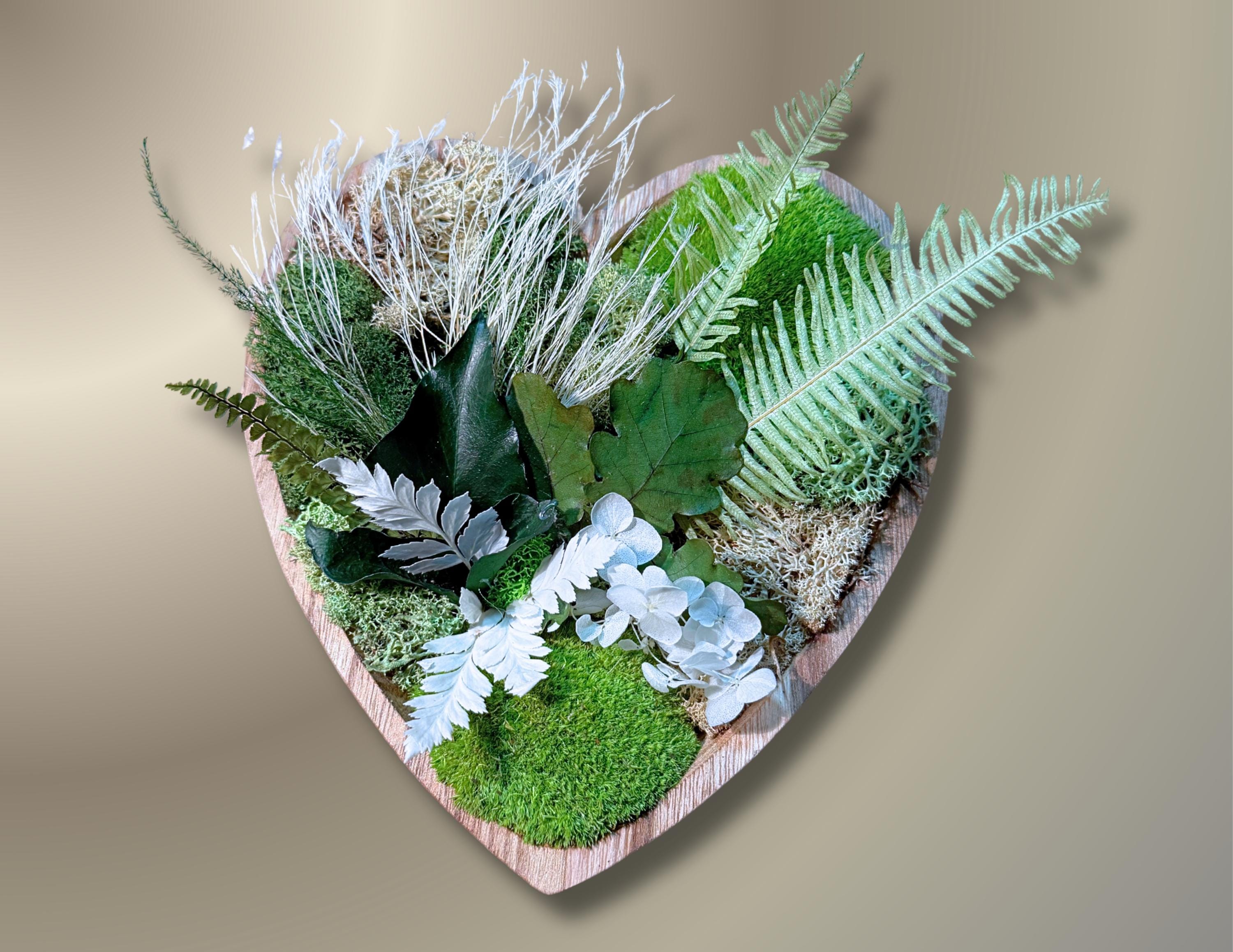 🌱 Composition : mousses variées, fougères, eucalyptus, feuillage stabilisé, montés sur un support en bois en forme de cœur. Chaque pièce est unique grâce aux nuances naturelles et à la disposition artisanale.