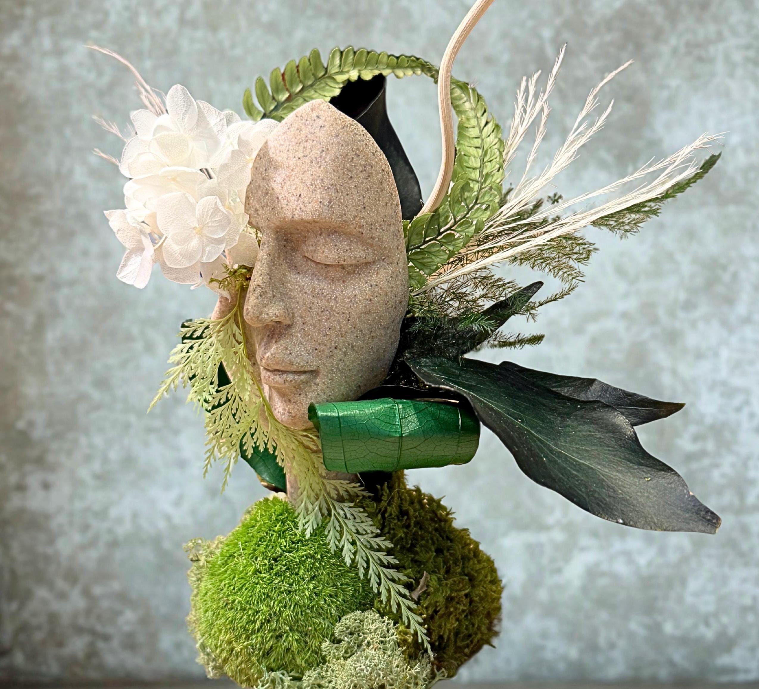 • Matériaux : mousse, fougères et feuillages stabilisés + sculpture de visage