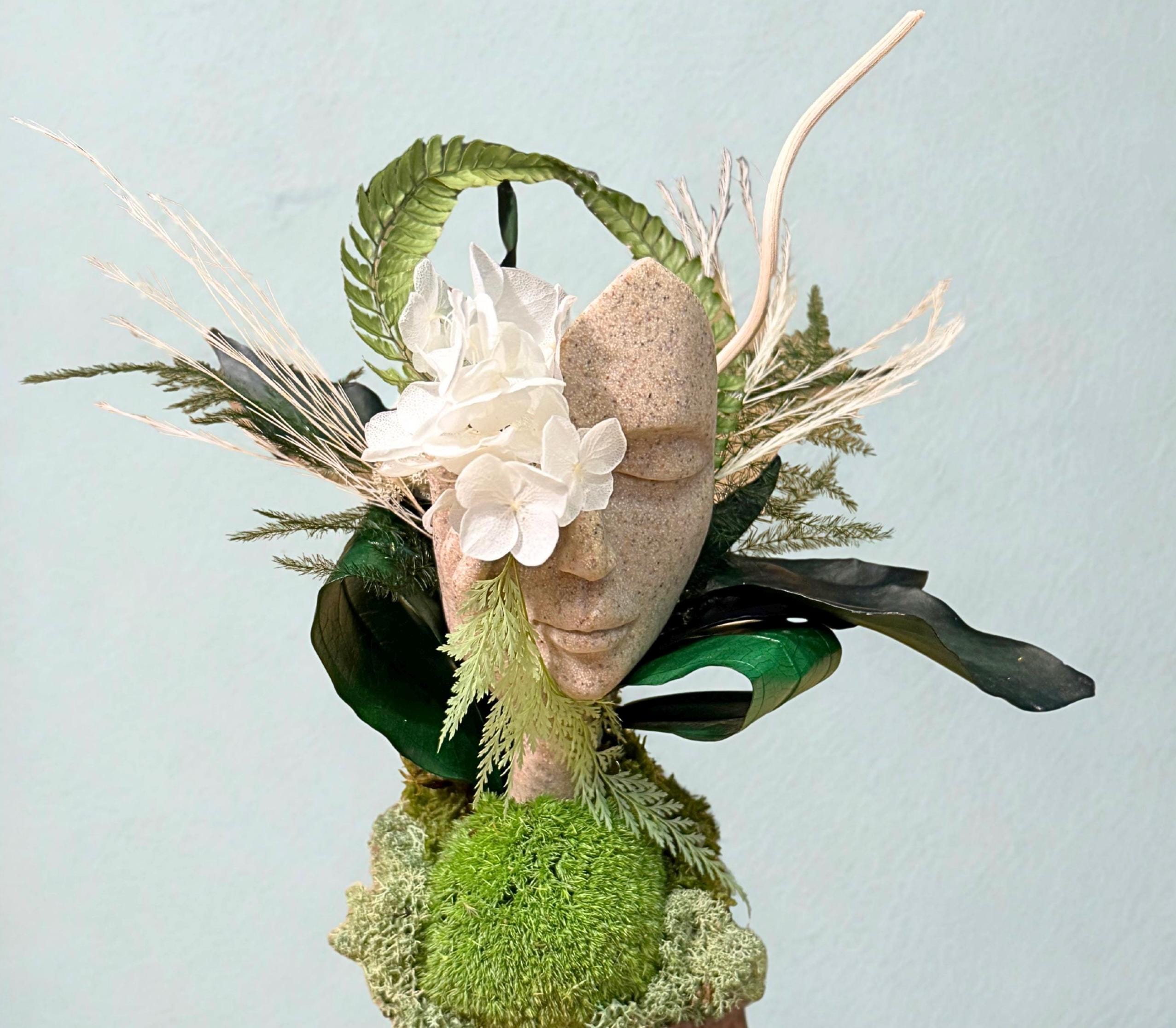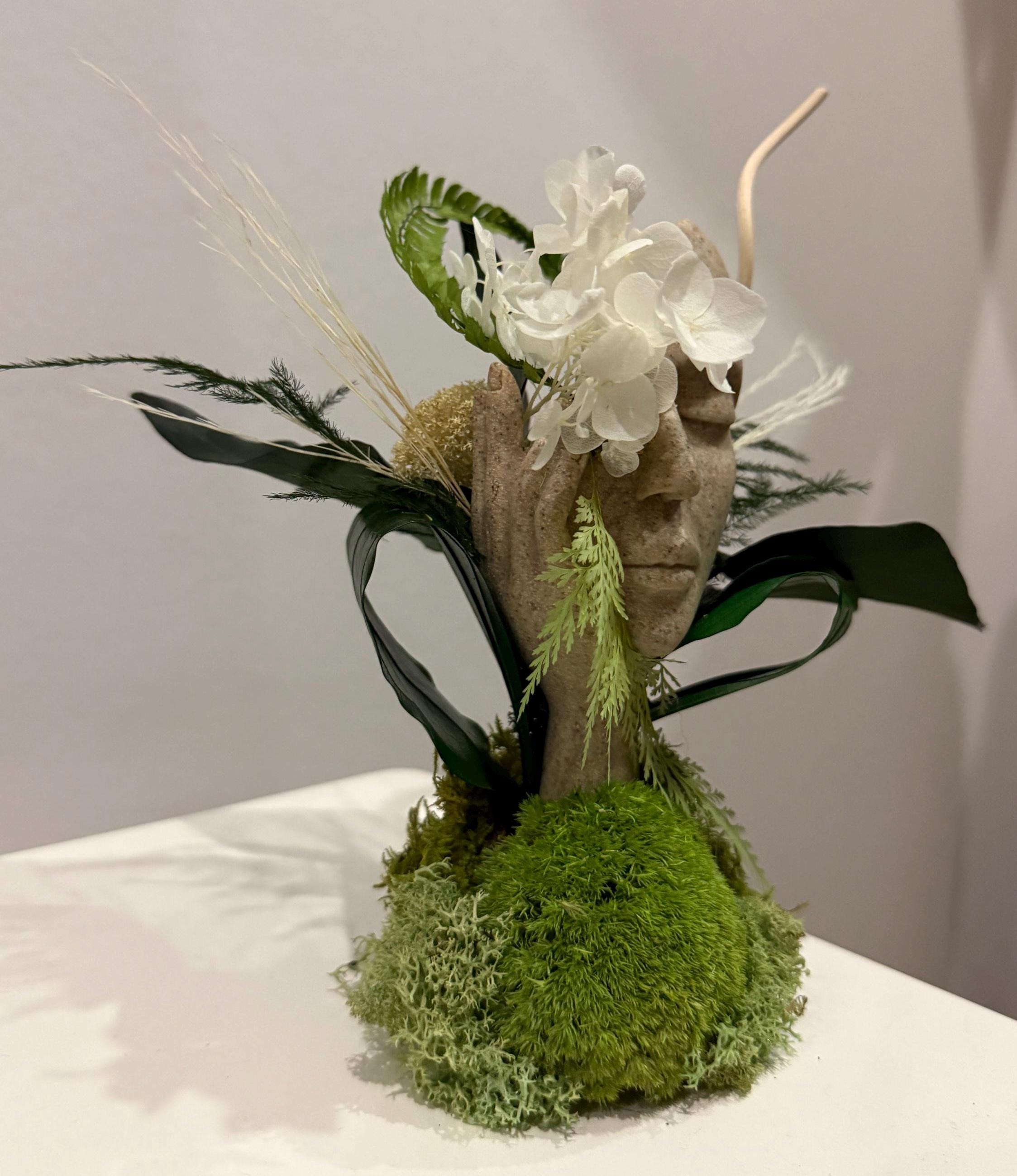 Elle associe une statue de visage contemporaine 🎭 à une composition de mousses et feuillages stabilisés 🌿, pour une décoration qui marie l’art et la nature.