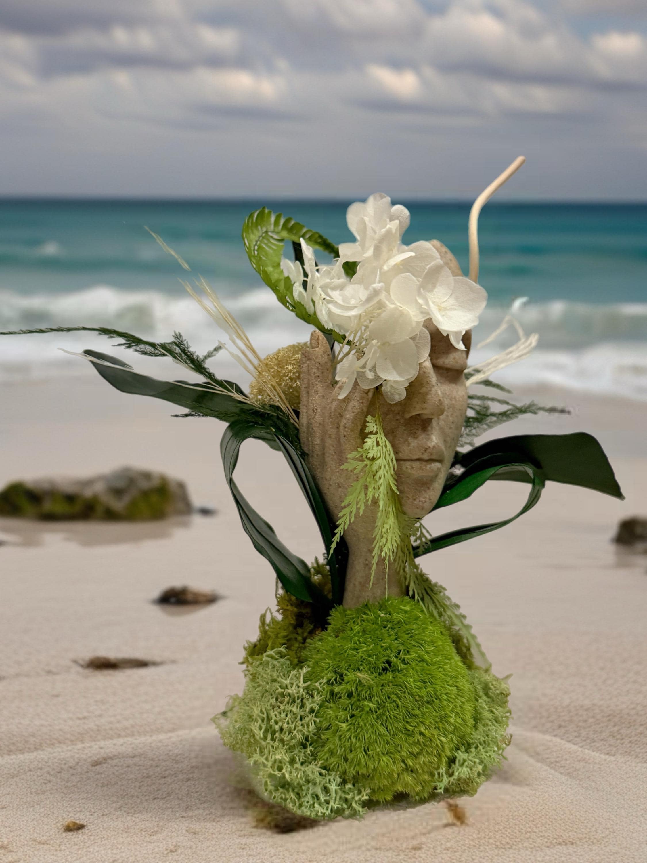 Elle associe une statue de visage contemporaine 🎭 à une composition de mousses et feuillages stabilisés 🌿, pour une décoration qui marie l’art et la nature.