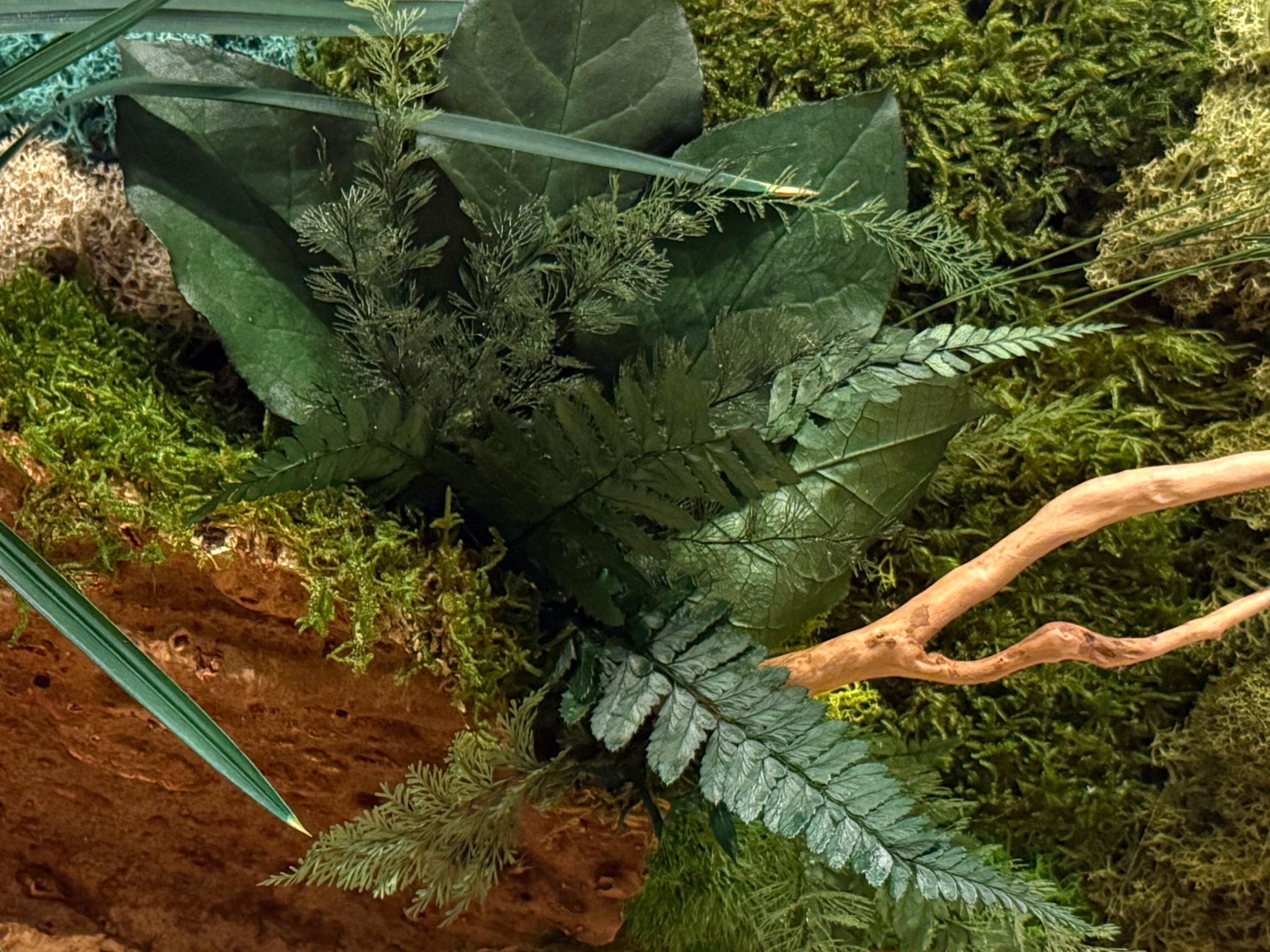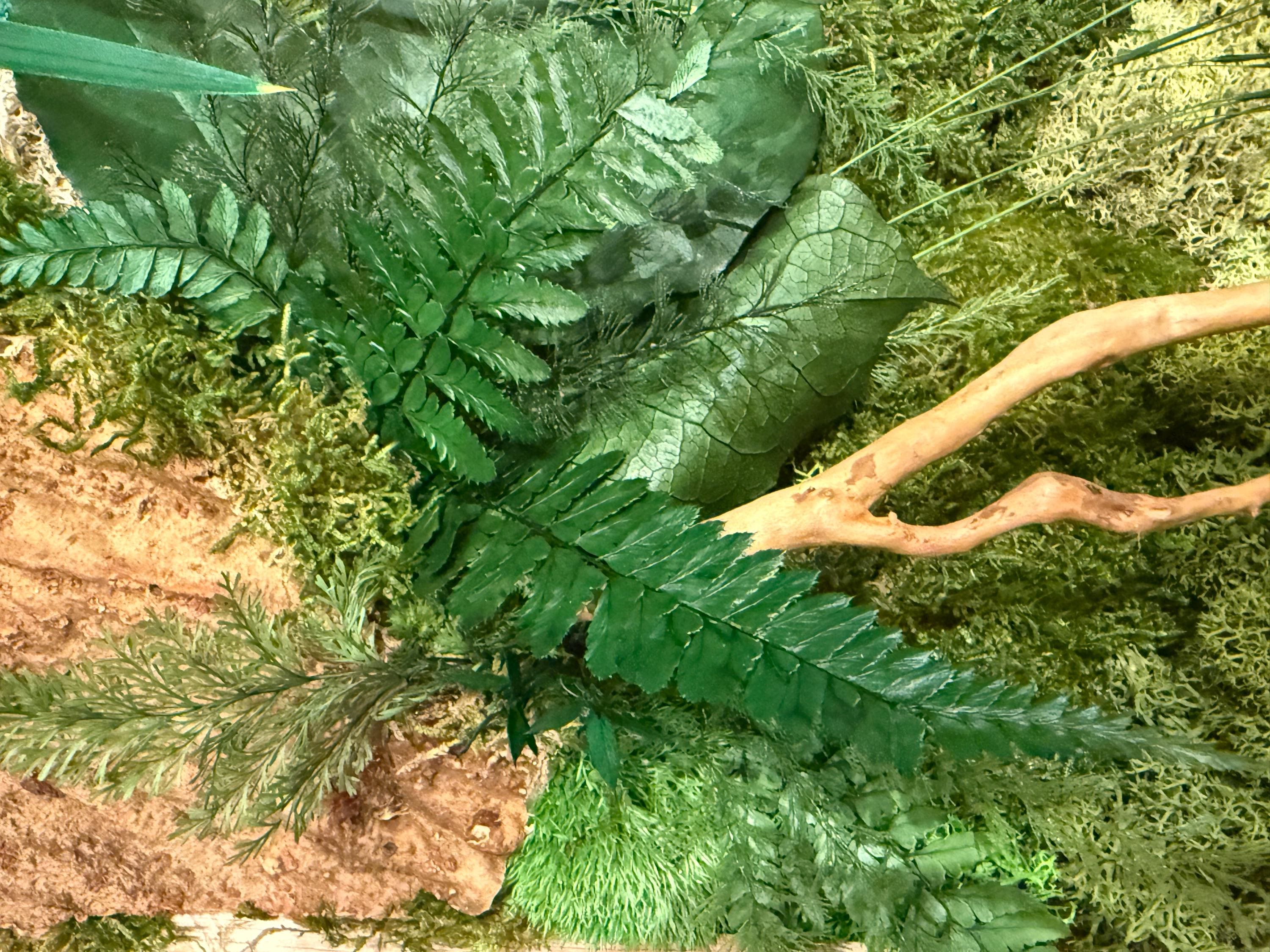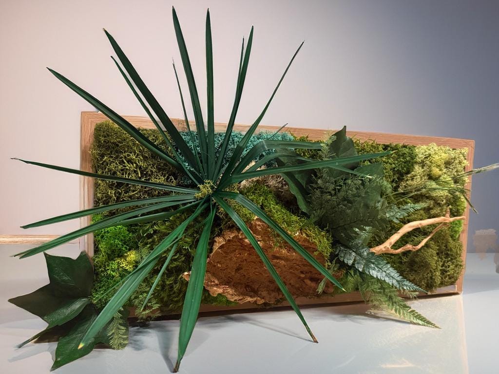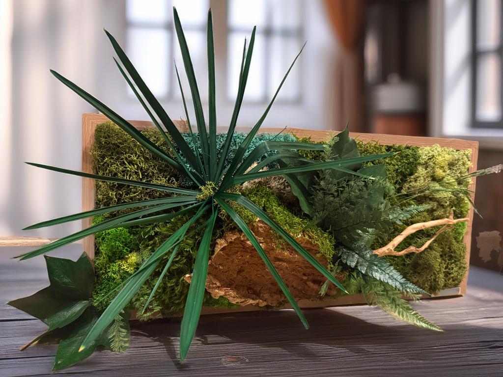 • Matériaux : mousses et feuillages stabilisés (naturels, sans arrosage) + éléments bois
