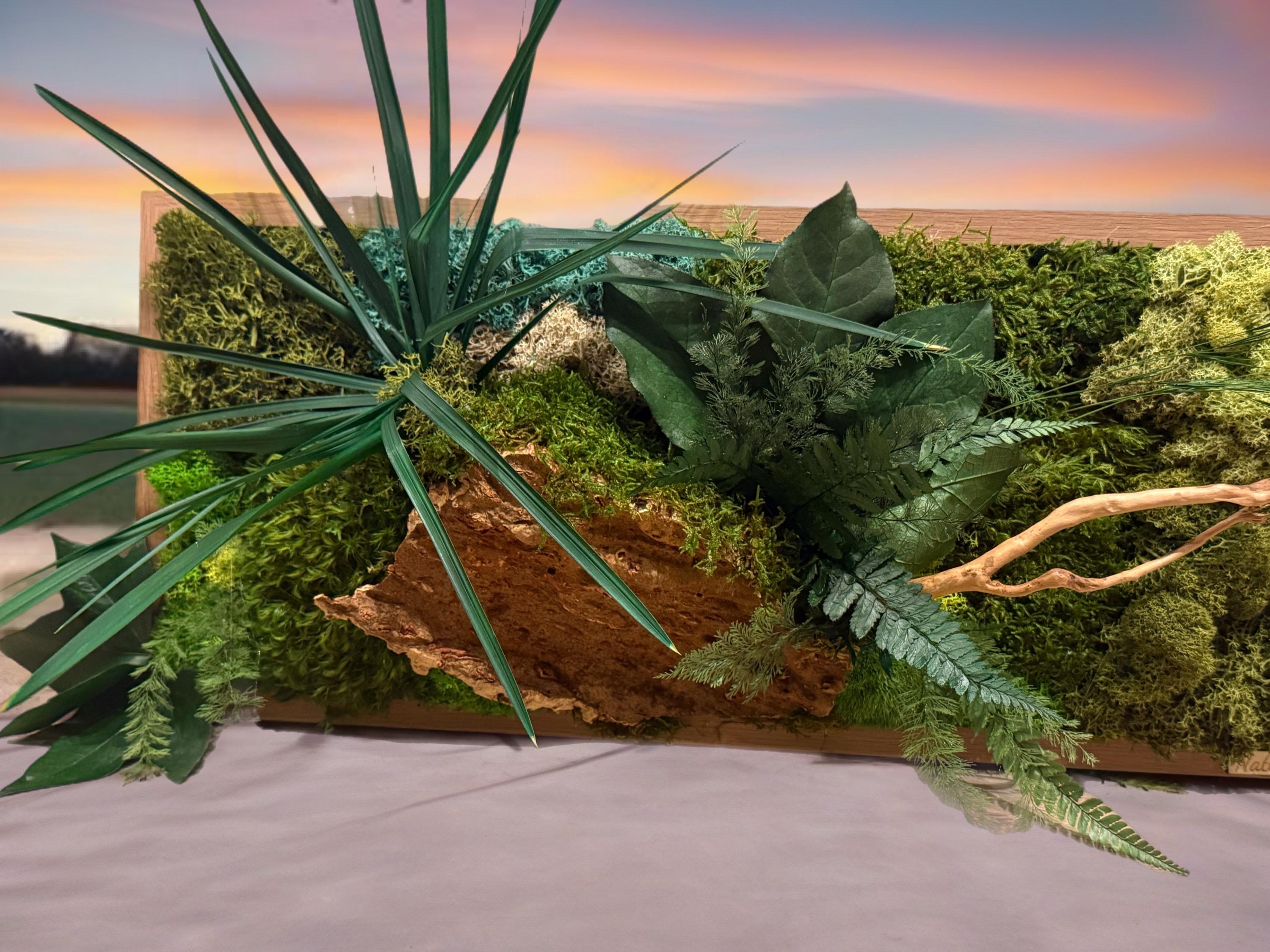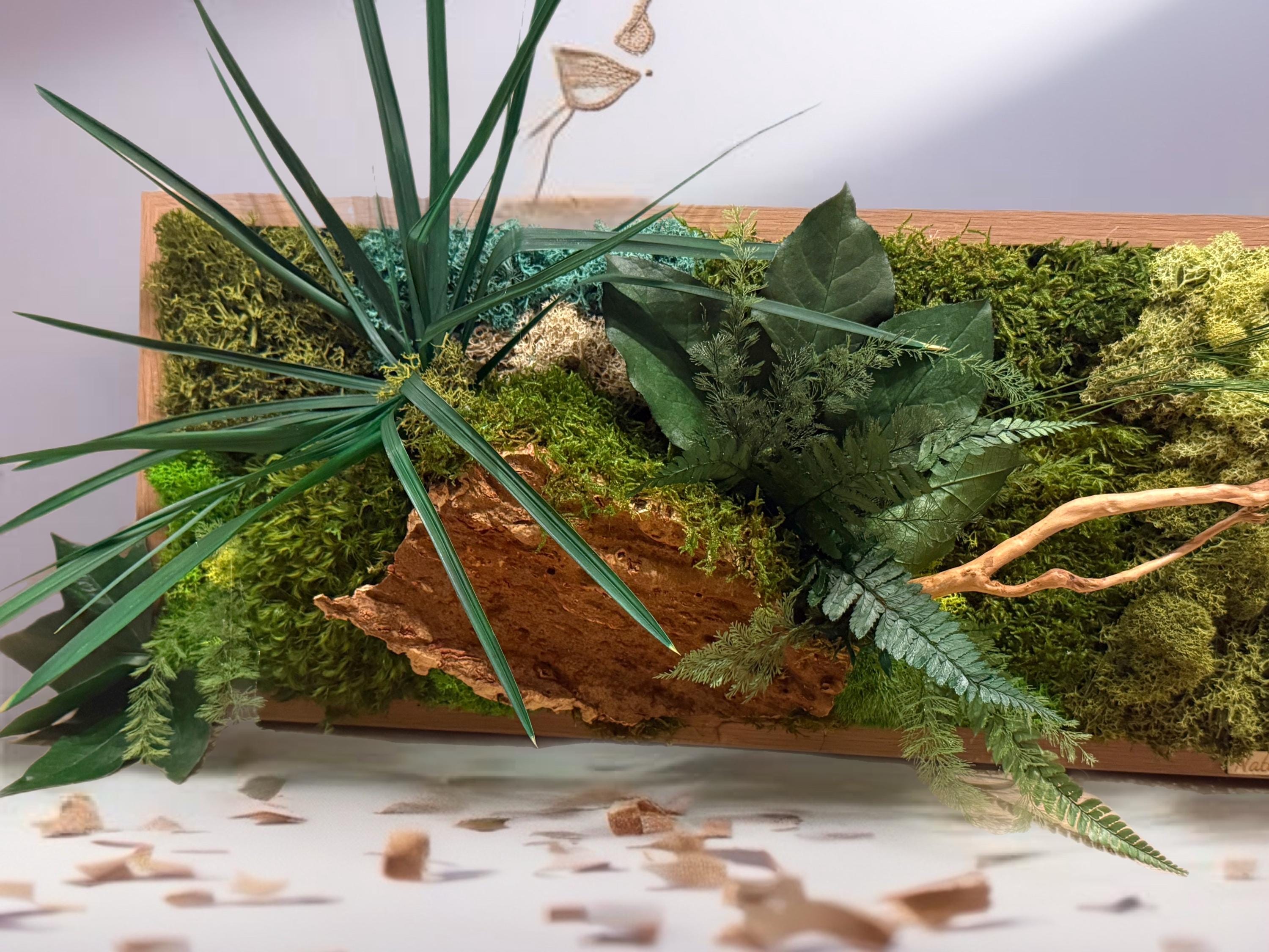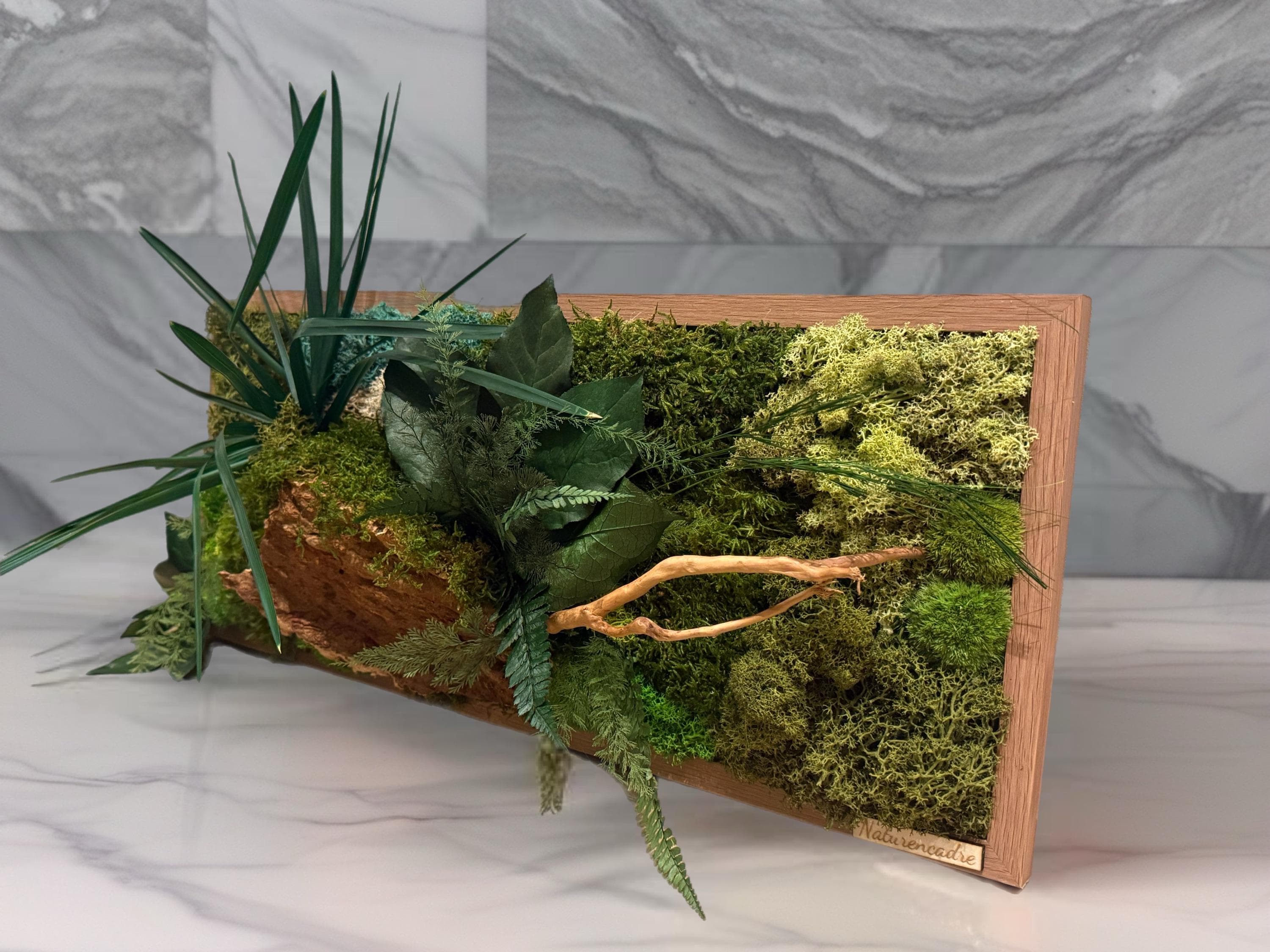 Chaque cadre est une pièce unique, travaillée avec soin pour mettre en valeur la richesse des textures : mousses moelleuses, feuillages délicats et éléments naturels en bois se mêlent harmonieusement. Ce tableau végétal est parfait pour :
