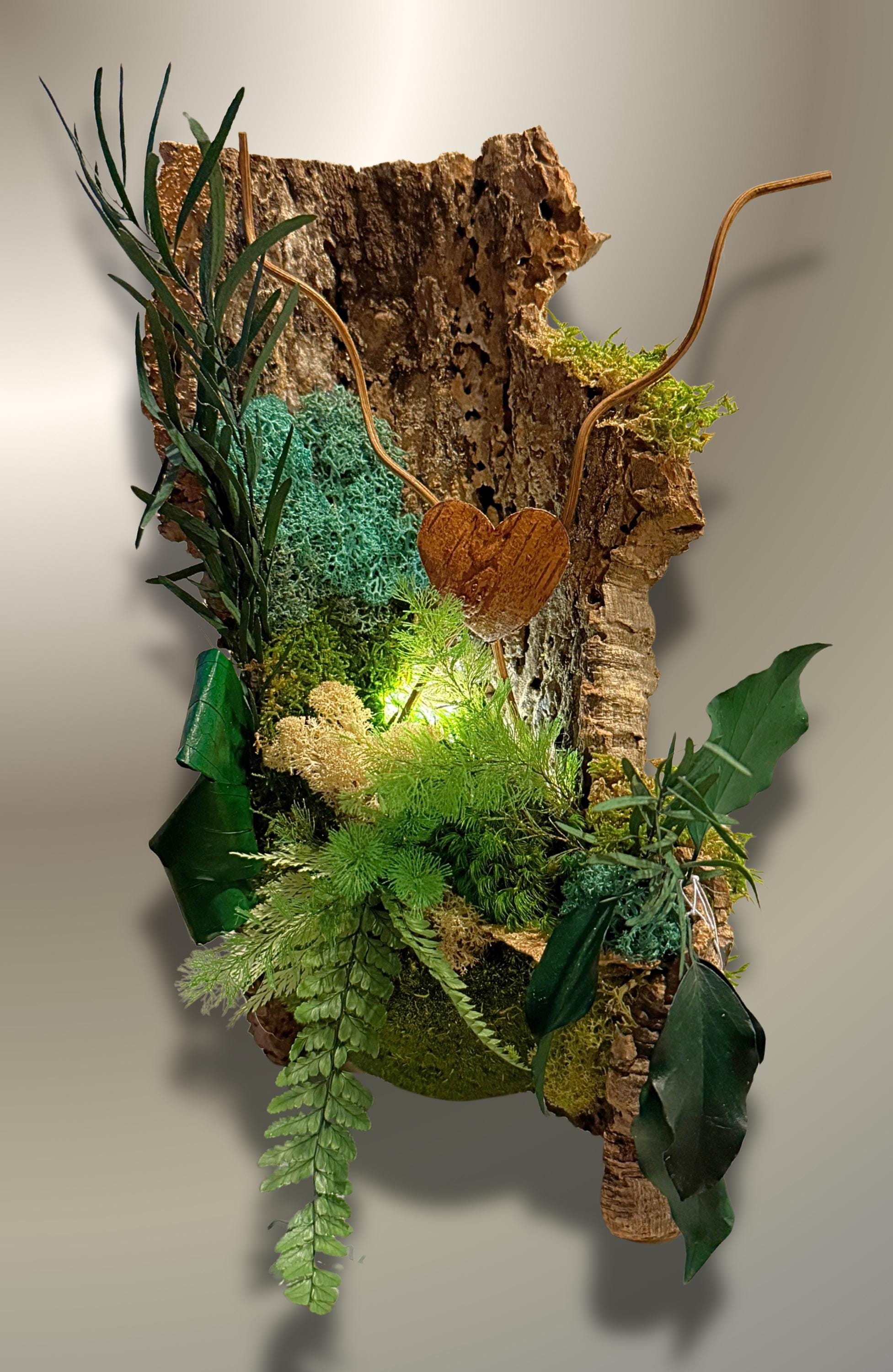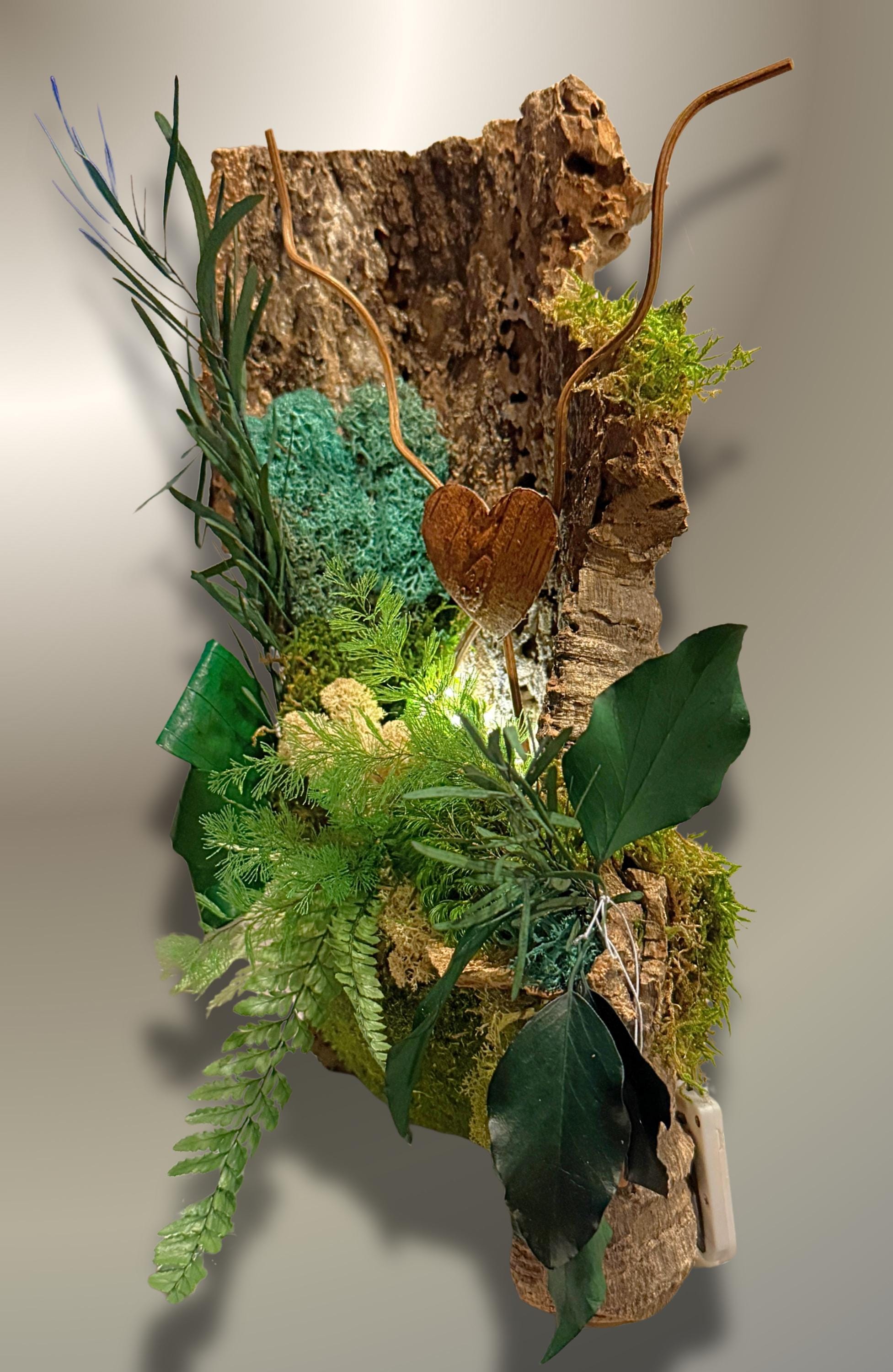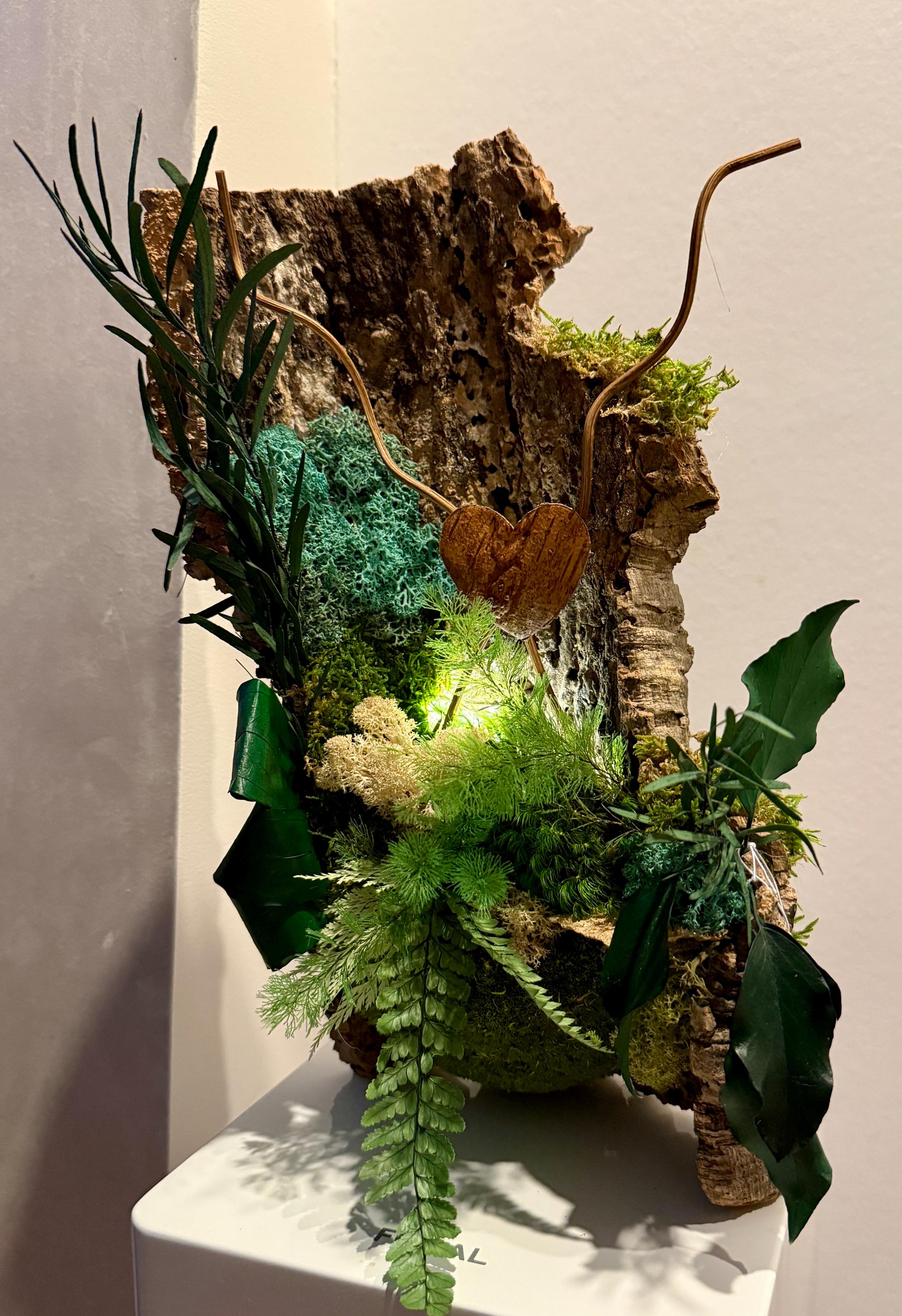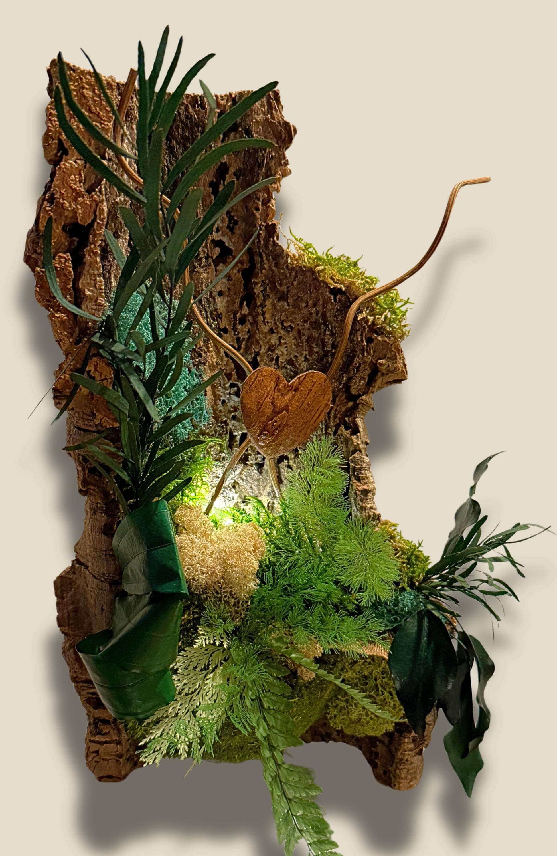 Apportez une touche de nature et de poésie à votre intérieur avec ce cadre végétal mural unique, réalisé à la main à partir d’écorce naturelle, de mousses et feuillages stabilisés, et d’un cœur en bois au centre.