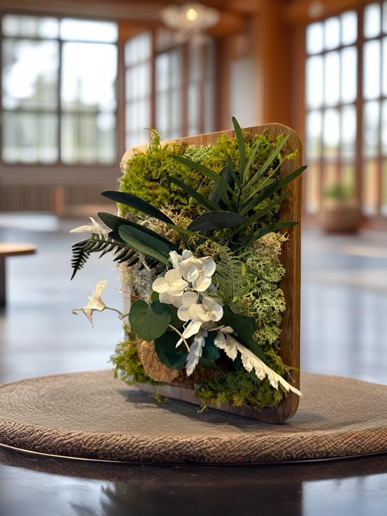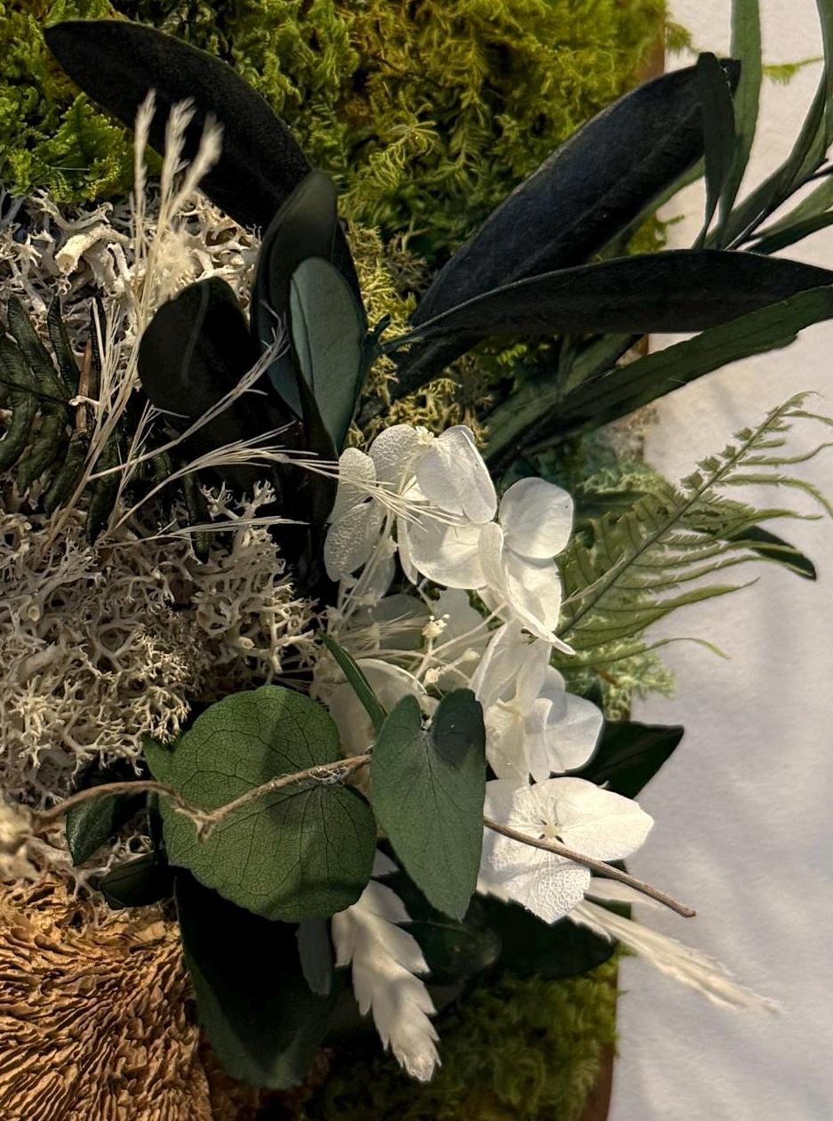Chaque pièce est artisanale et unique, les éléments de mousse et de feuillage peuvent varier légèrement, garantissant un décor naturel authentique.