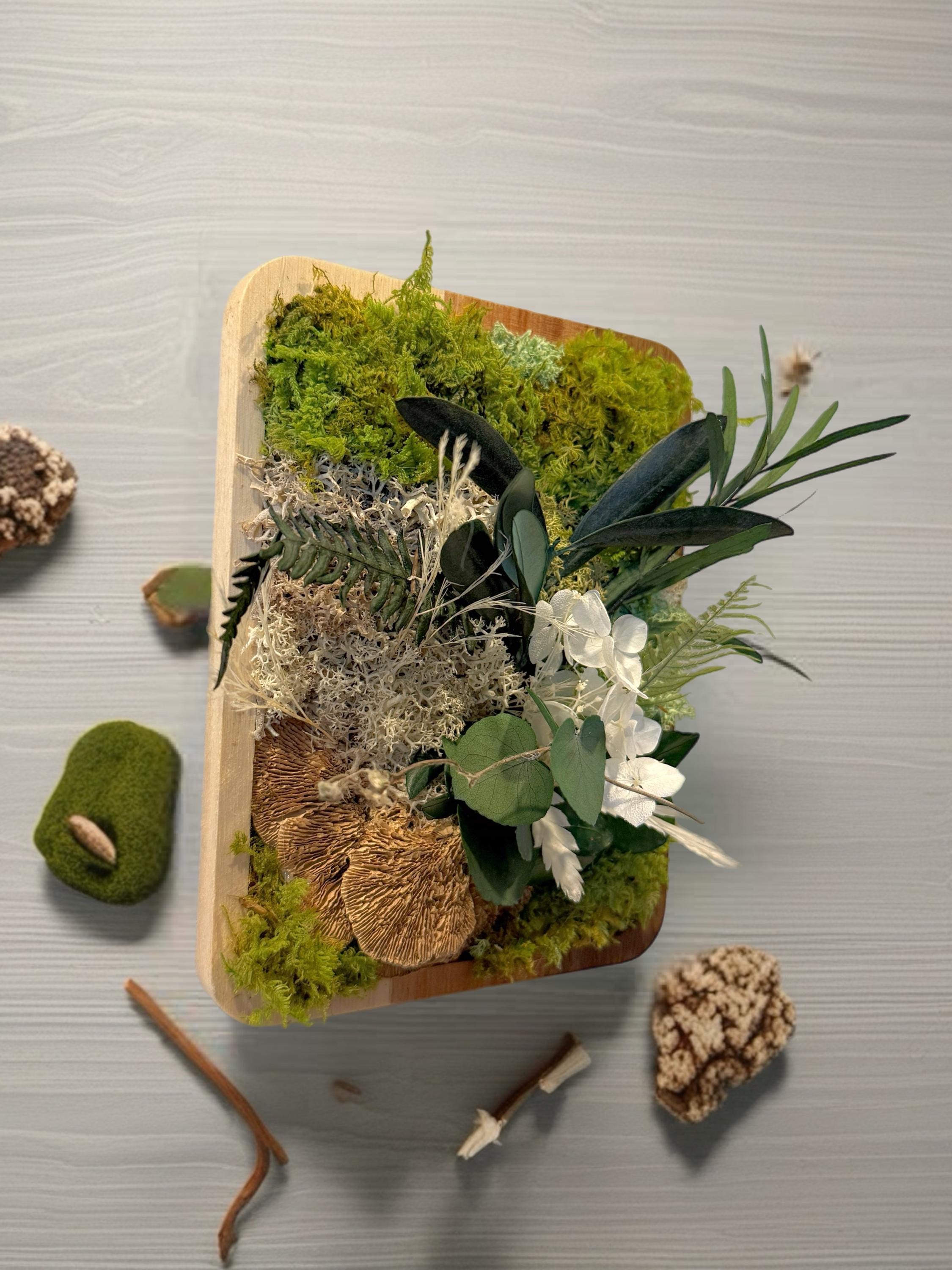 Composé de différentes mousses stabilisées, de fougères délicates, il évoque une petite scène de forêt miniature.
