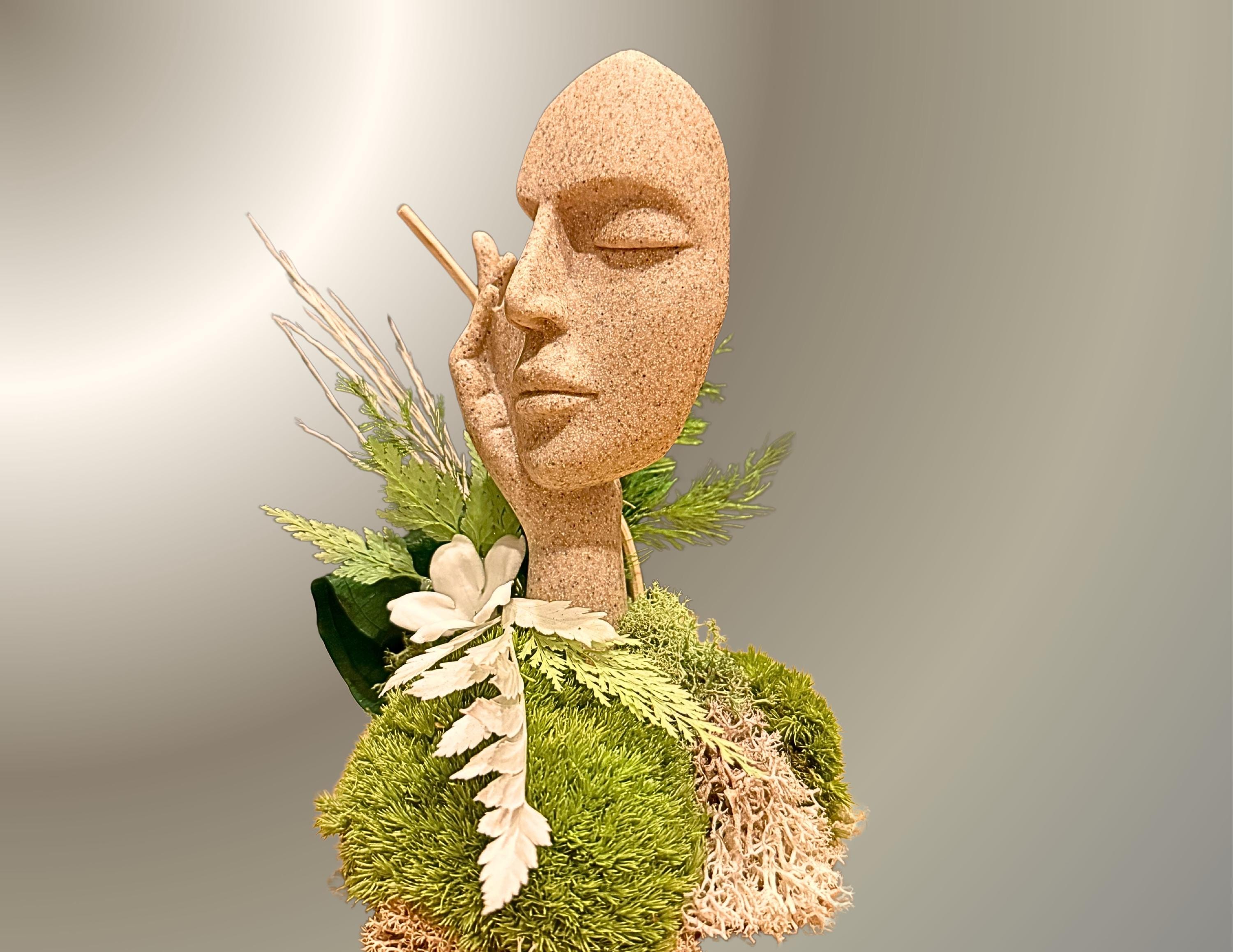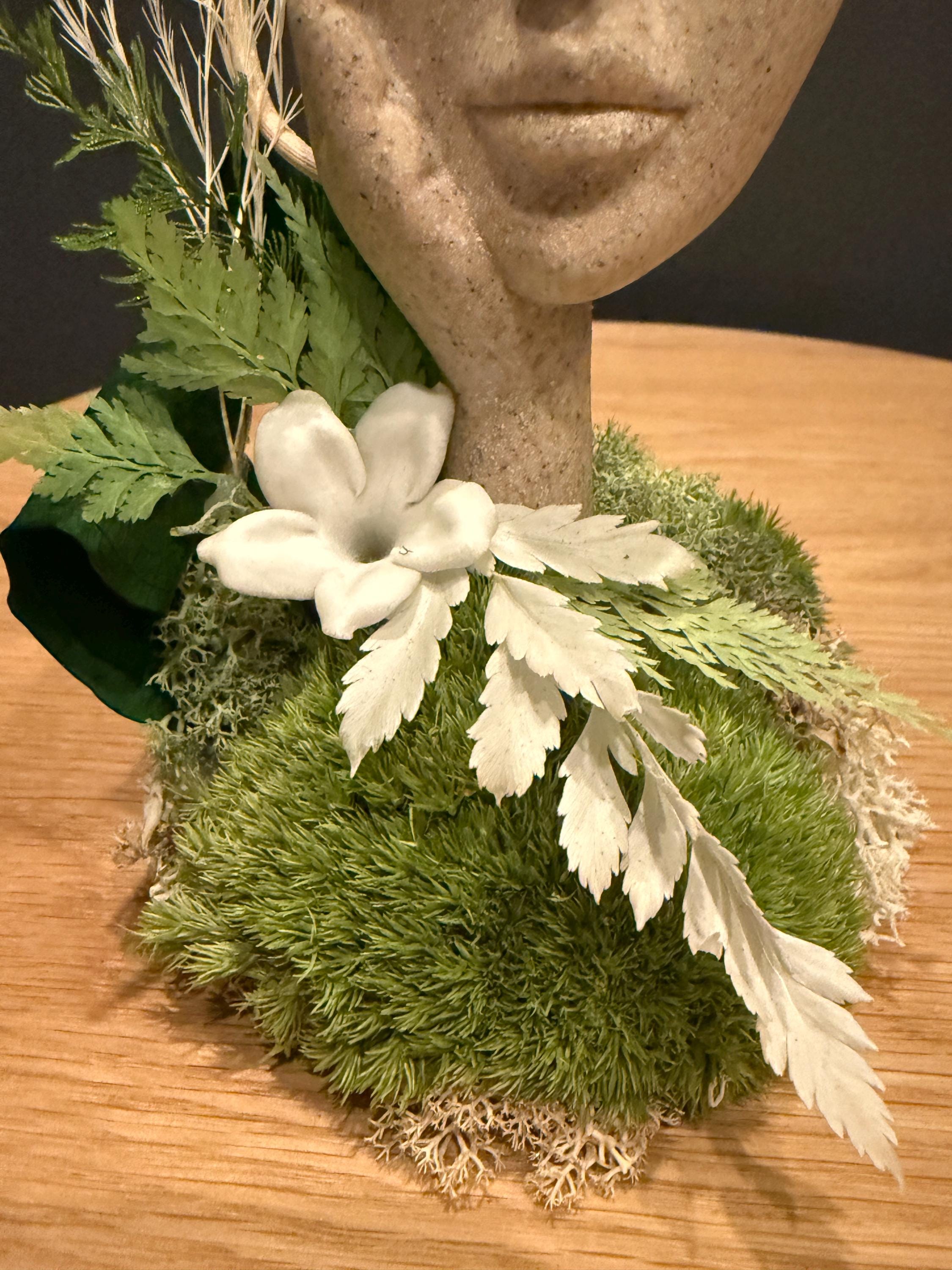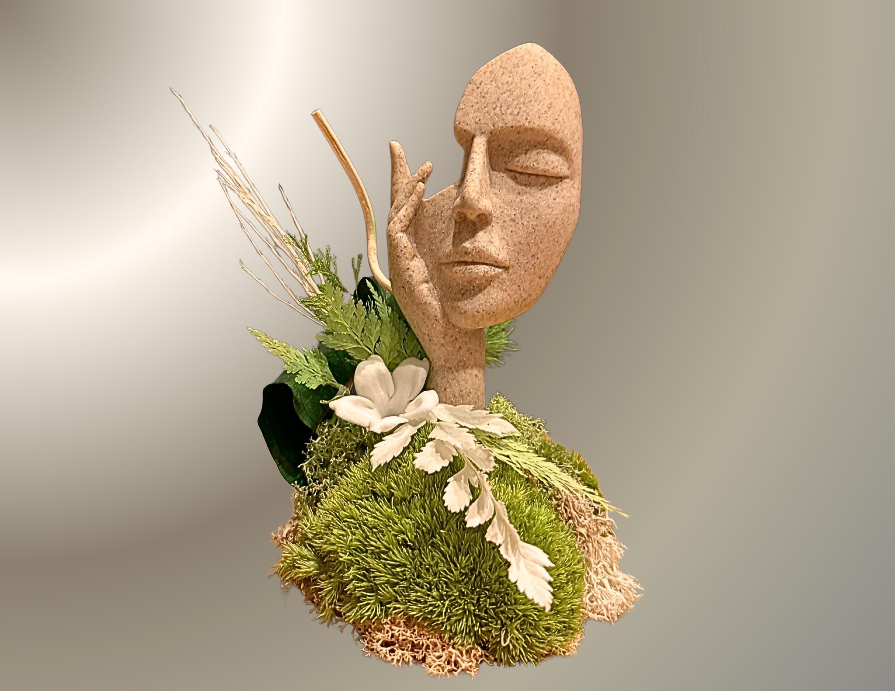 • Matériaux : mousse, fougères et jasmin stabilisé + sculpture de visage