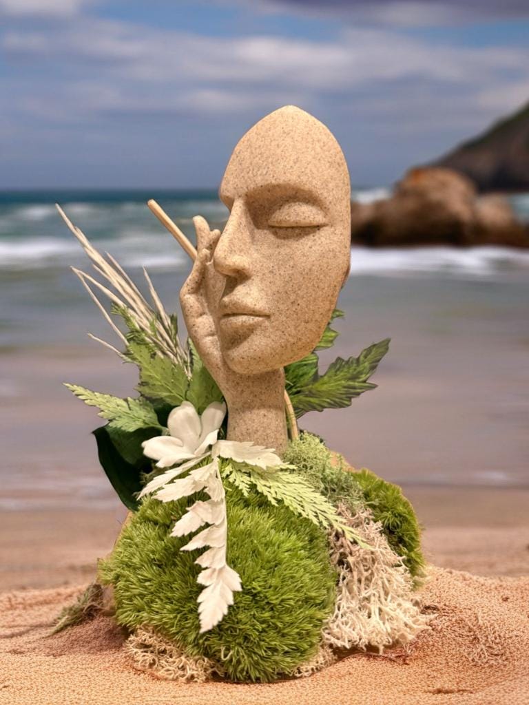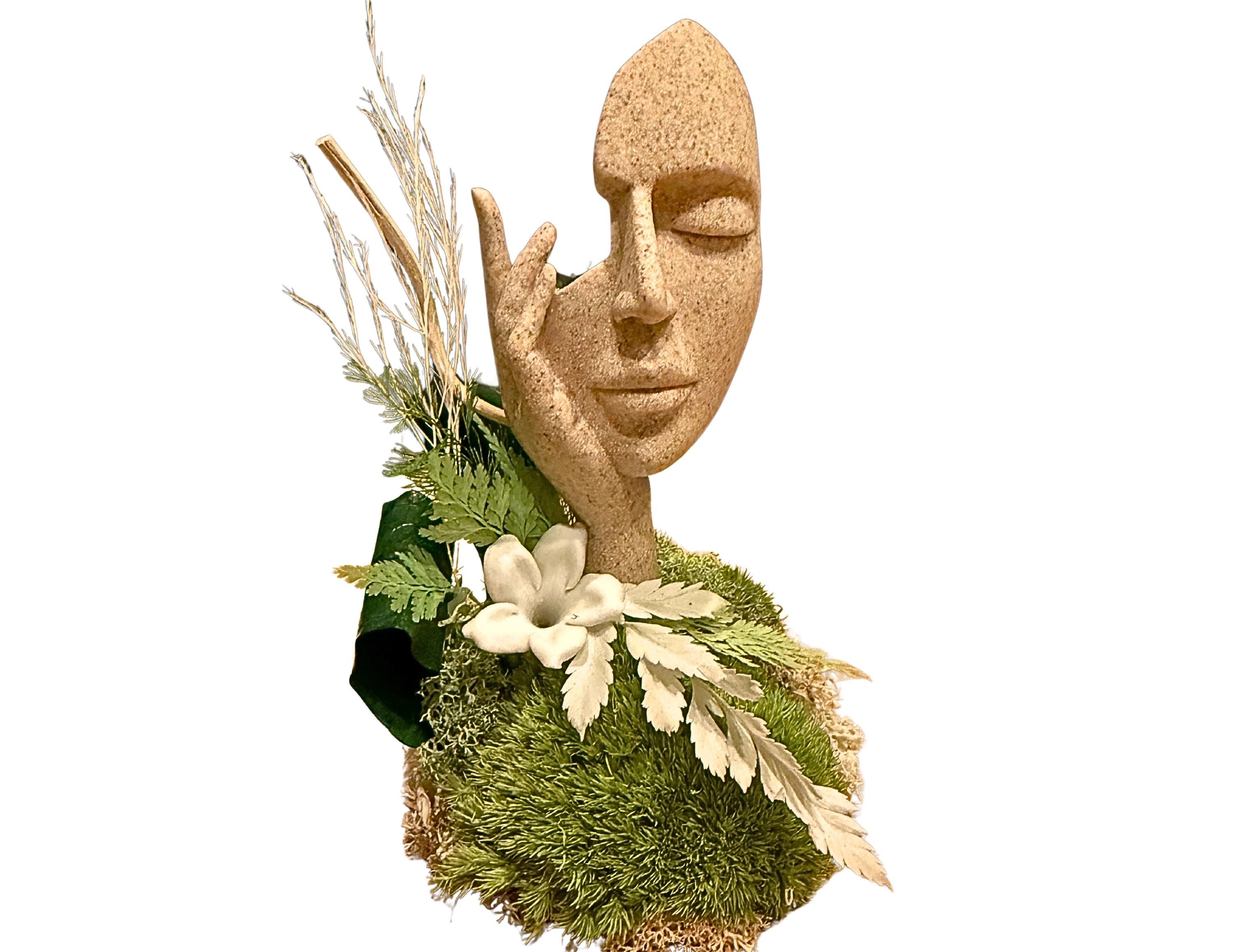 Elle associe une statue de visage contemporaine 🎭 à une composition de mousses et feuillages stabilisés 🌿, pour une décoration qui marie l’art et la nature.