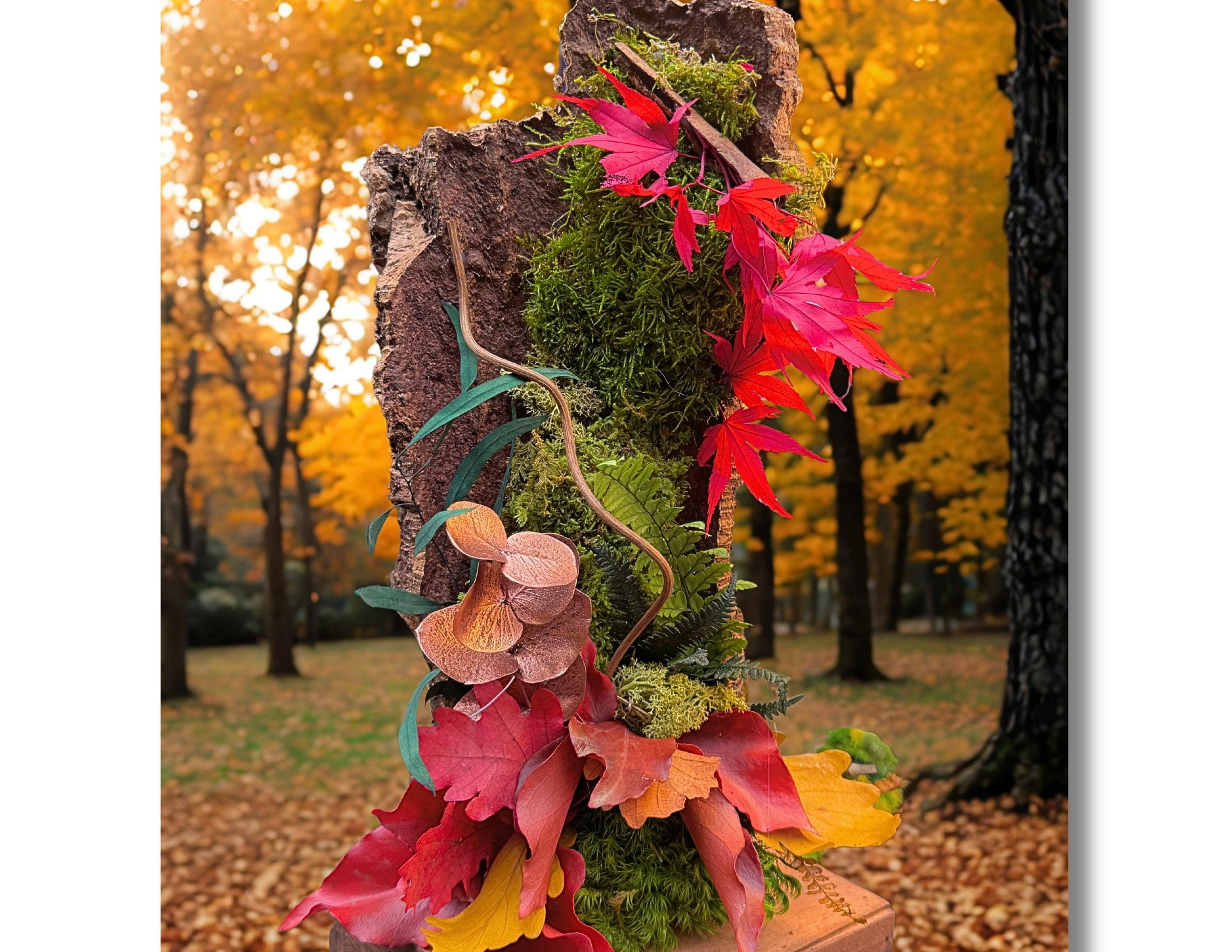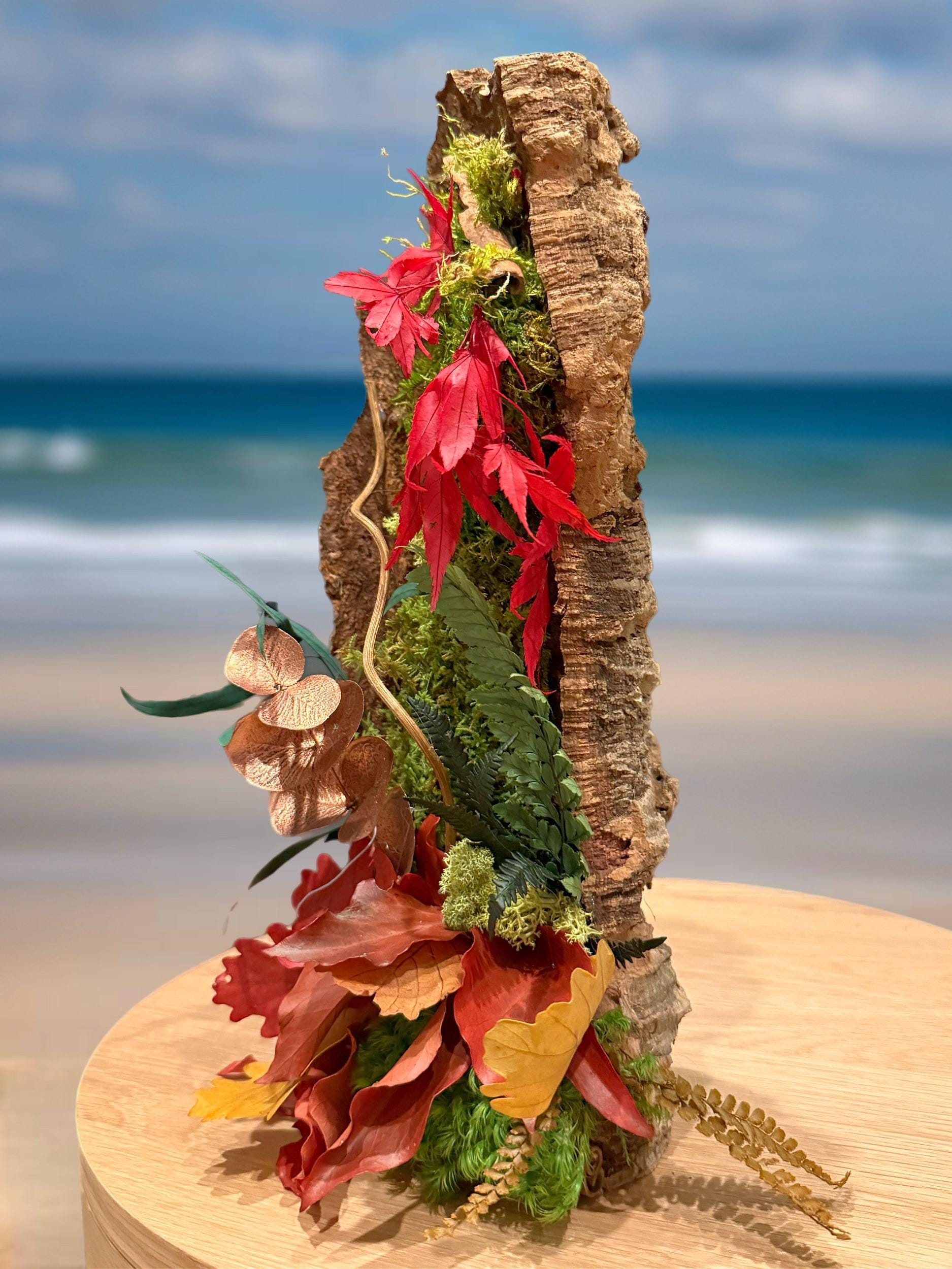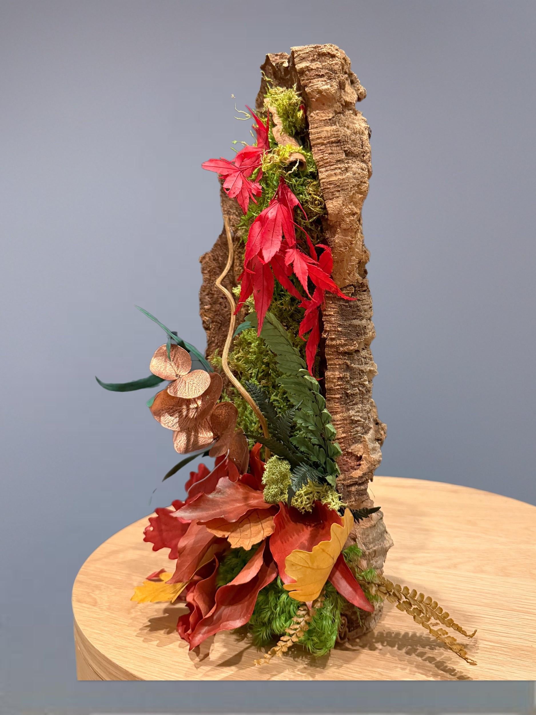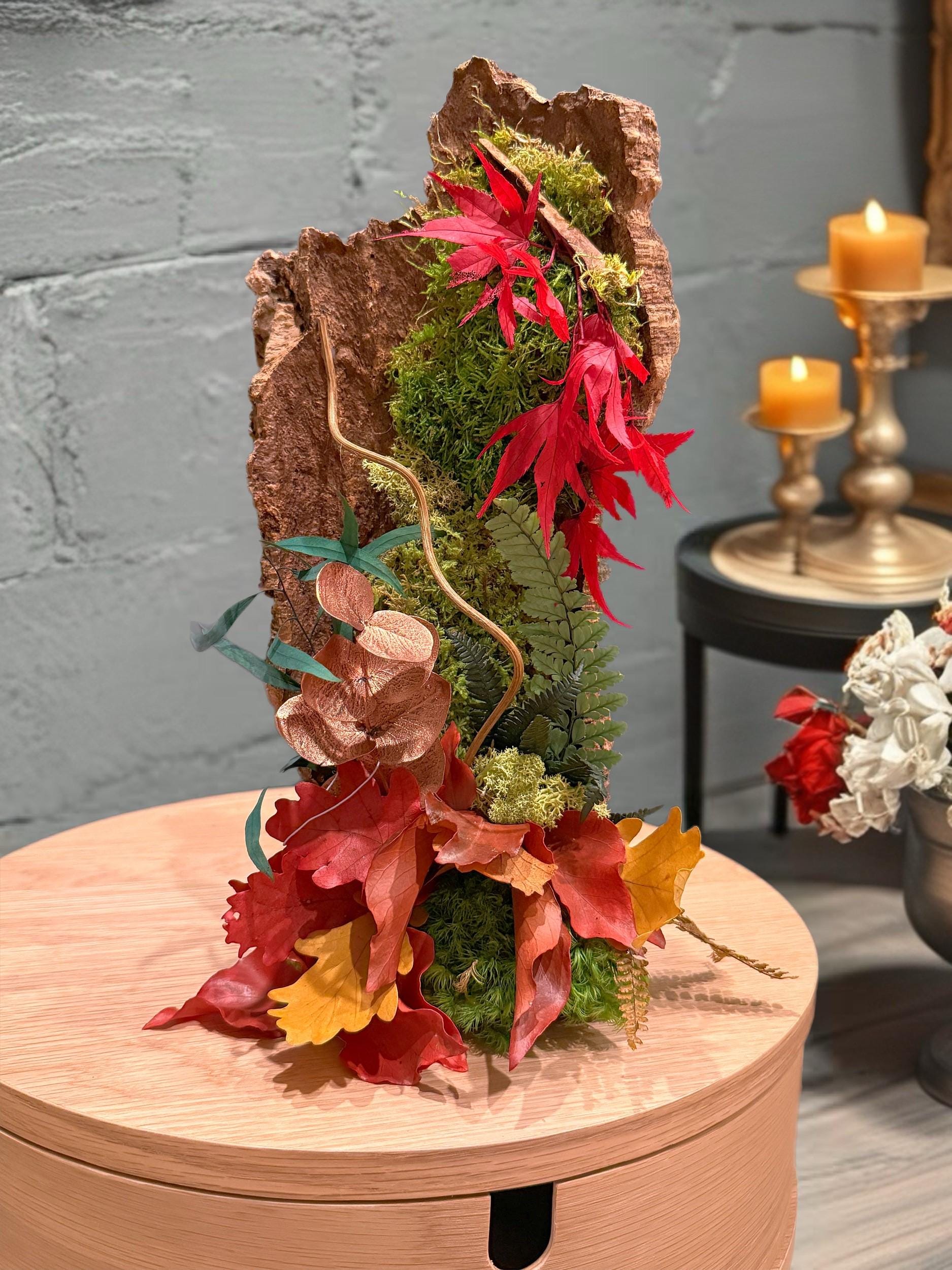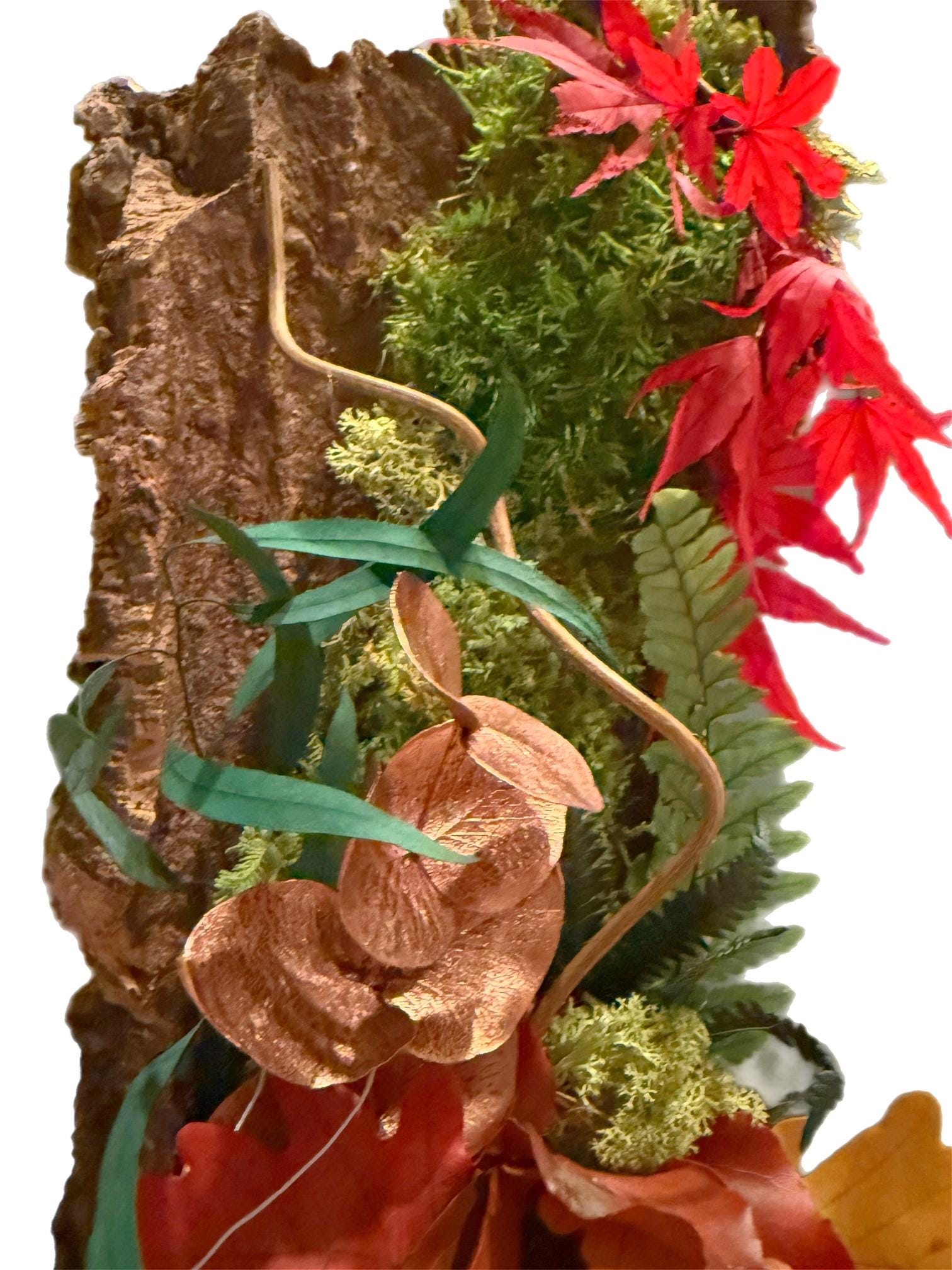 Montée sur une écorce brute, cette composition marie la mousse verte intense, les feuilles d’érable rouge éclatant, les feuillages cuivrés et orangés, et de délicates tiges d'eucalyptus peintes en rose gold pour un rendu à la fois raffiné et authentique.