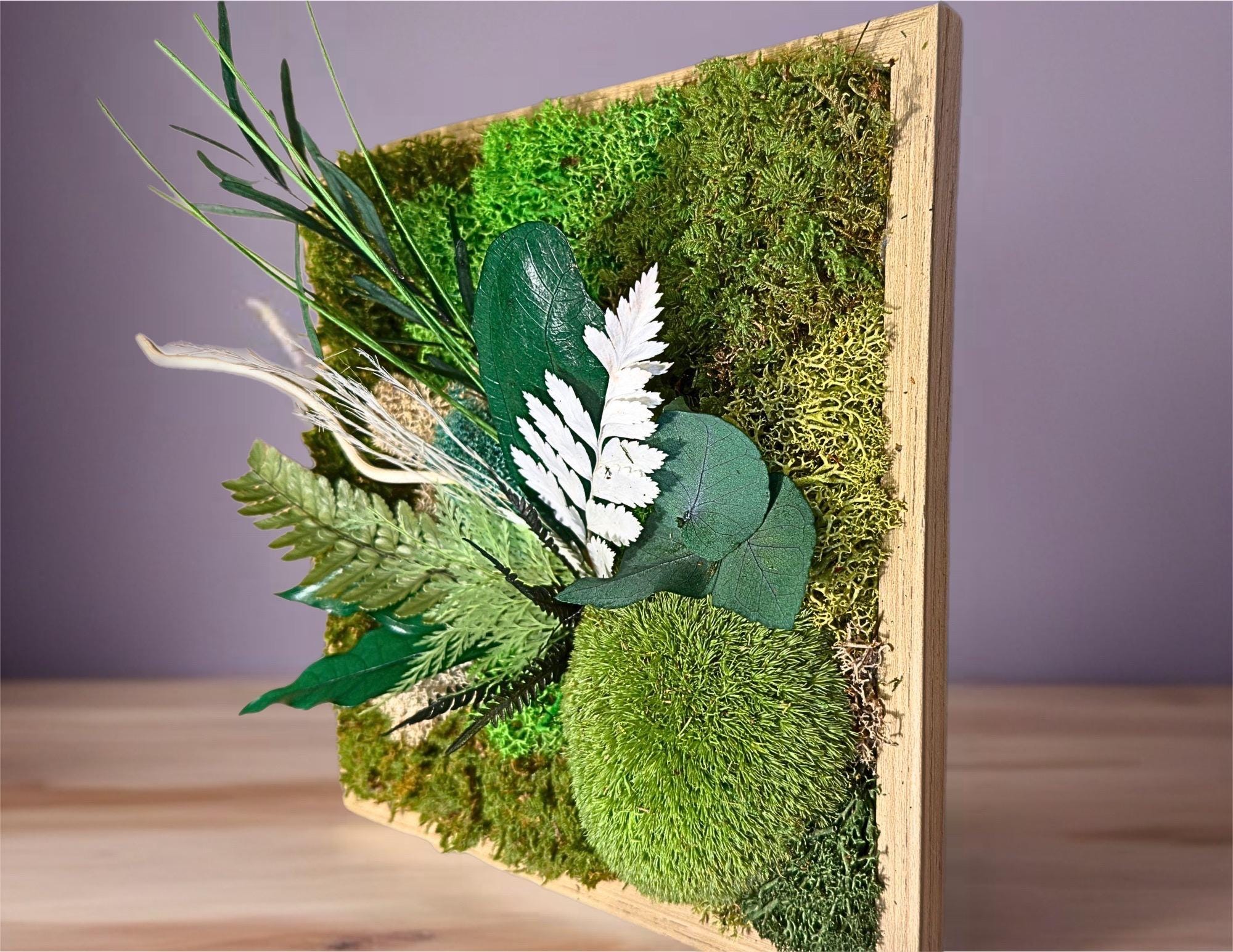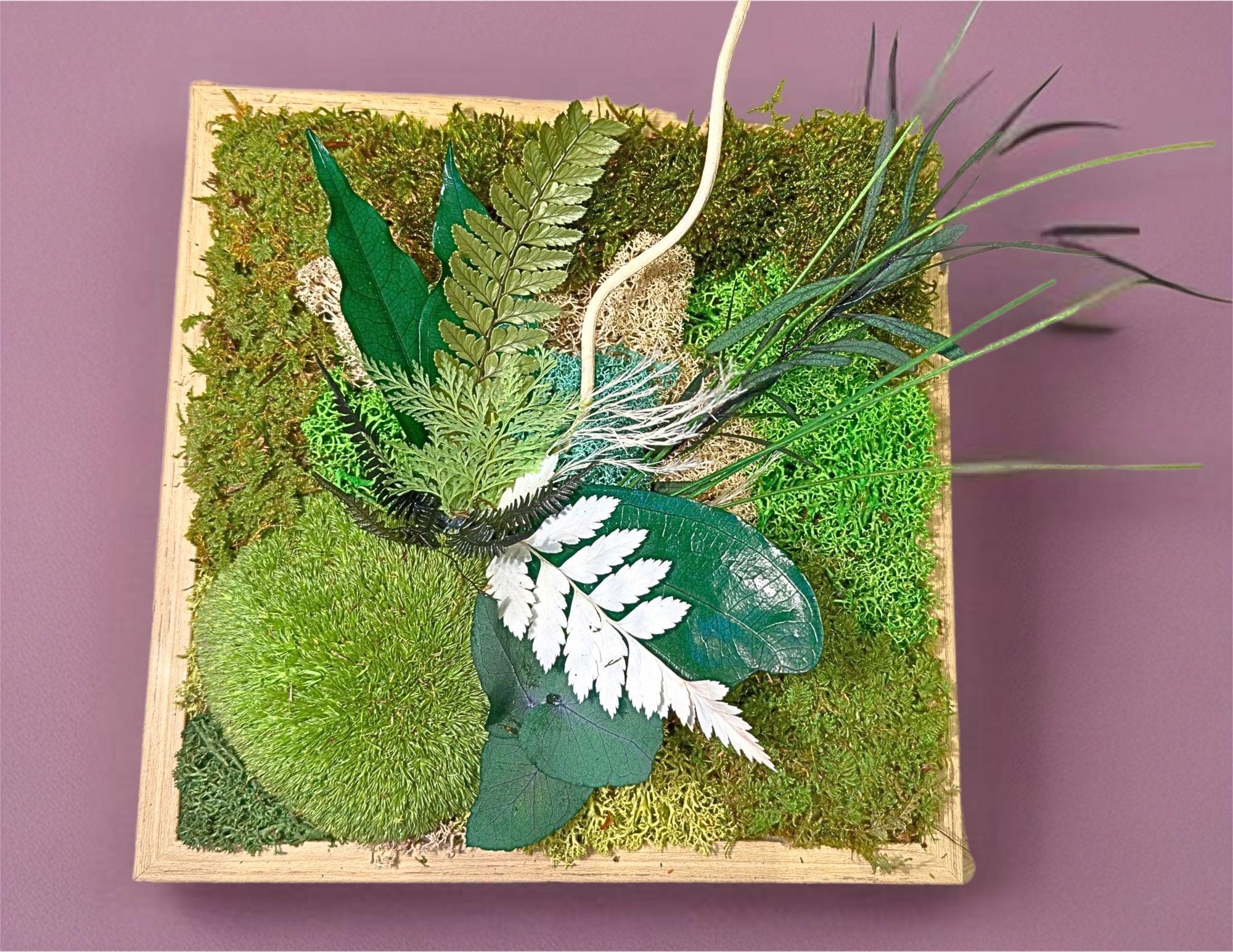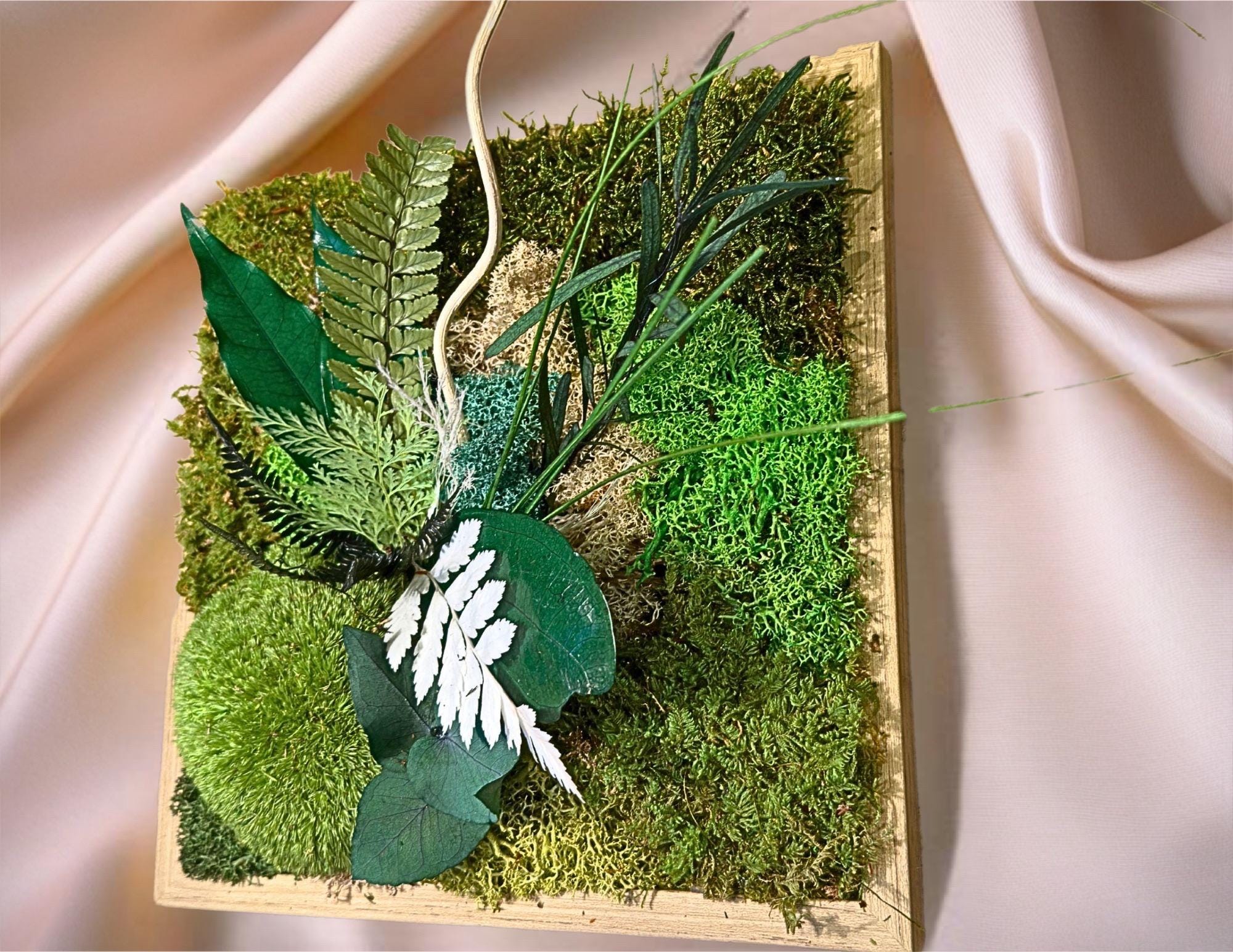 Apportez une touche de verdure éternelle à votre intérieur avec ce cadre végétal stabilisé, entièrement réalisé à la main. Véritable tableau de nature, il combine différentes mousses stabilisées (mousse boule, mousse plate, lichen scandinave), feuillages préservés et délicates fleurs blanches, pour une composition raffinée et durable.