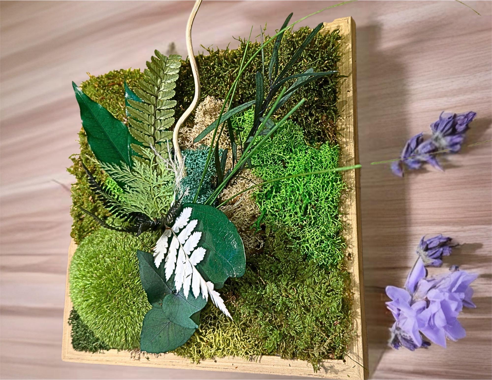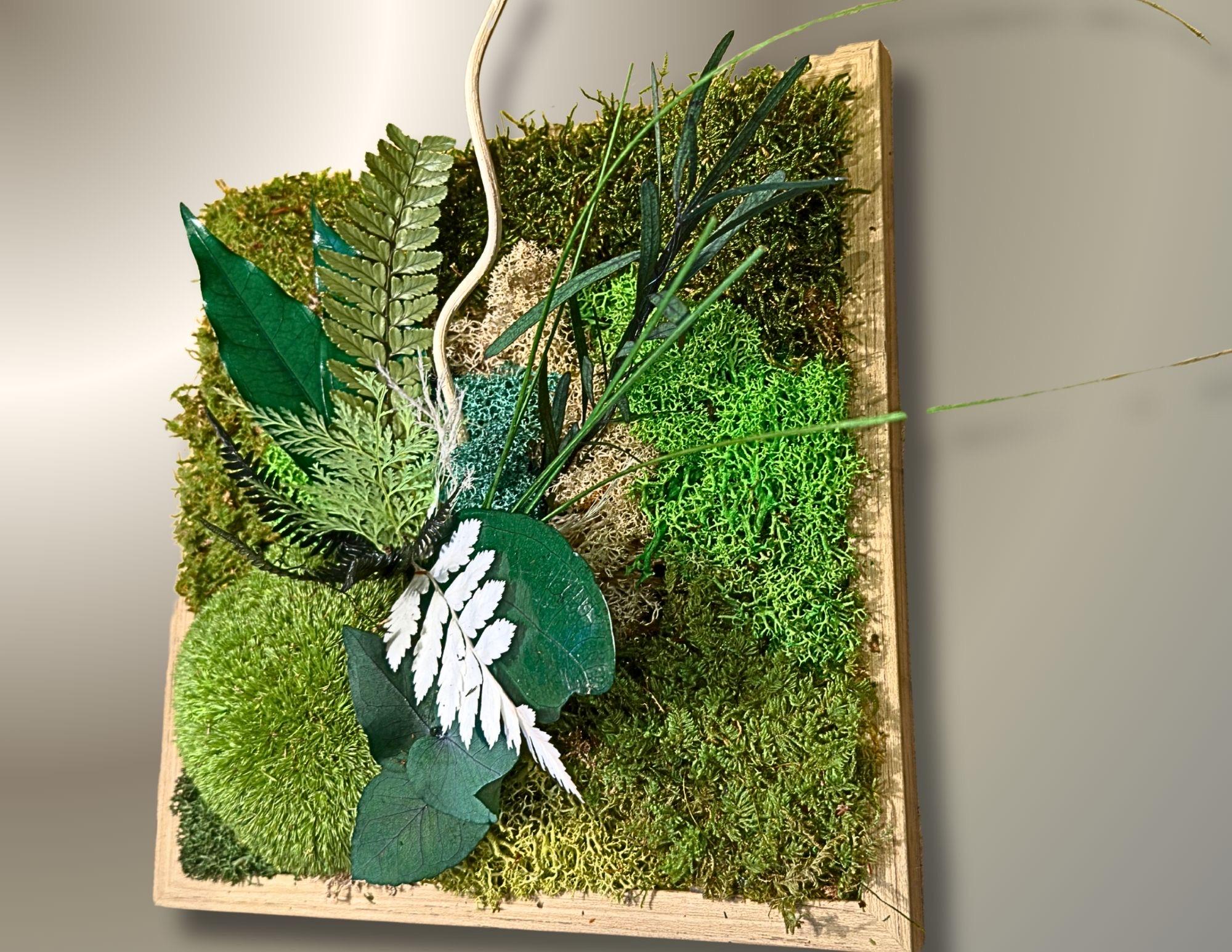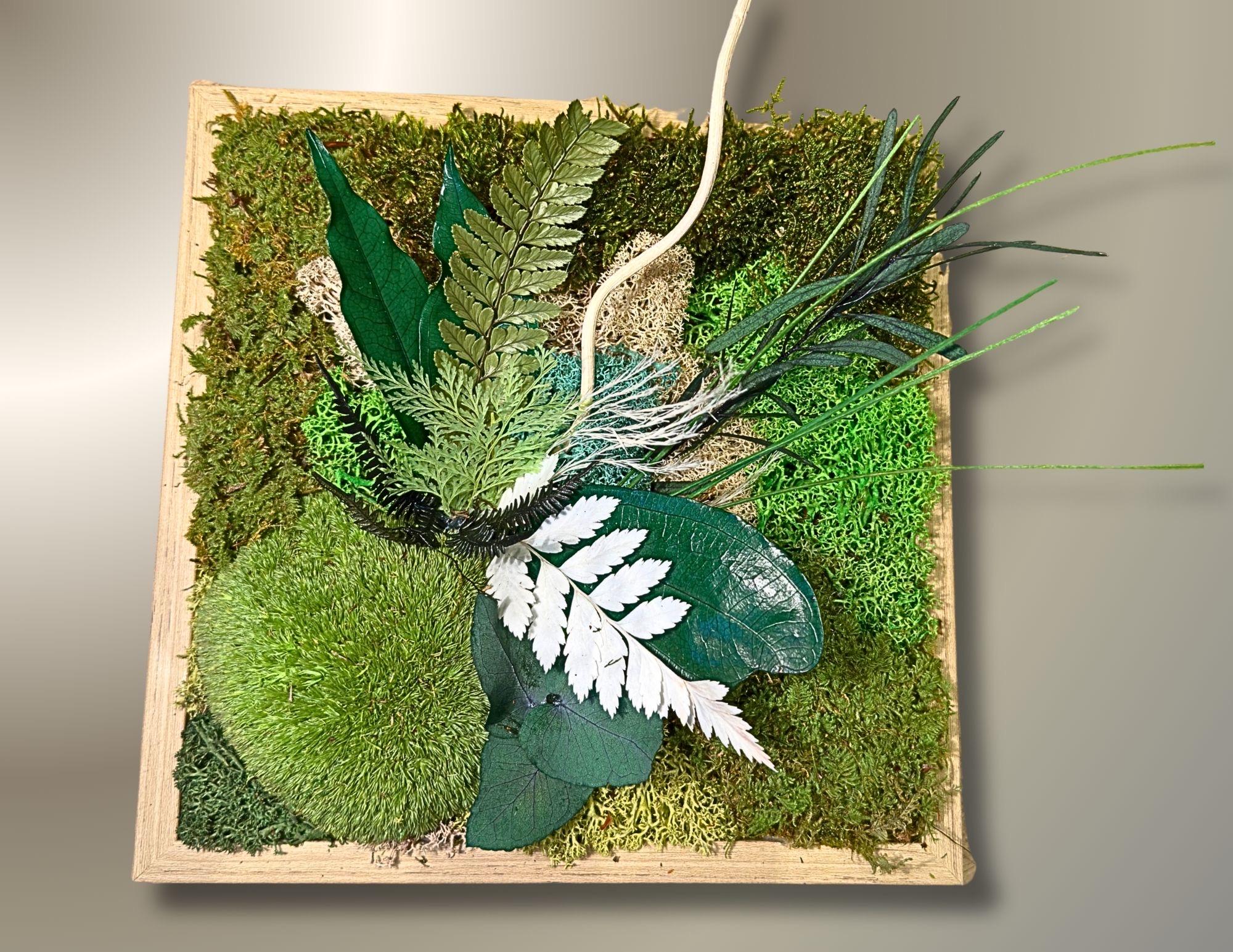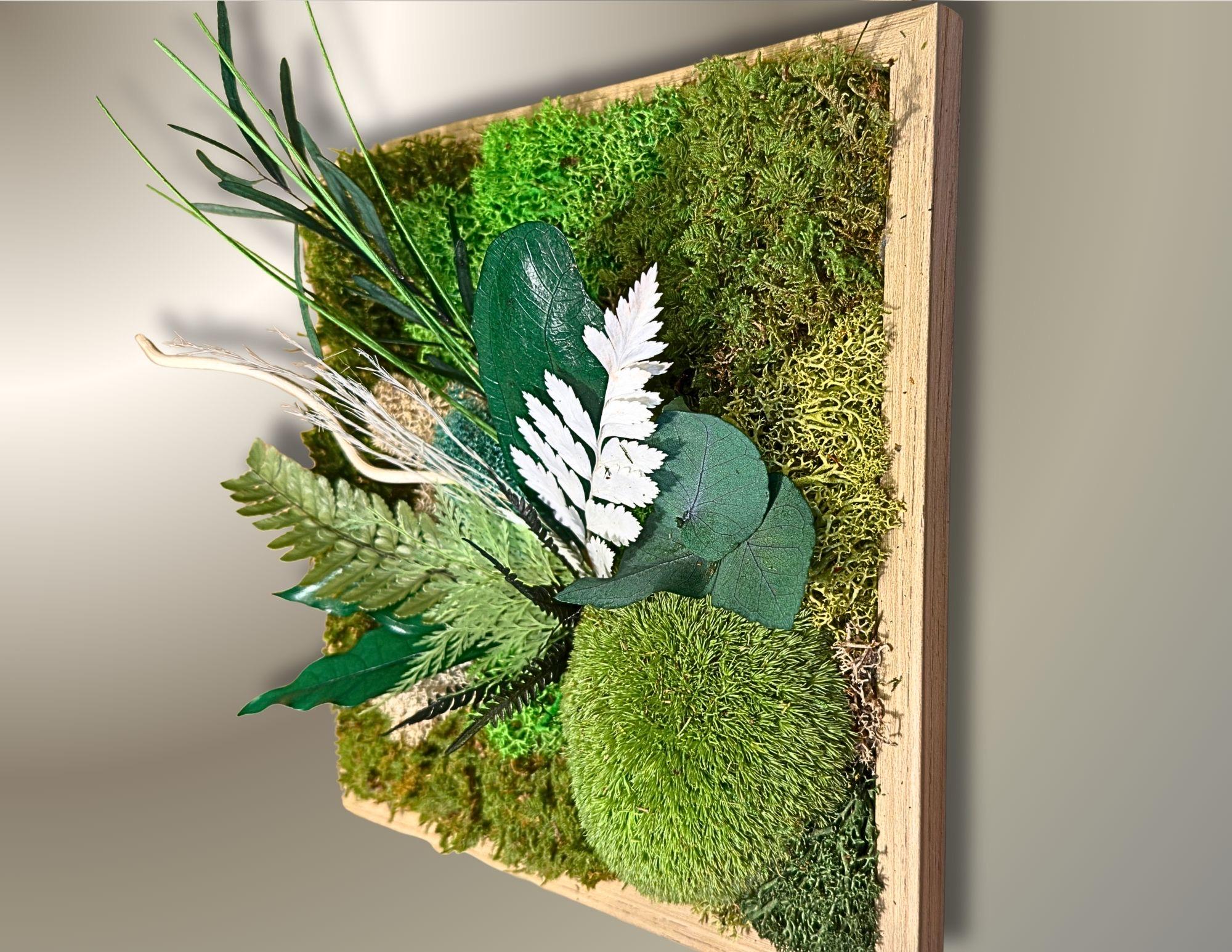 Apportez une touche de verdure éternelle à votre intérieur avec ce cadre végétal stabilisé, entièrement réalisé à la main. Véritable tableau de nature, il combine différentes mousses stabilisées (mousse boule, mousse plate, lichen scandinave), feuillages préservés et délicates fleurs blanches, pour une composition raffinée et durable.