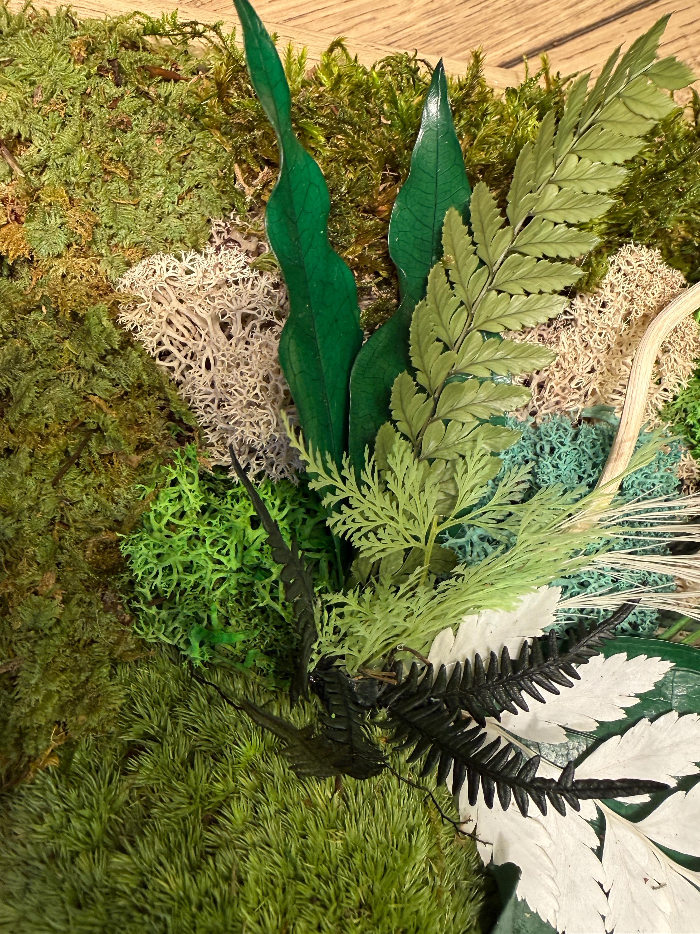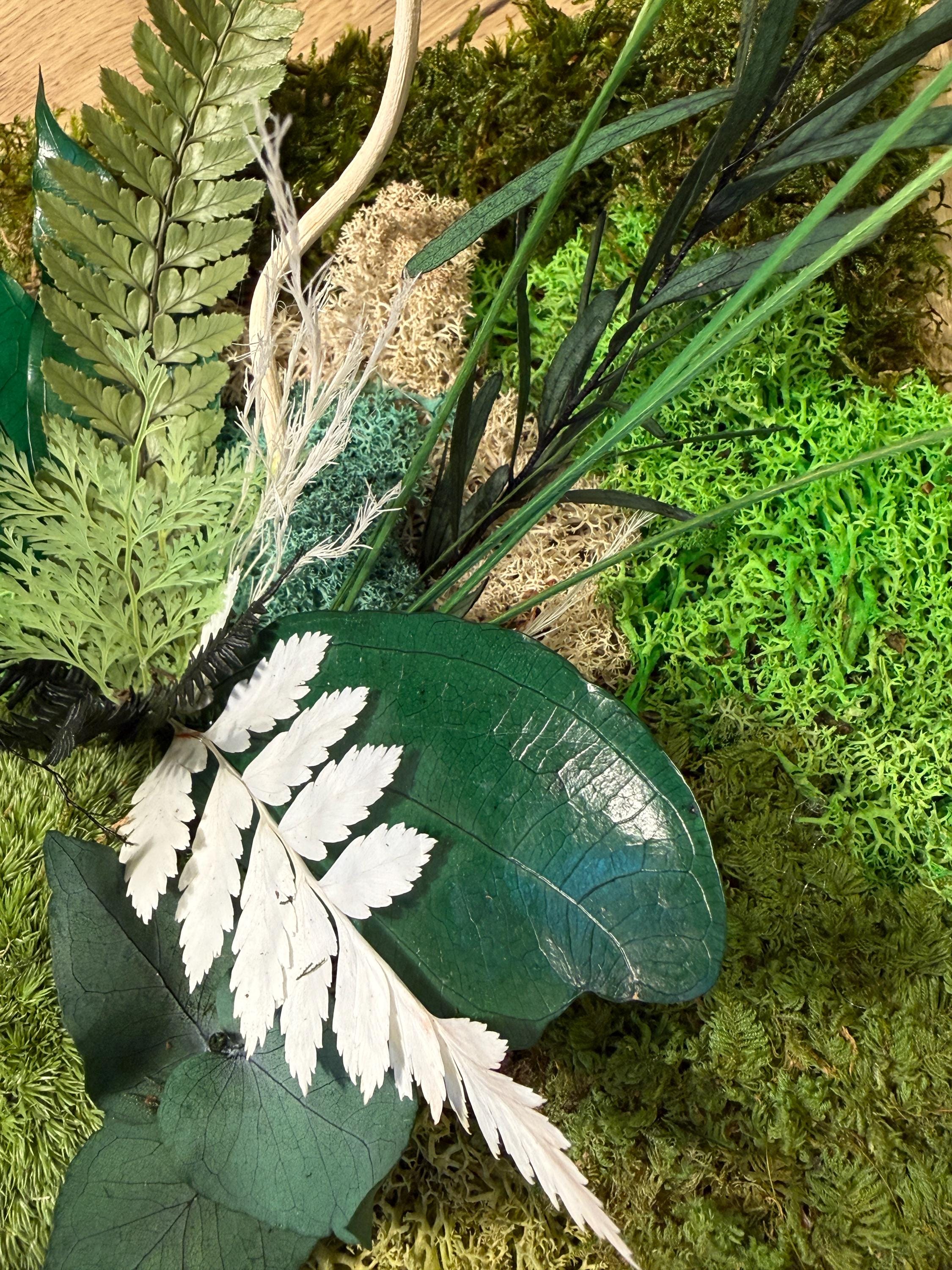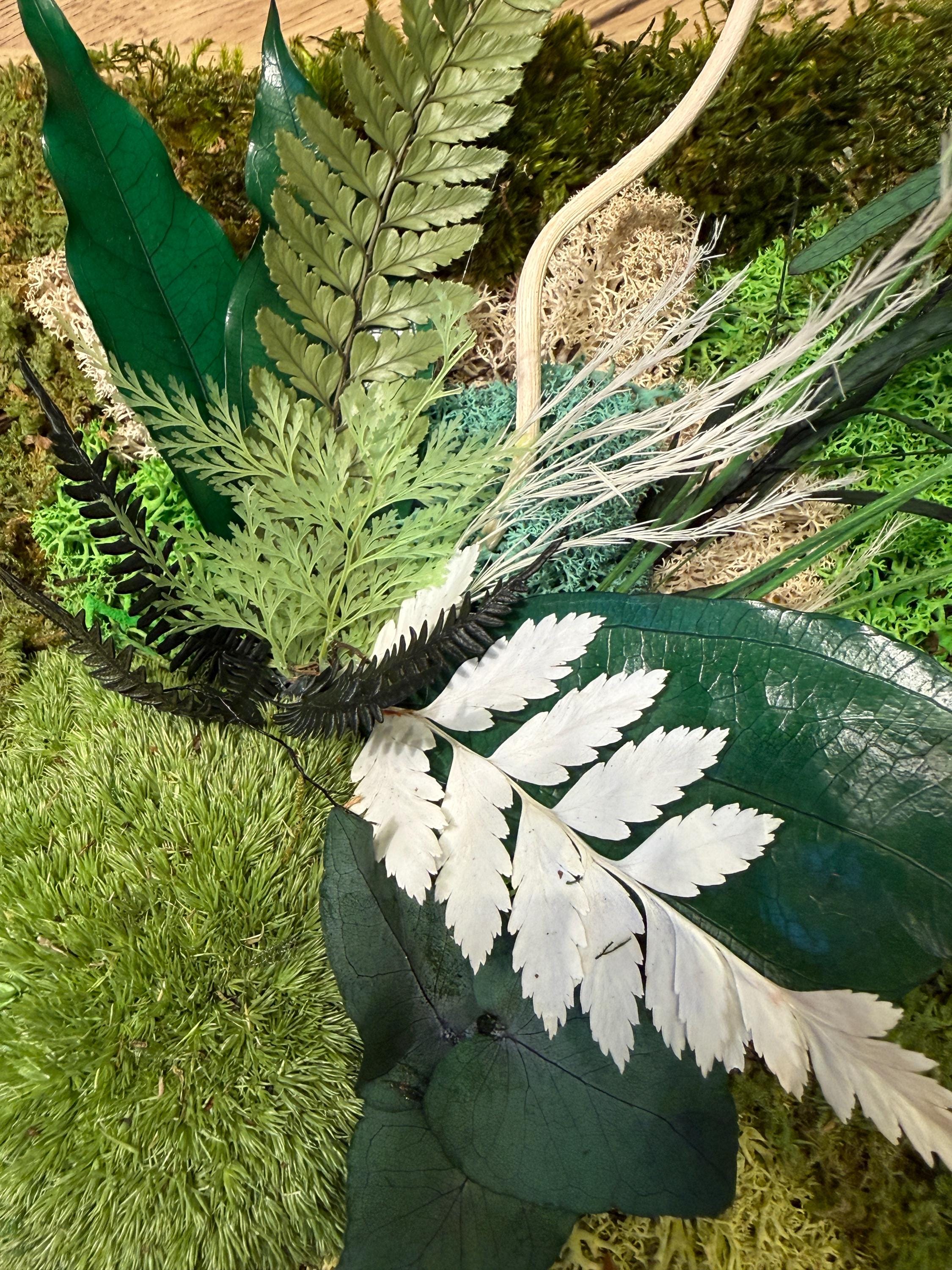 • Matériaux : mousses et feuillages naturels comme le lierre et les fougères stabilisés, tiges décoratives, et champignon eponge.