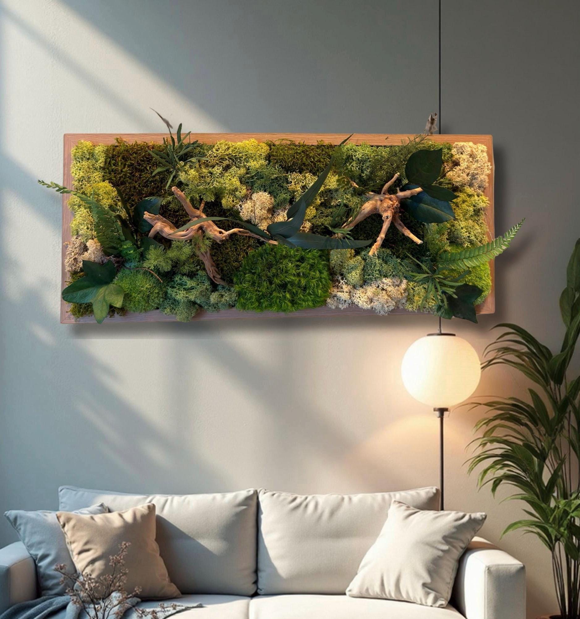 Une composition unique où se mêlent mousses stabilisées, bois flotté, feuillages naturels et textures lumineuses, pour une décoration murale à la fois zen, organique et design.
