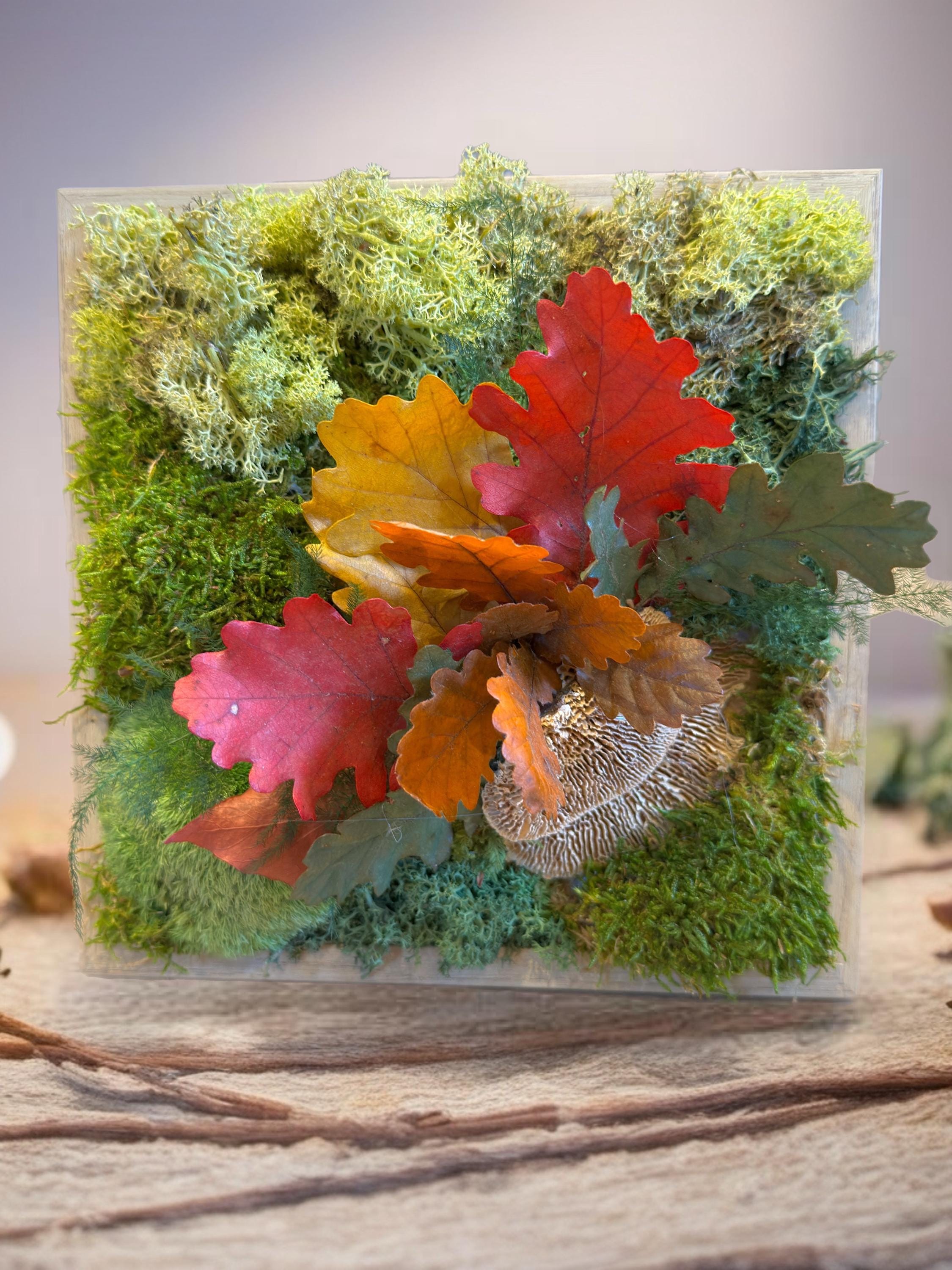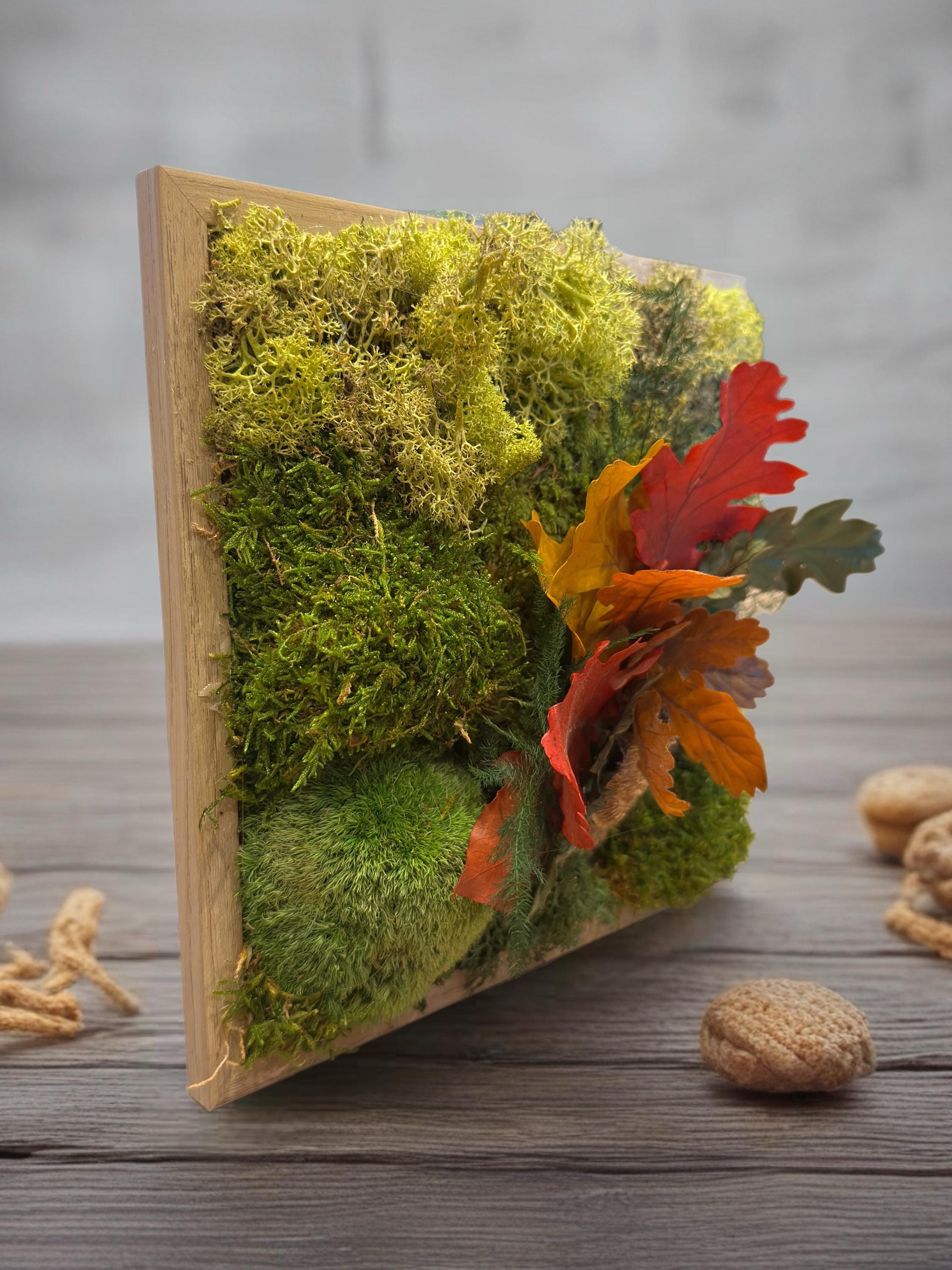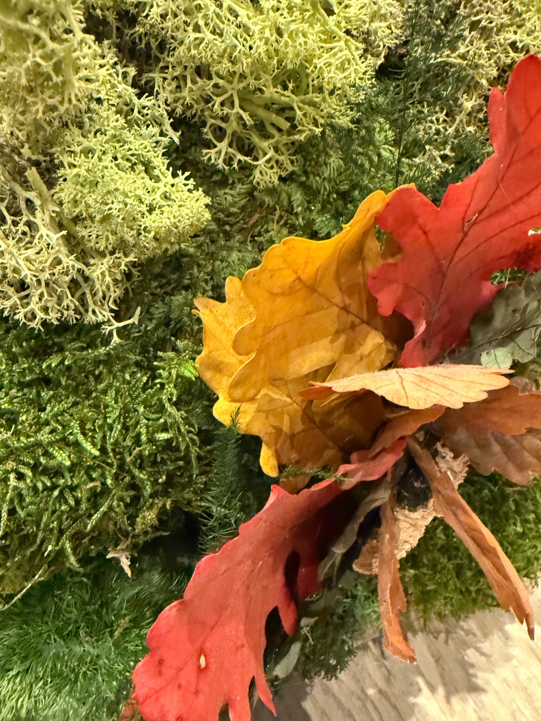 Réalisé à la main, il marie harmonieusement mousses stabilisées naturelles (mousse plate, mousse boule et lichen vert tendre) à un bouquet de feuilles de chêne aux teintes chaudes – rouge, orange, ocre et vert profond.