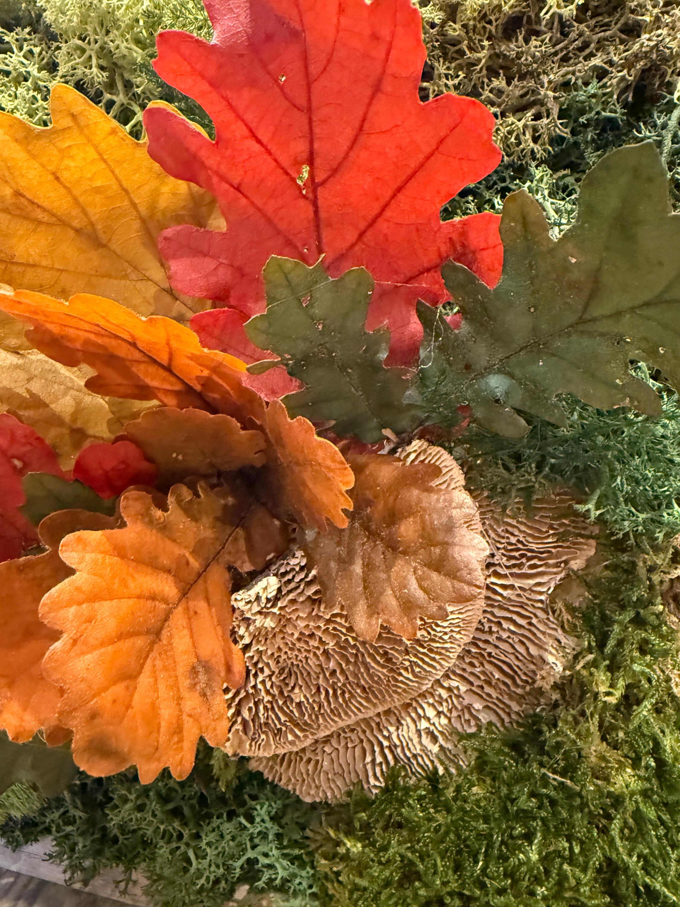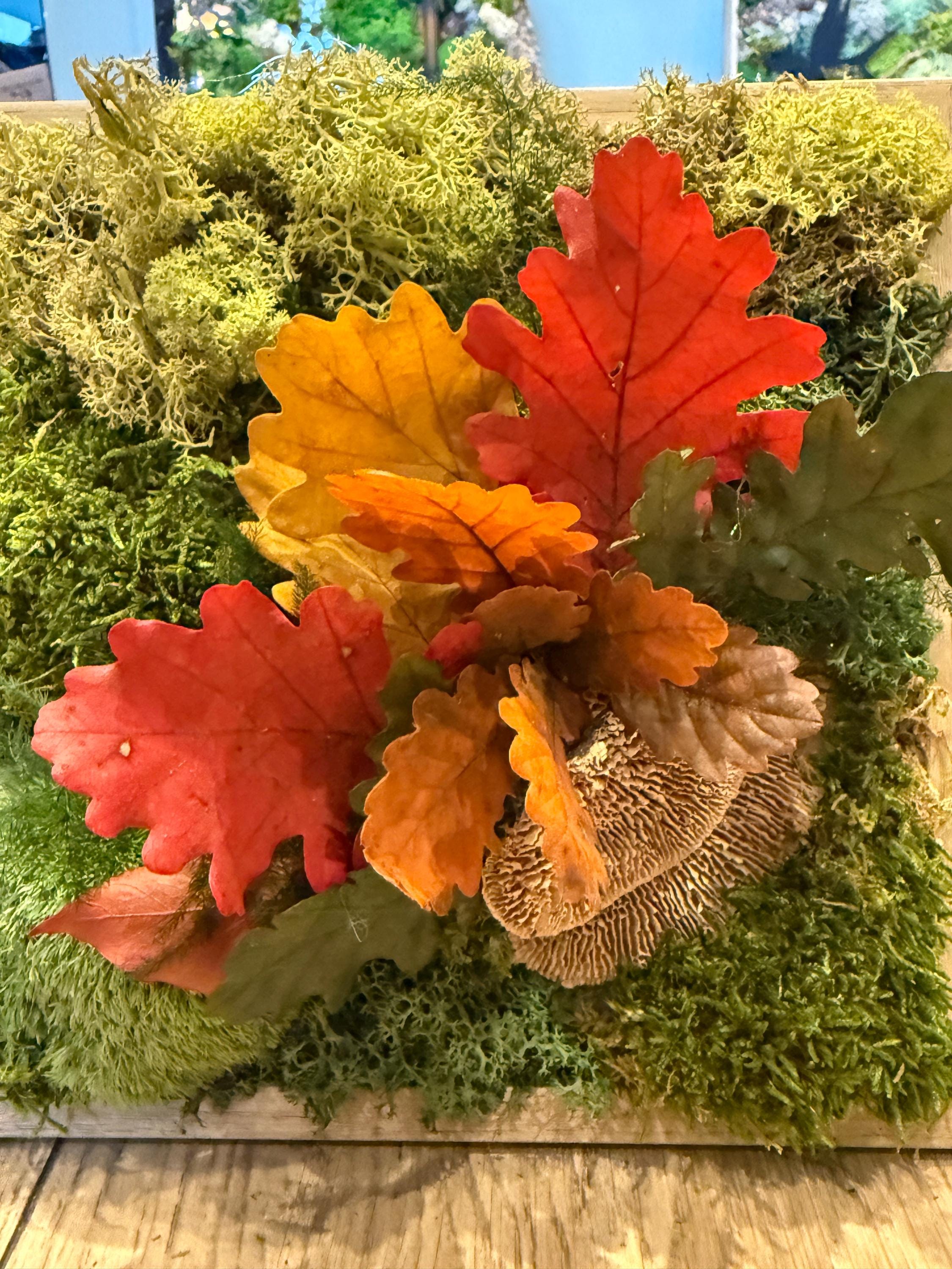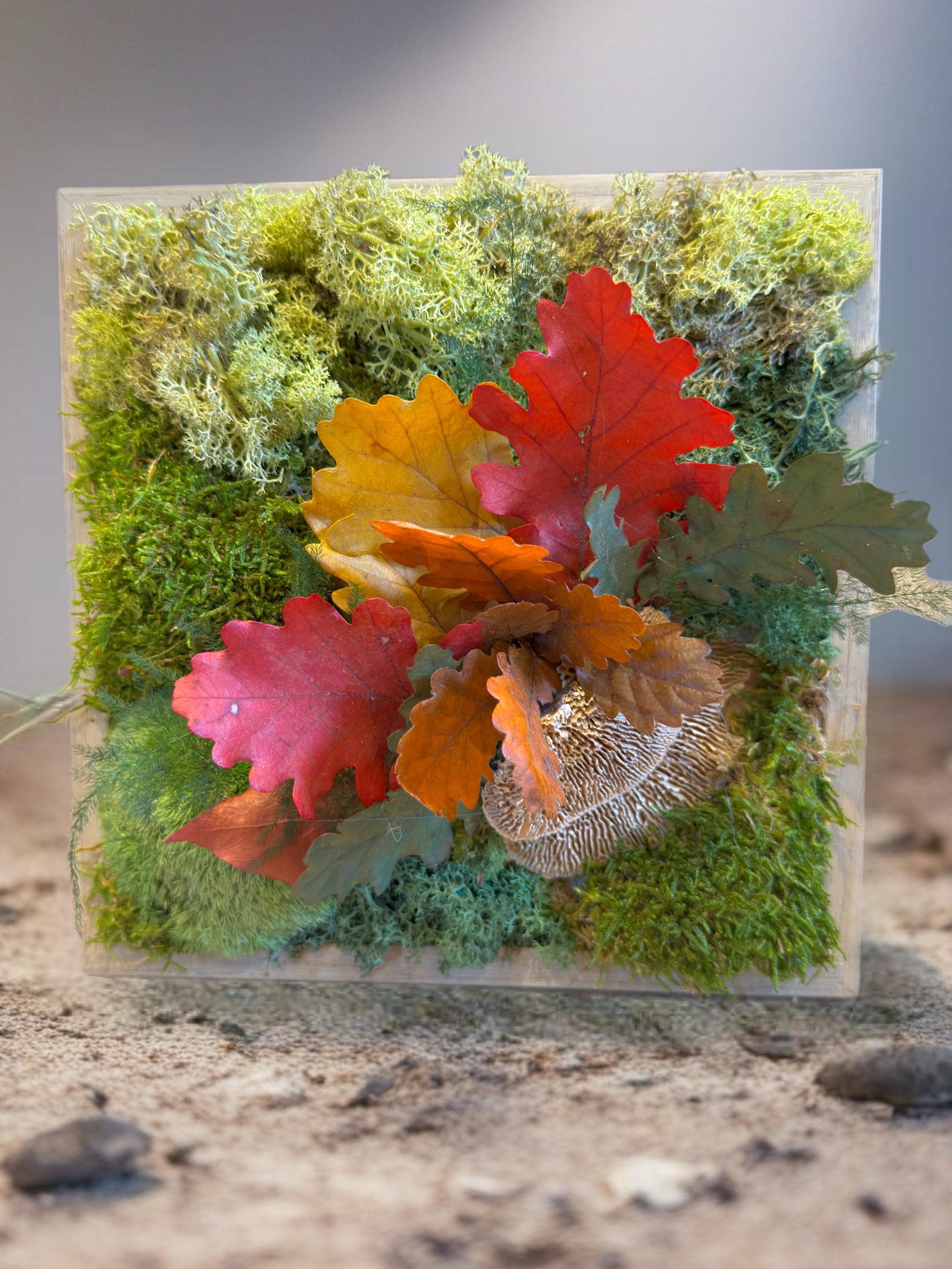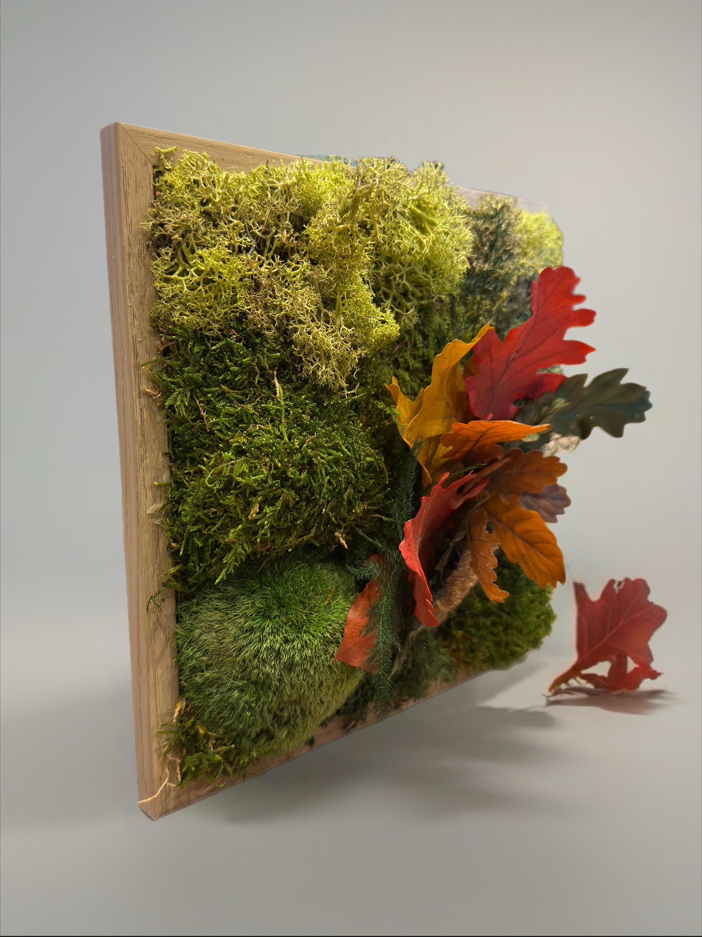 Réalisé à la main, il marie harmonieusement mousses stabilisées naturelles (mousse plate, mousse boule et lichen vert tendre) à un bouquet de feuilles de chêne aux teintes chaudes – rouge, orange, ocre et vert profond.