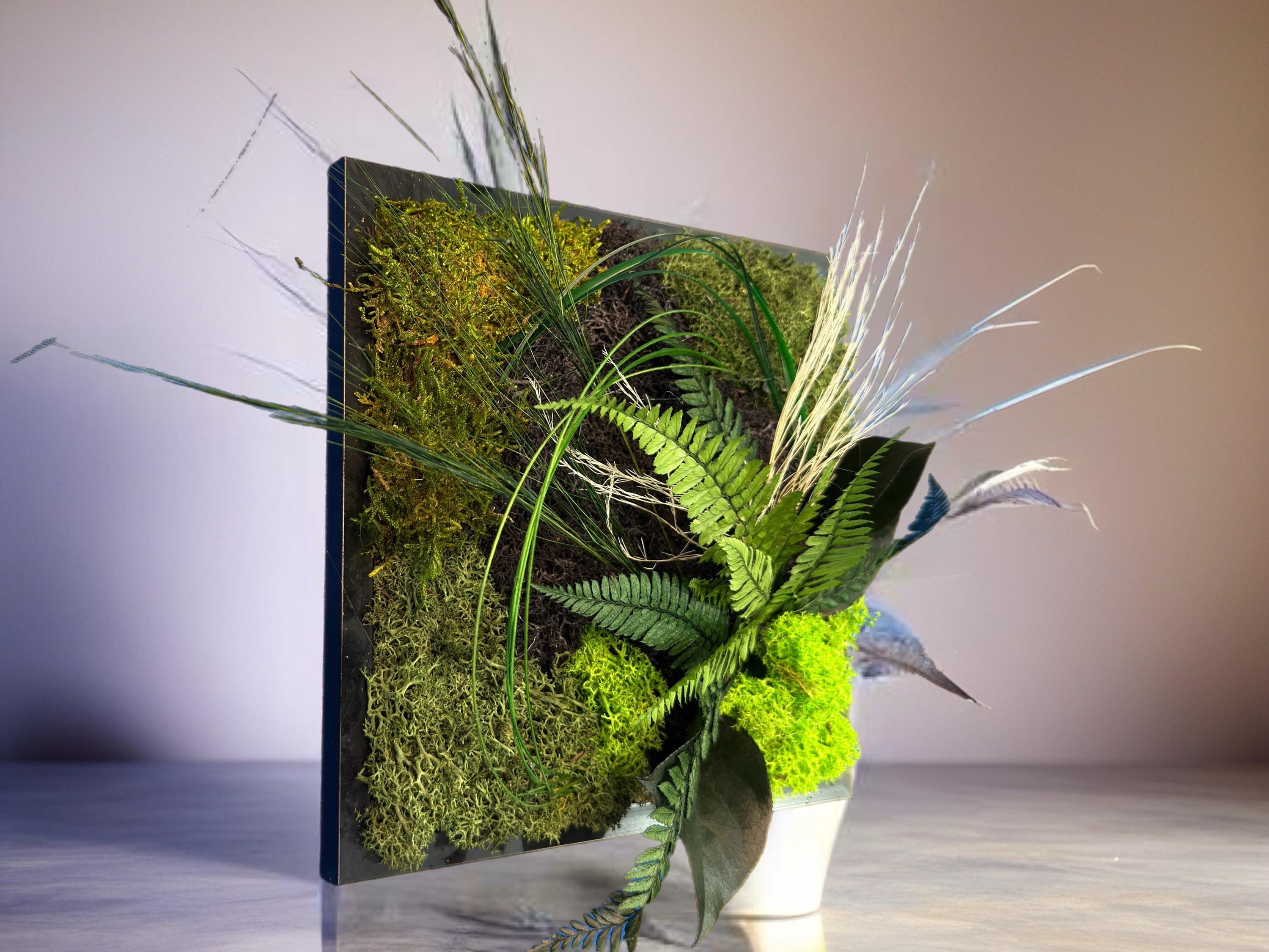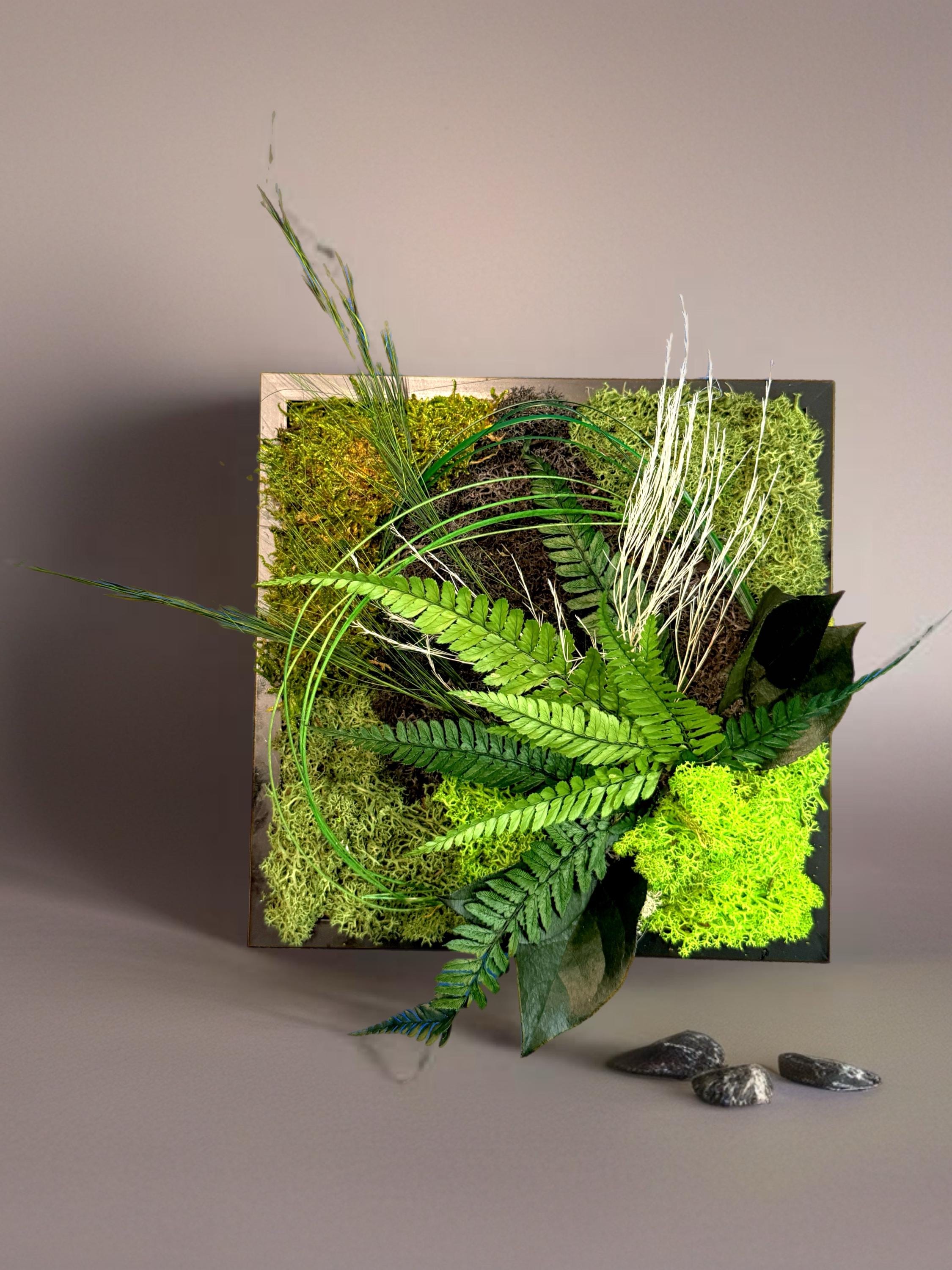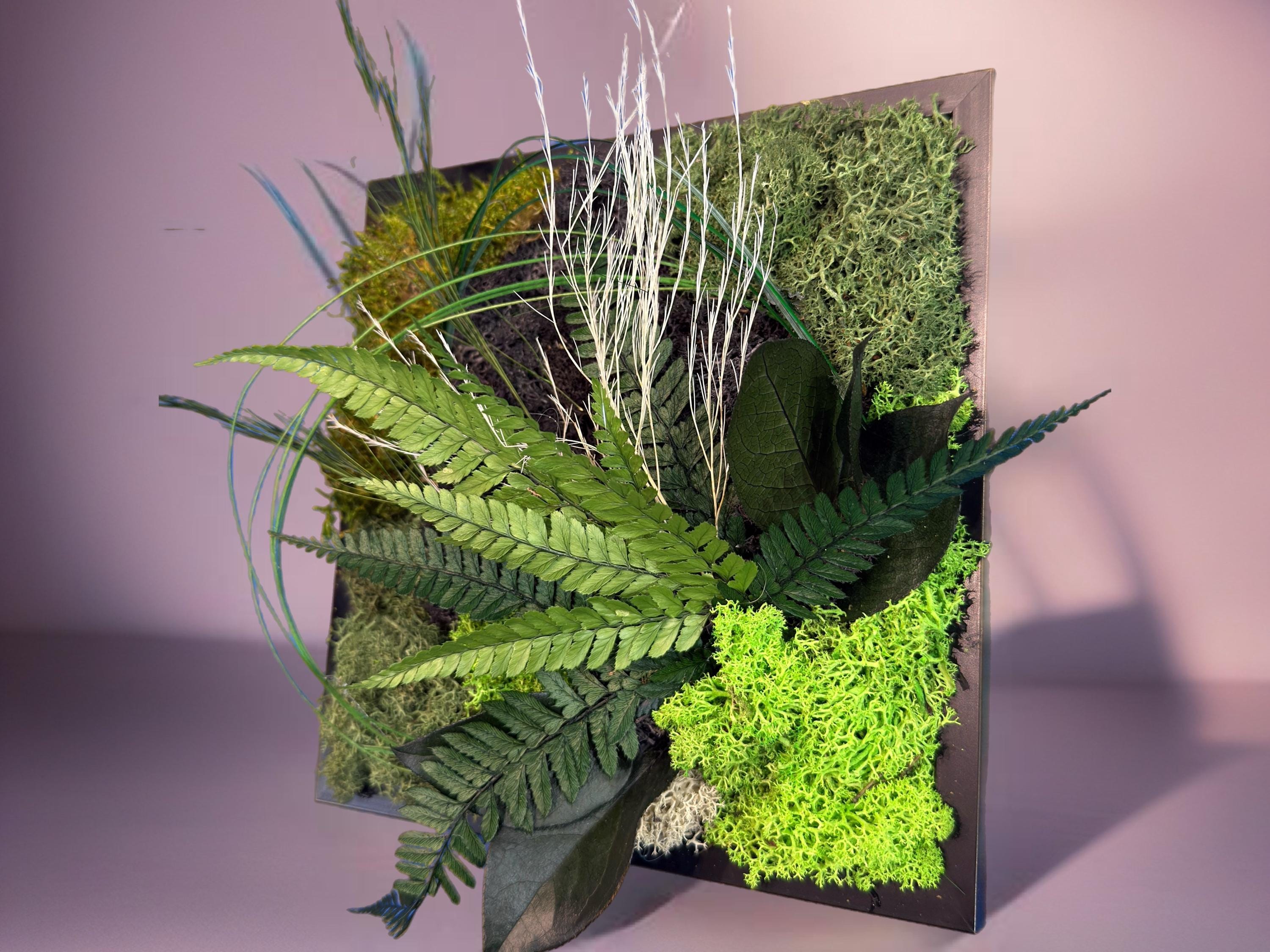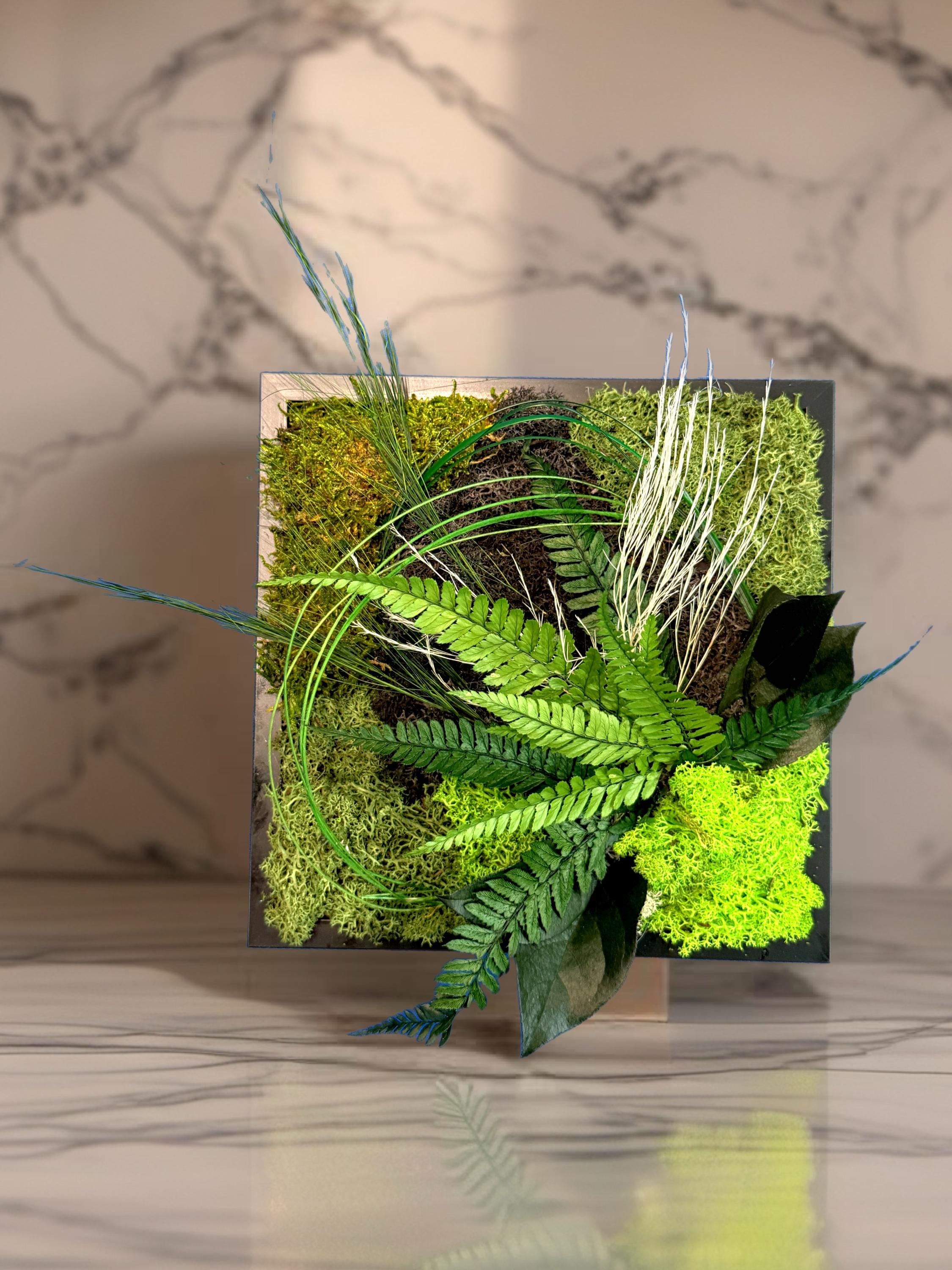 Plongez dans la sérénité de la nature avec ce cadre végétal stabilisé, une œuvre artisanale qui capture l’essence du vert sous toutes ses nuances.