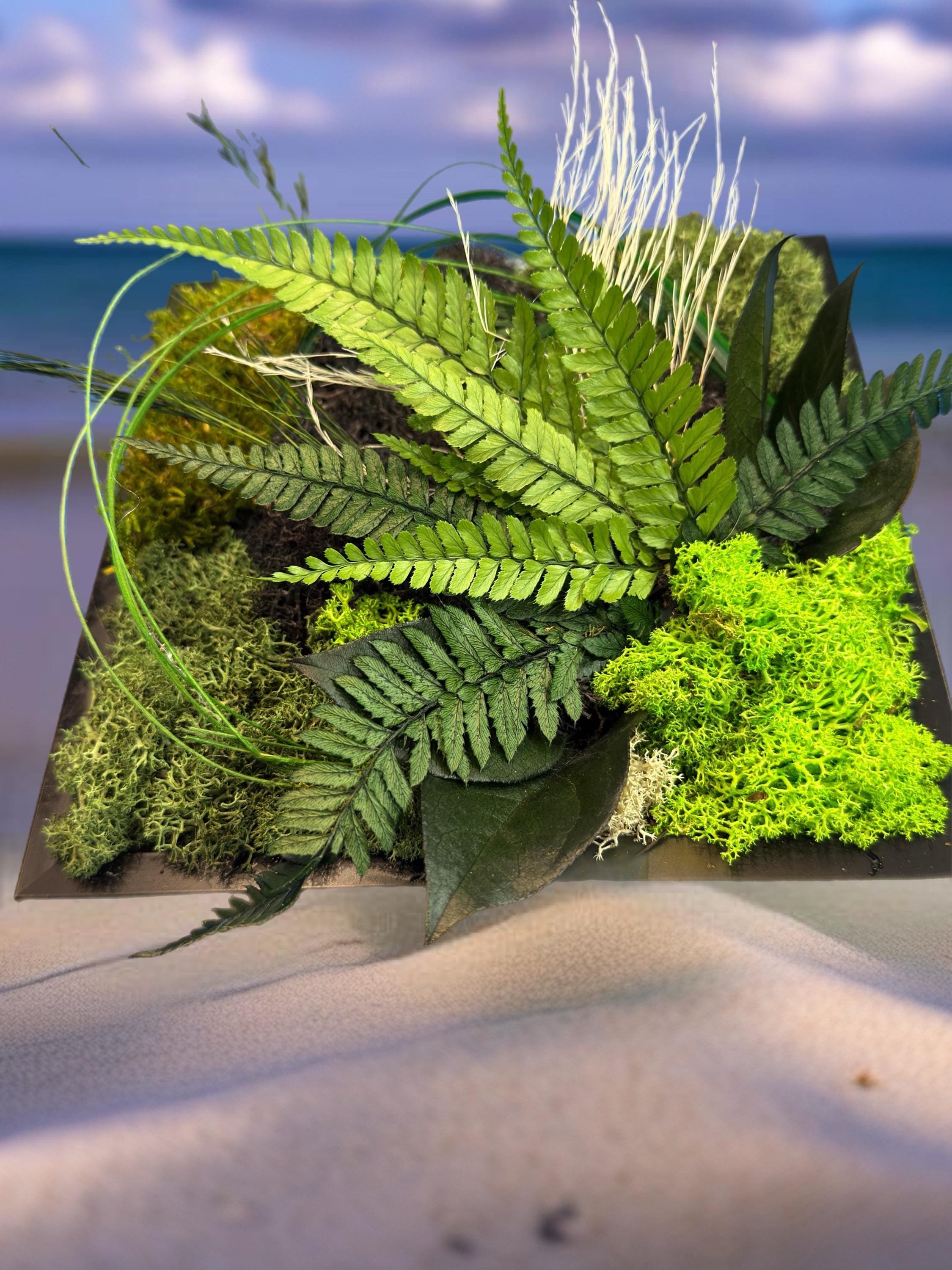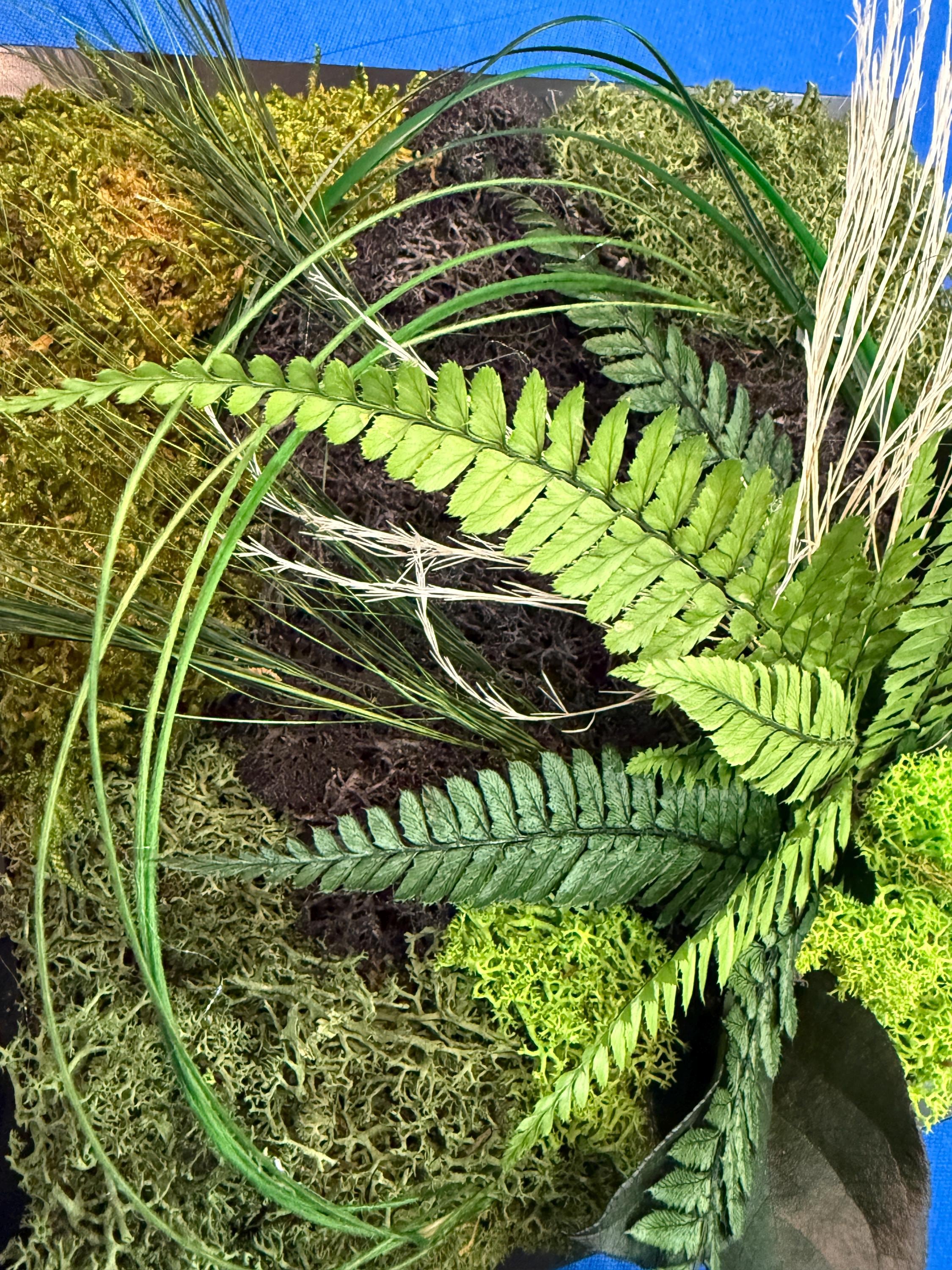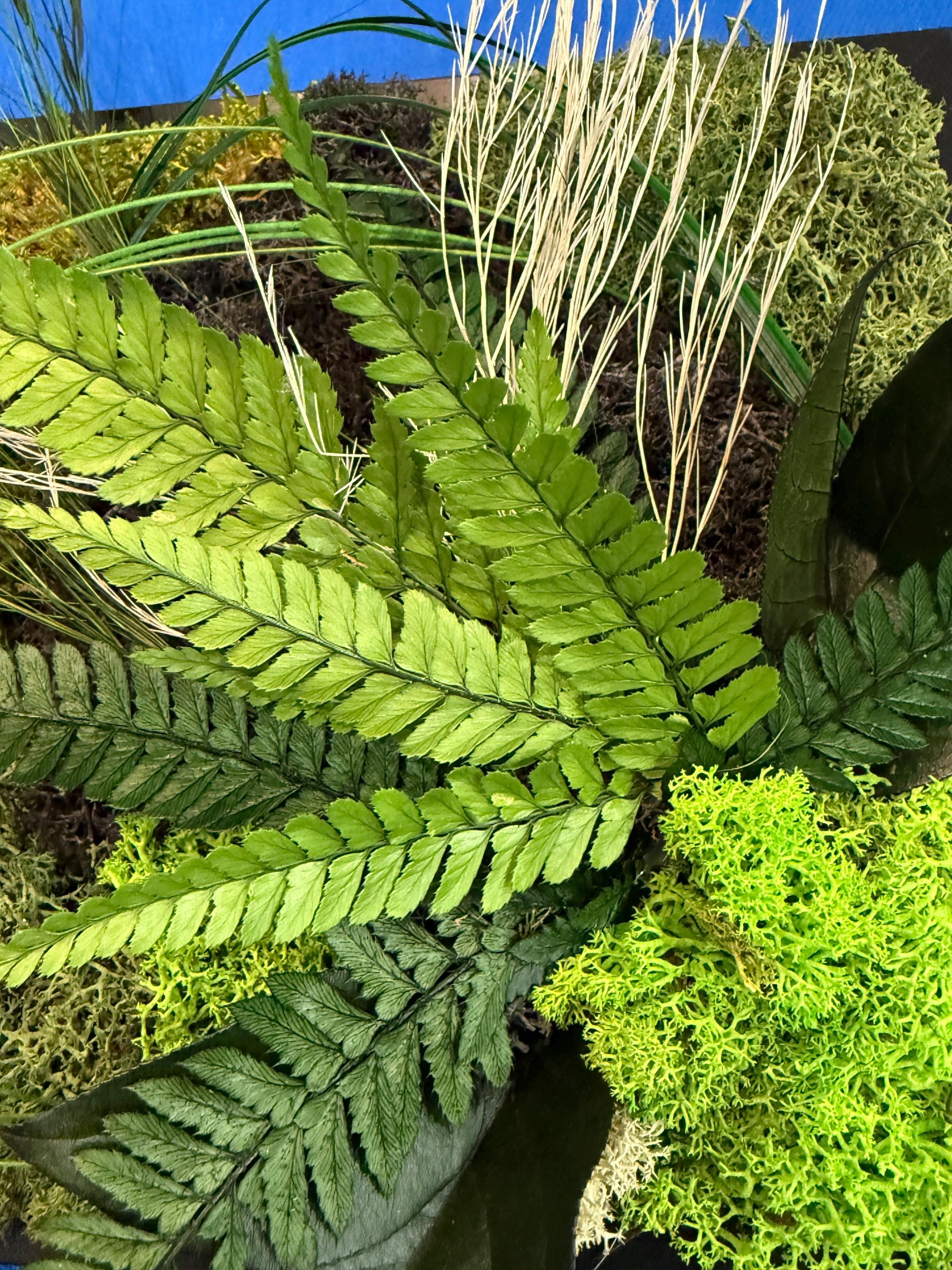 Chaque feuille, chaque mousse et chaque brin ont été soigneusement disposés pour créer un paysage végétal apaisant, où se mêlent fougères, lichens et herbes fines.