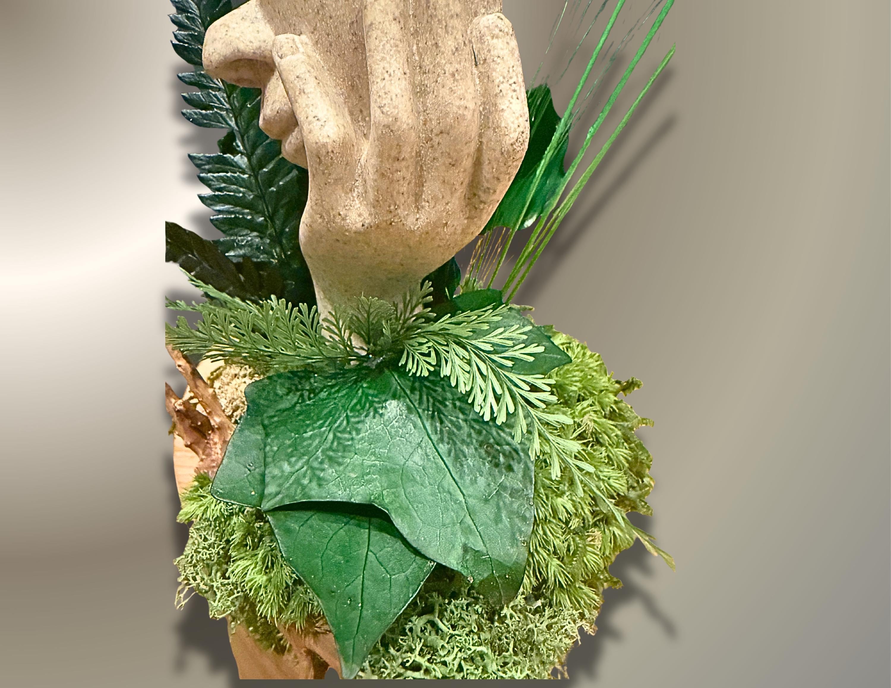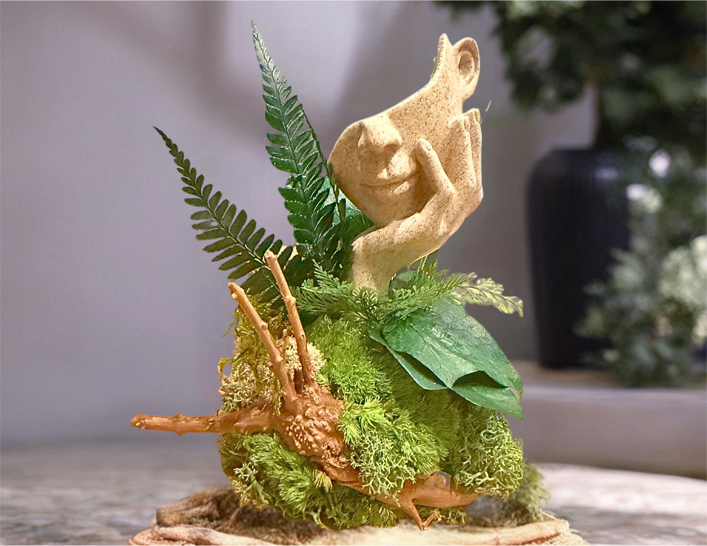 Elle associe une statue de visage contemporaine 🎠à une composition de mousses et feuillages stabilisés 🌿et une belle branche de bois flotté, pour une décoration qui marie l’art et la nature.