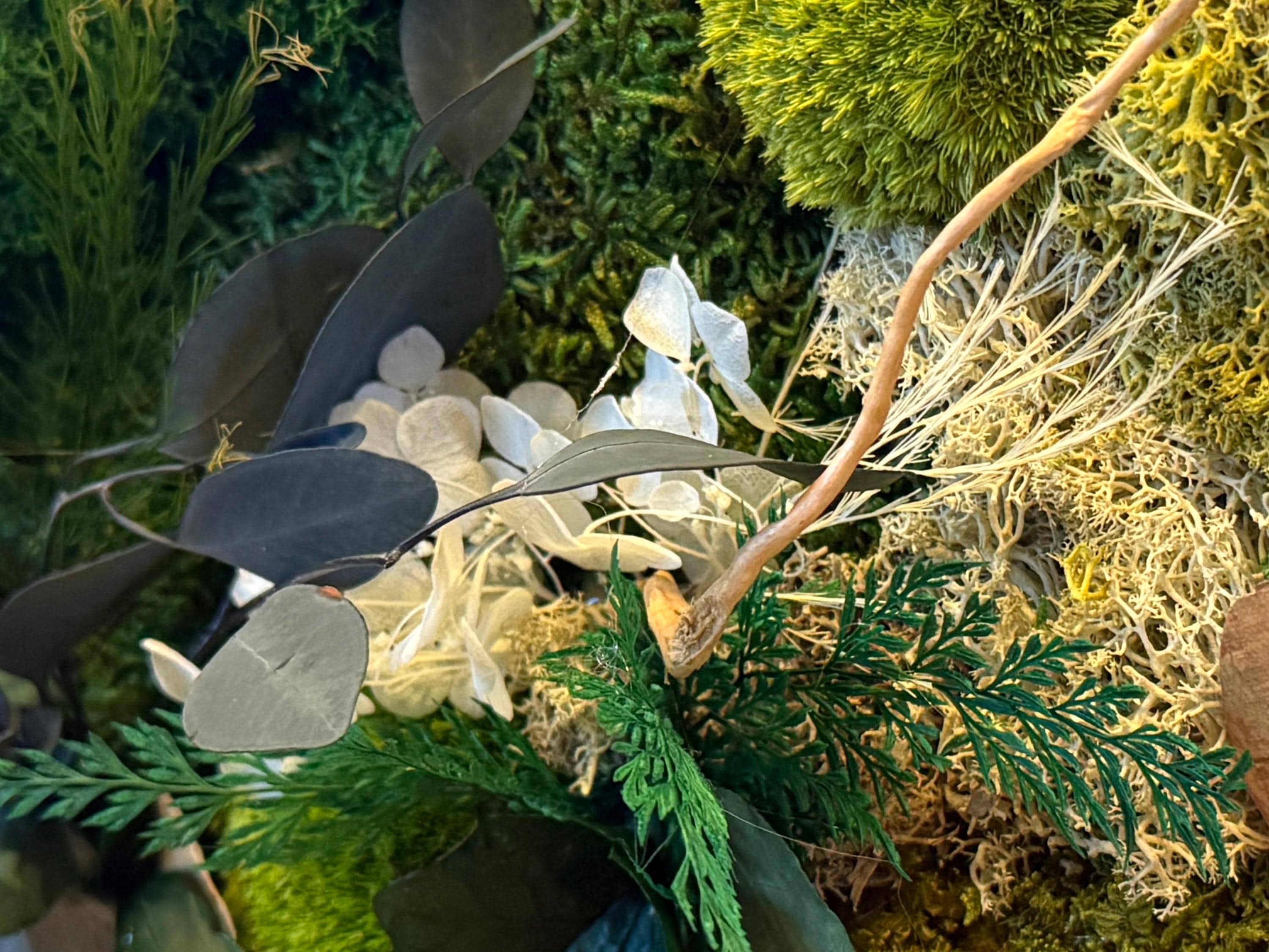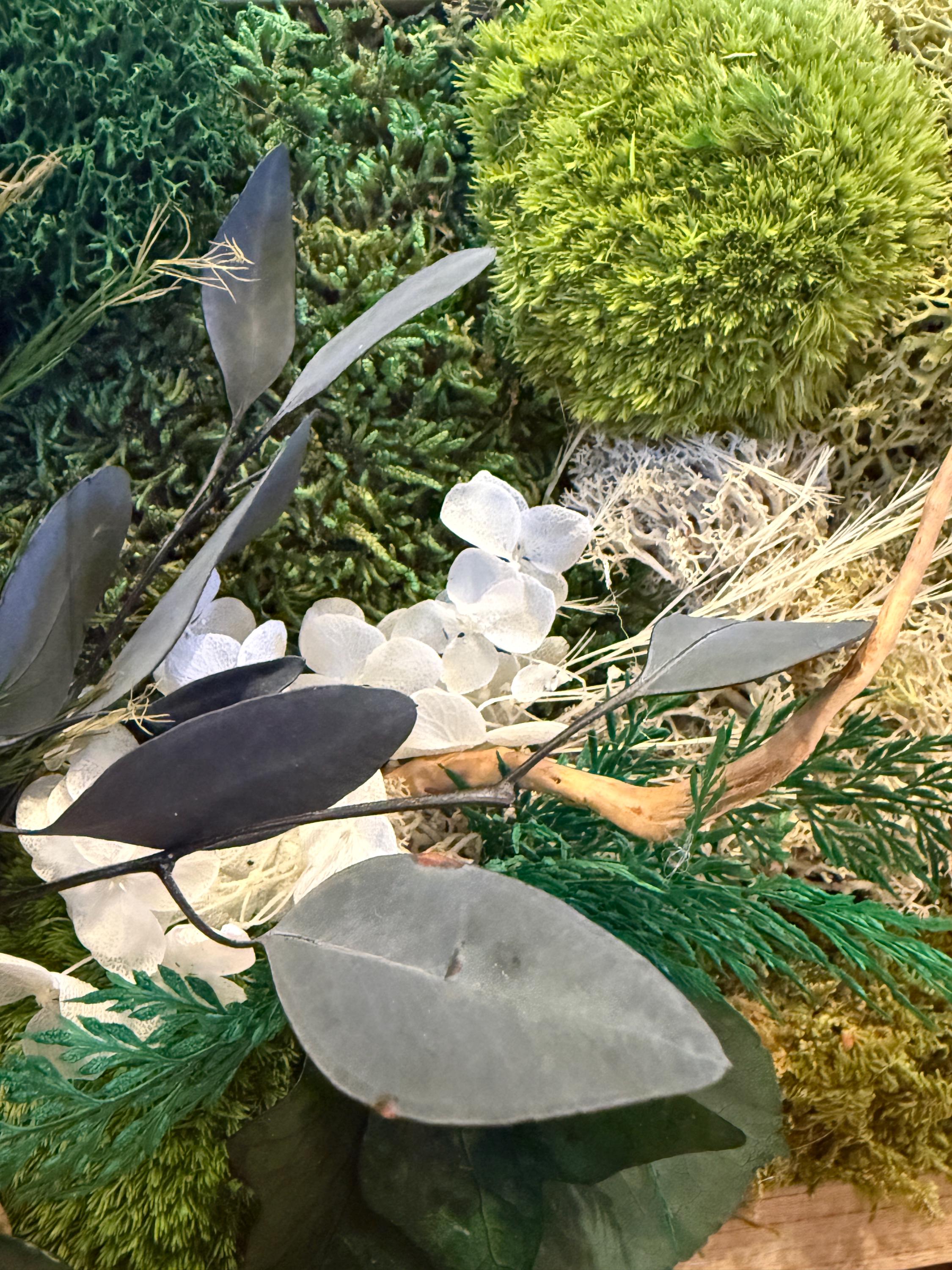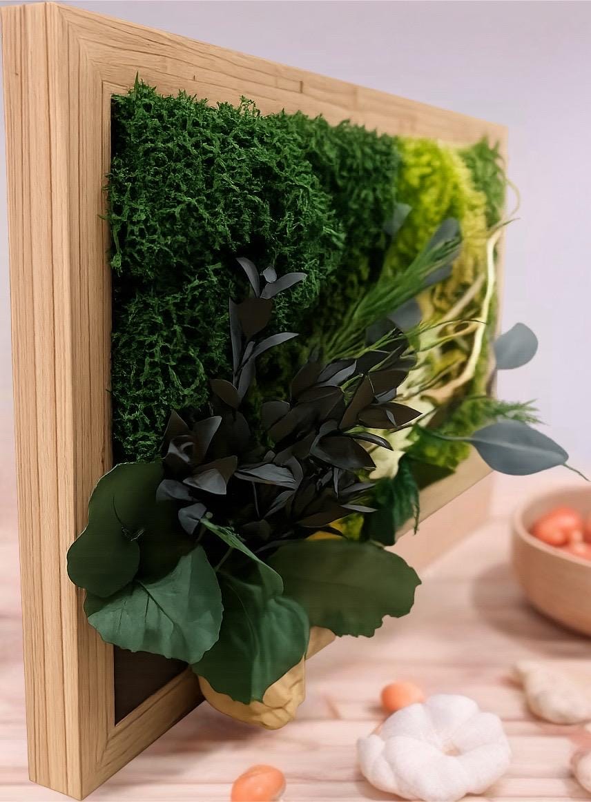 Chaque cadre est une pièce unique, travaillée avec soin pour mettre en valeur la richesse des textures : mousses moelleuses, feuillages délicats et éléments naturels se mêlent harmonieusement. Ce tableau végétal est parfait pour :