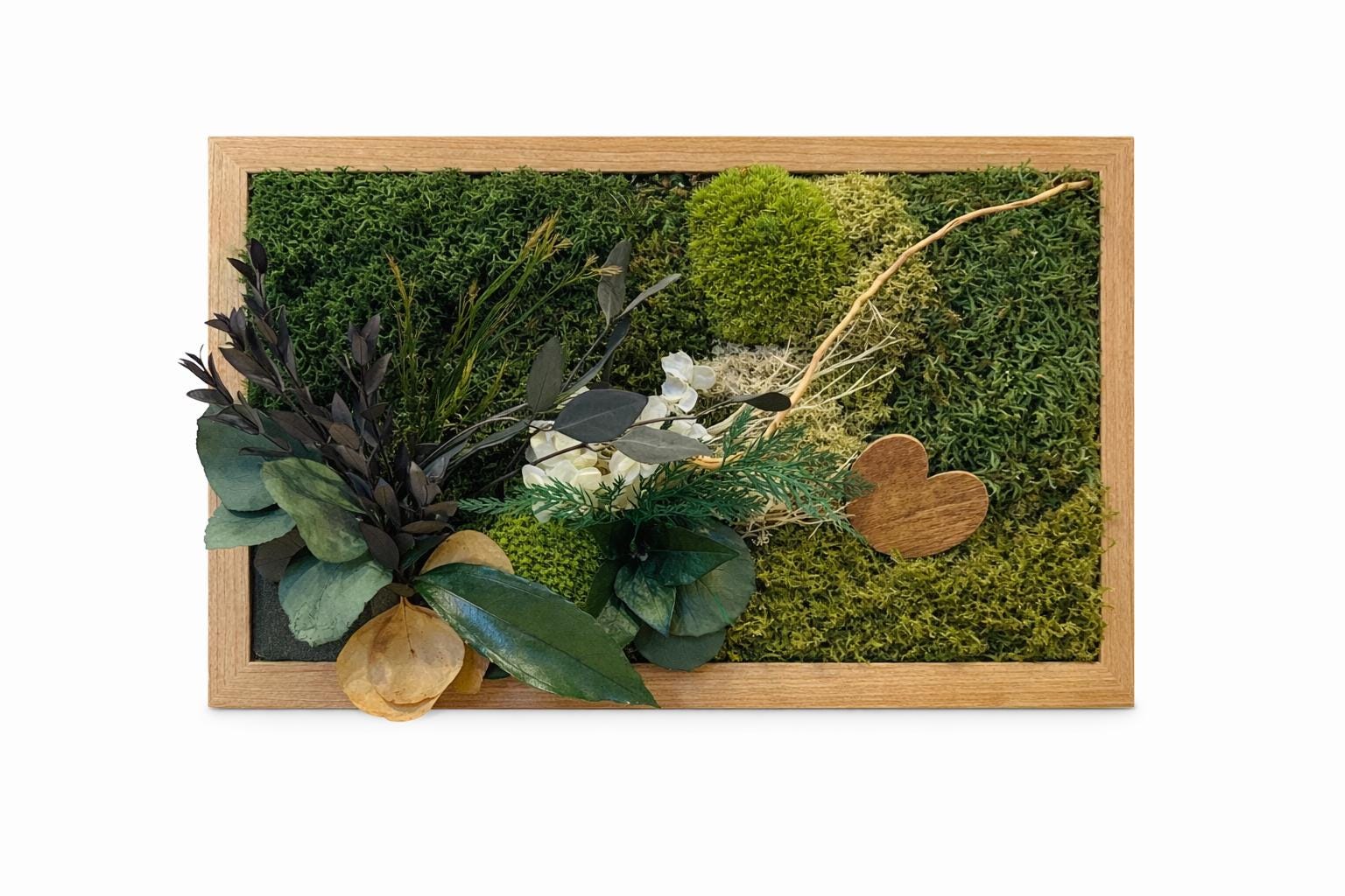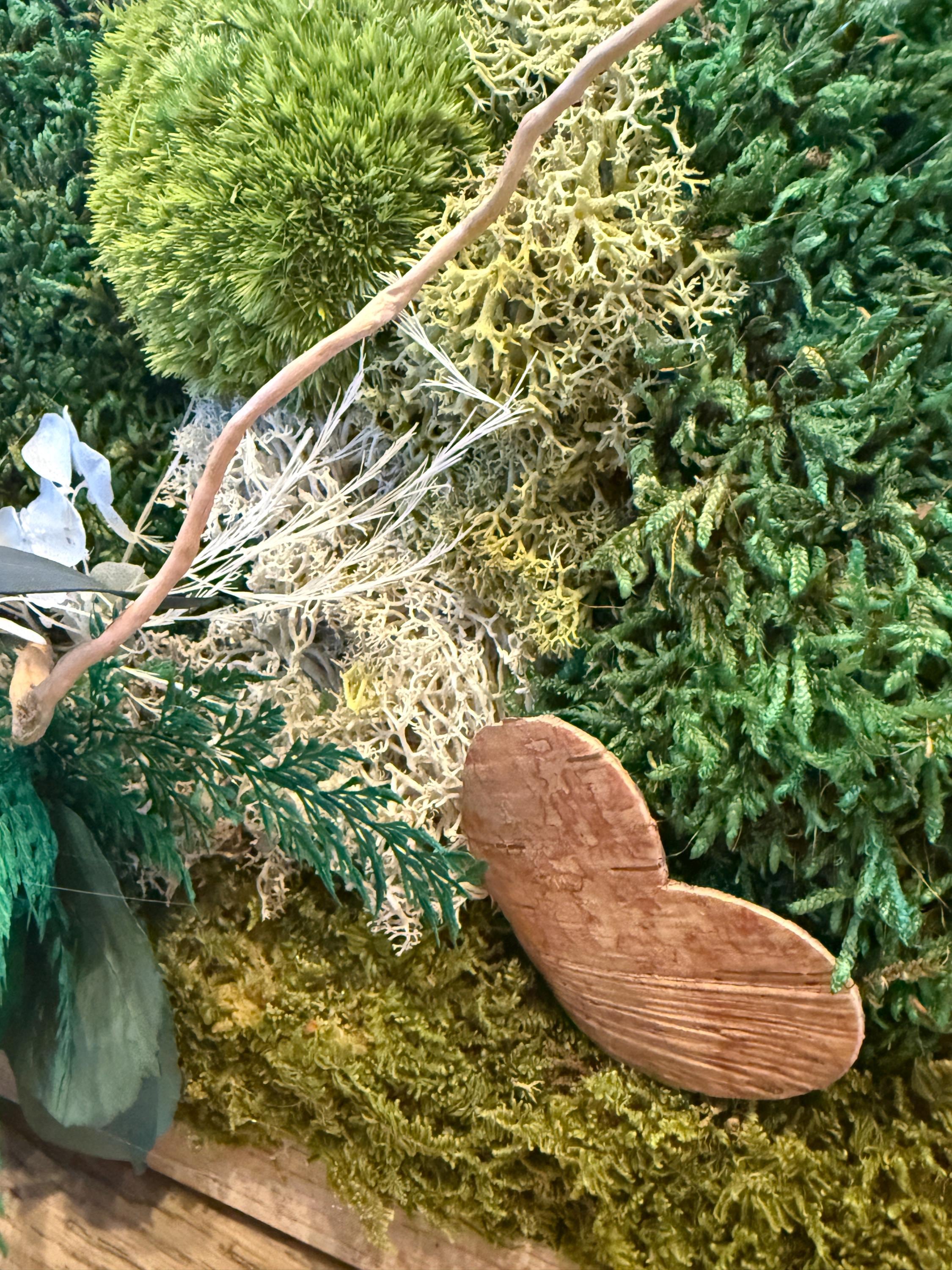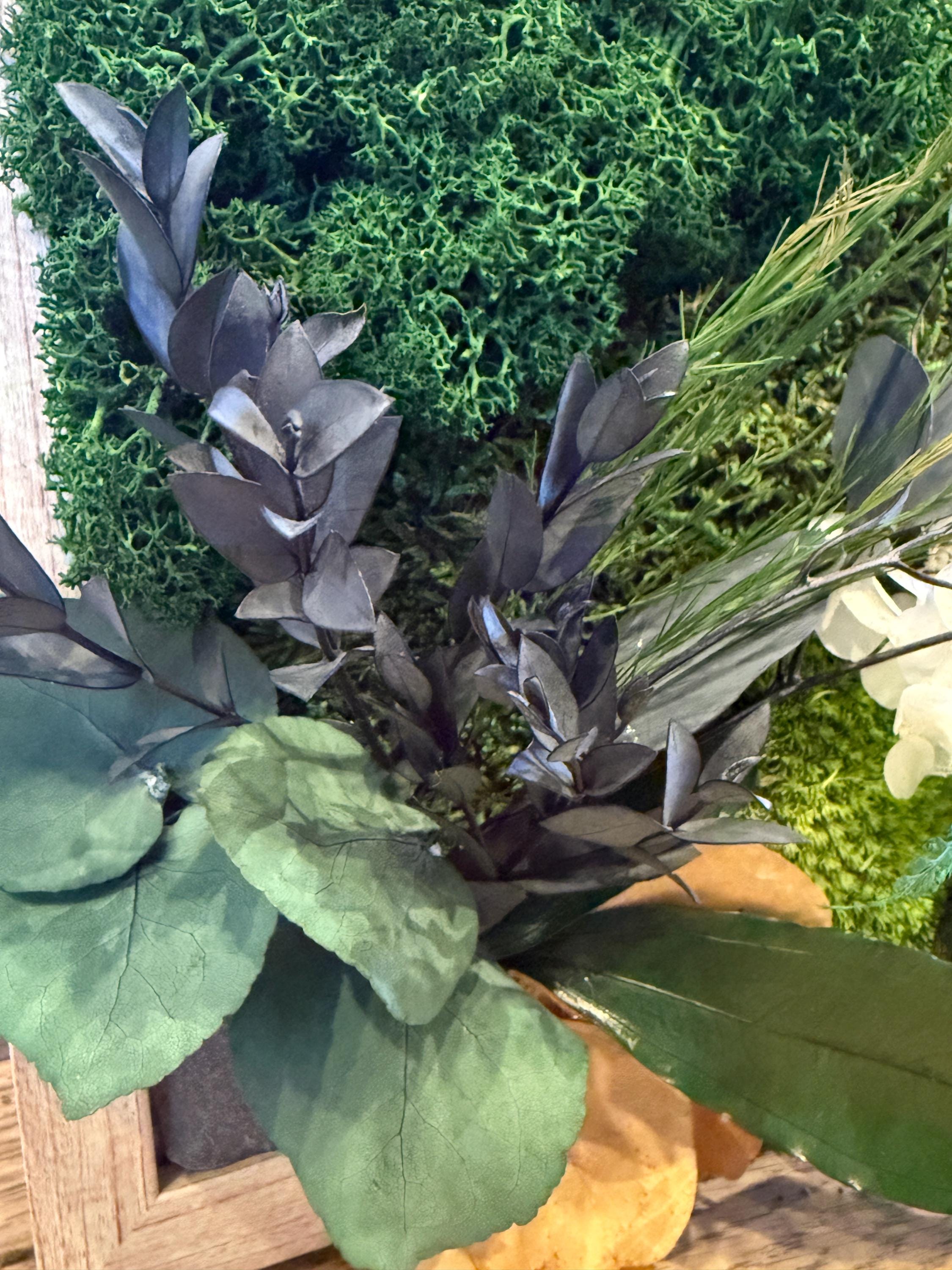 Chaque cadre est une pièce unique, travaillée avec soin pour mettre en valeur la richesse des textures : mousses moelleuses, feuillages délicats et éléments naturels se mêlent harmonieusement. Ce tableau végétal est parfait pour :