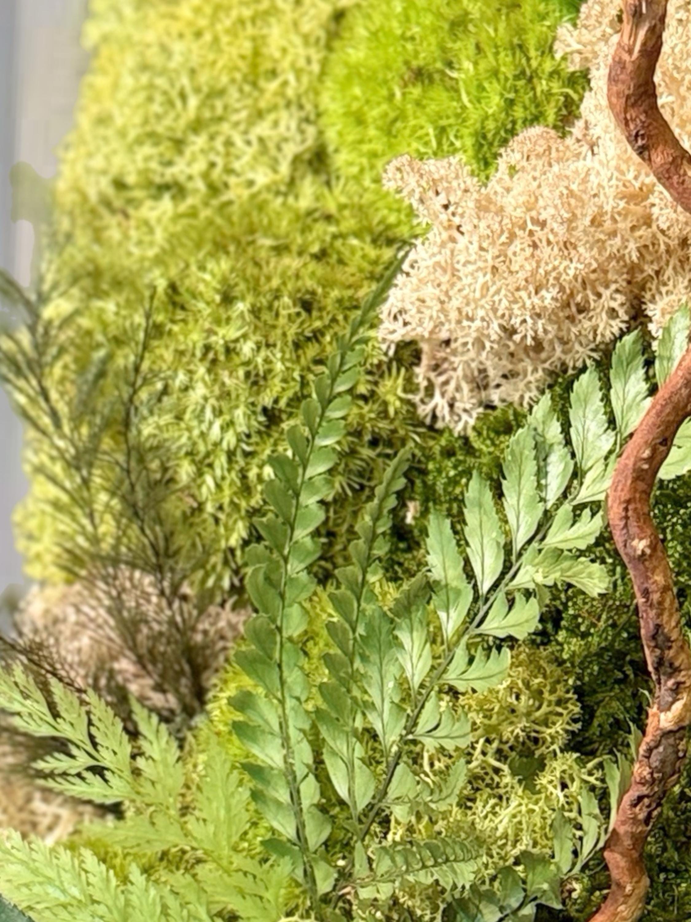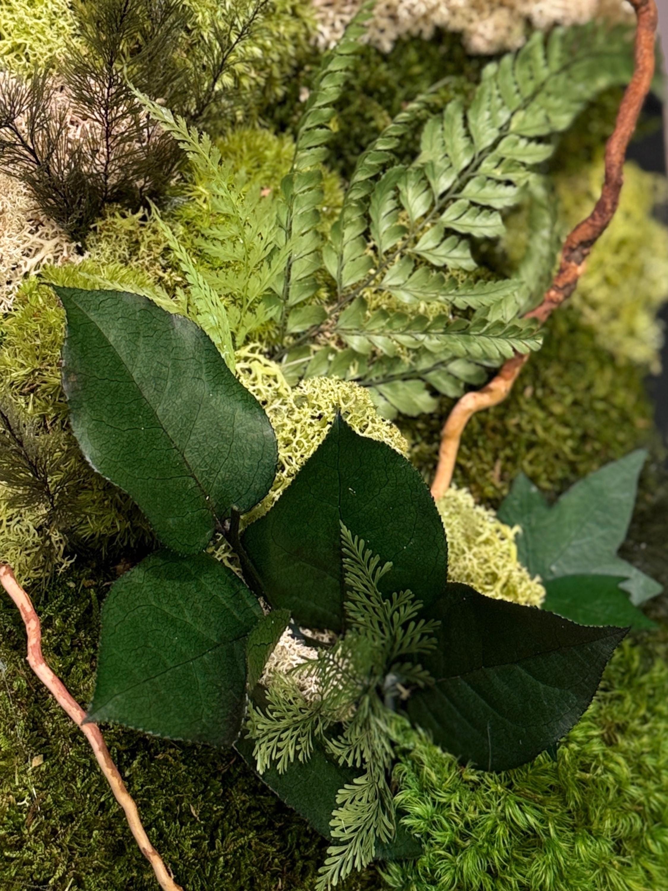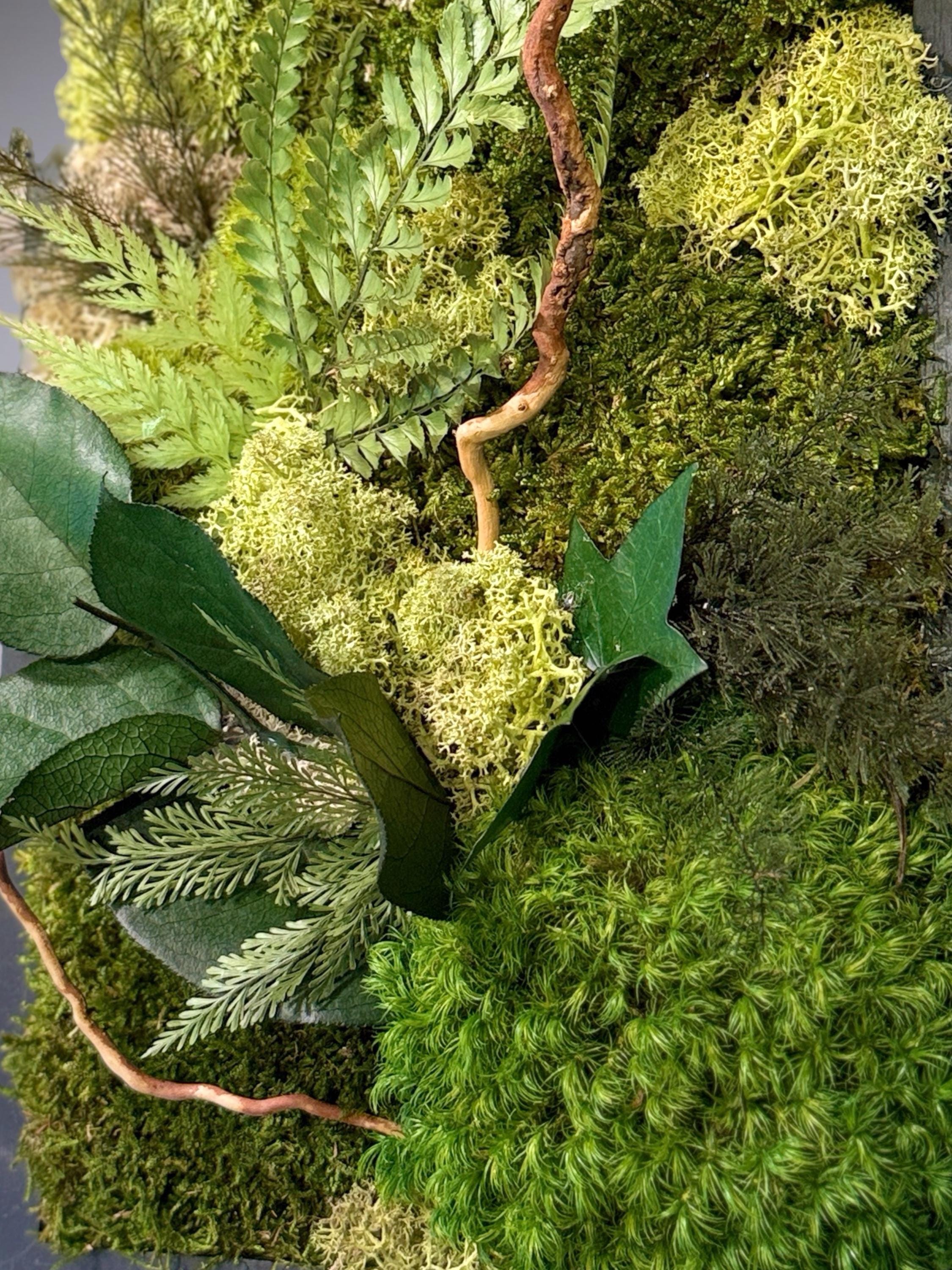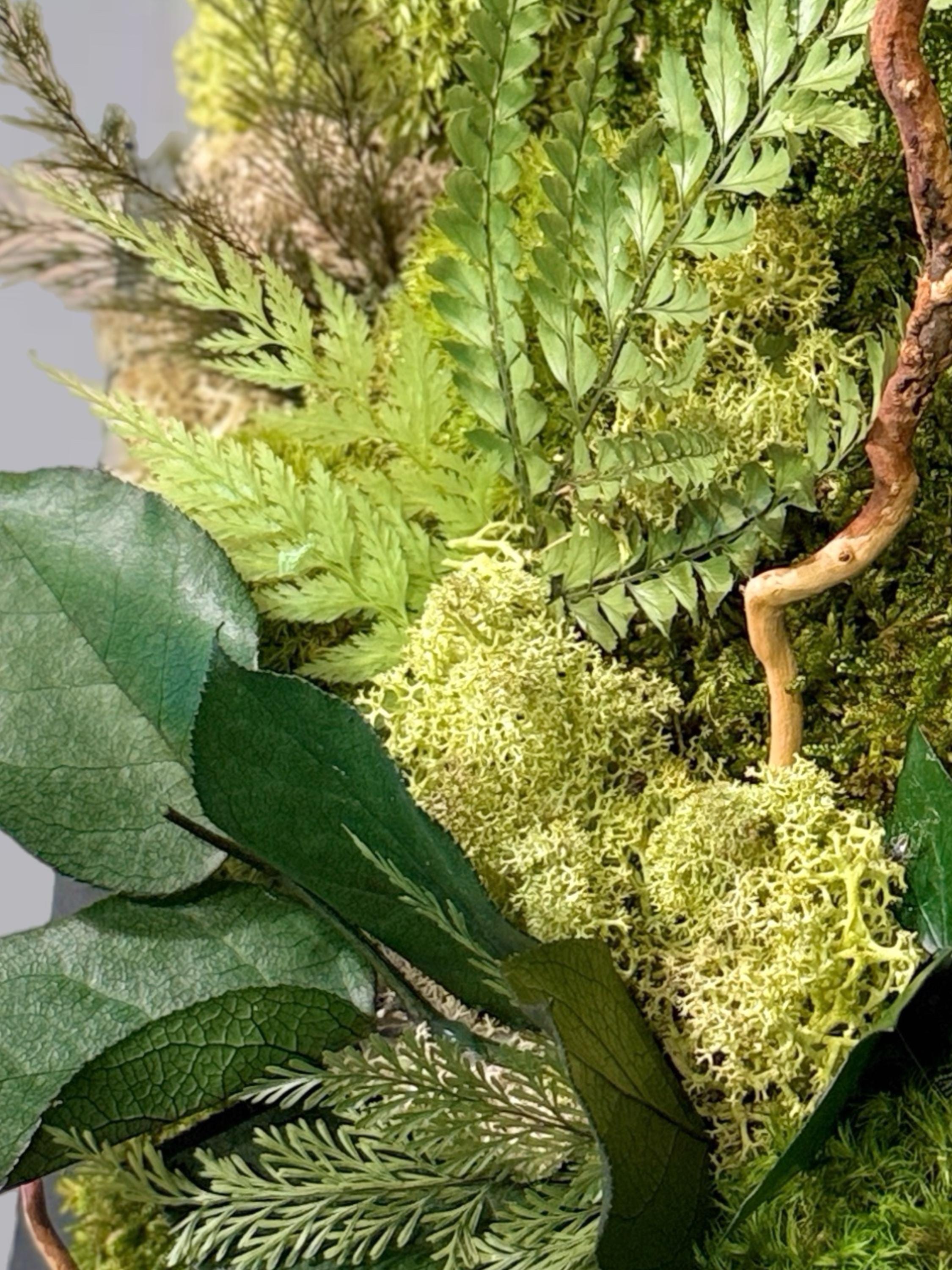 Chaque composition est unique, réalisée à la main avec des végétaux stabilisés : mousse plate, mousse de renne, lichen beige, fougère et eucalyptus.