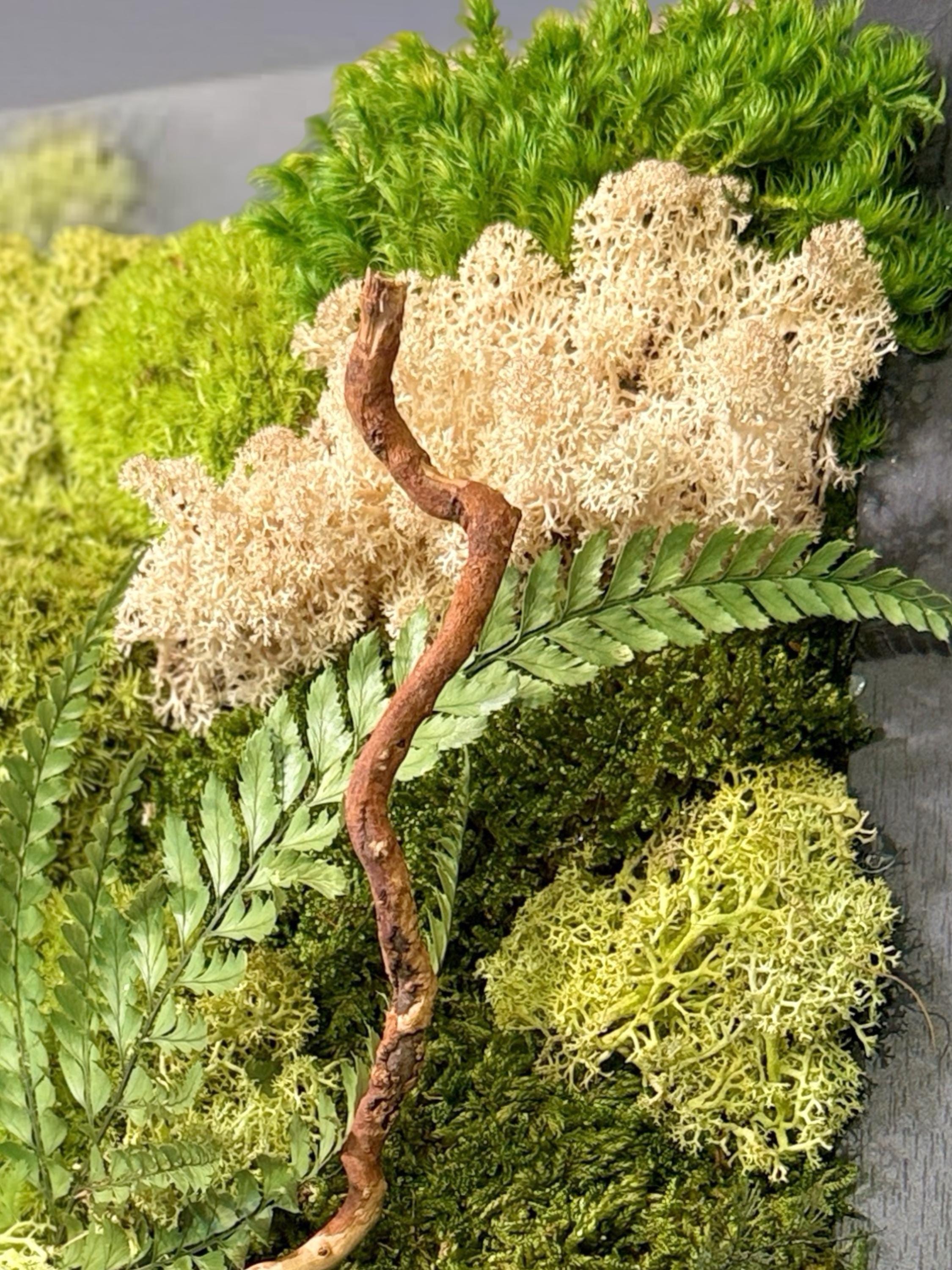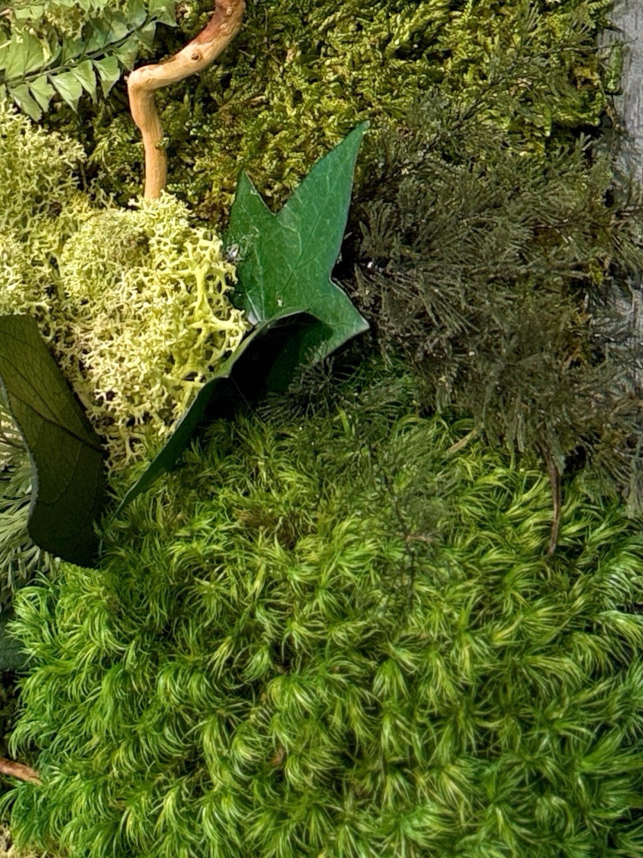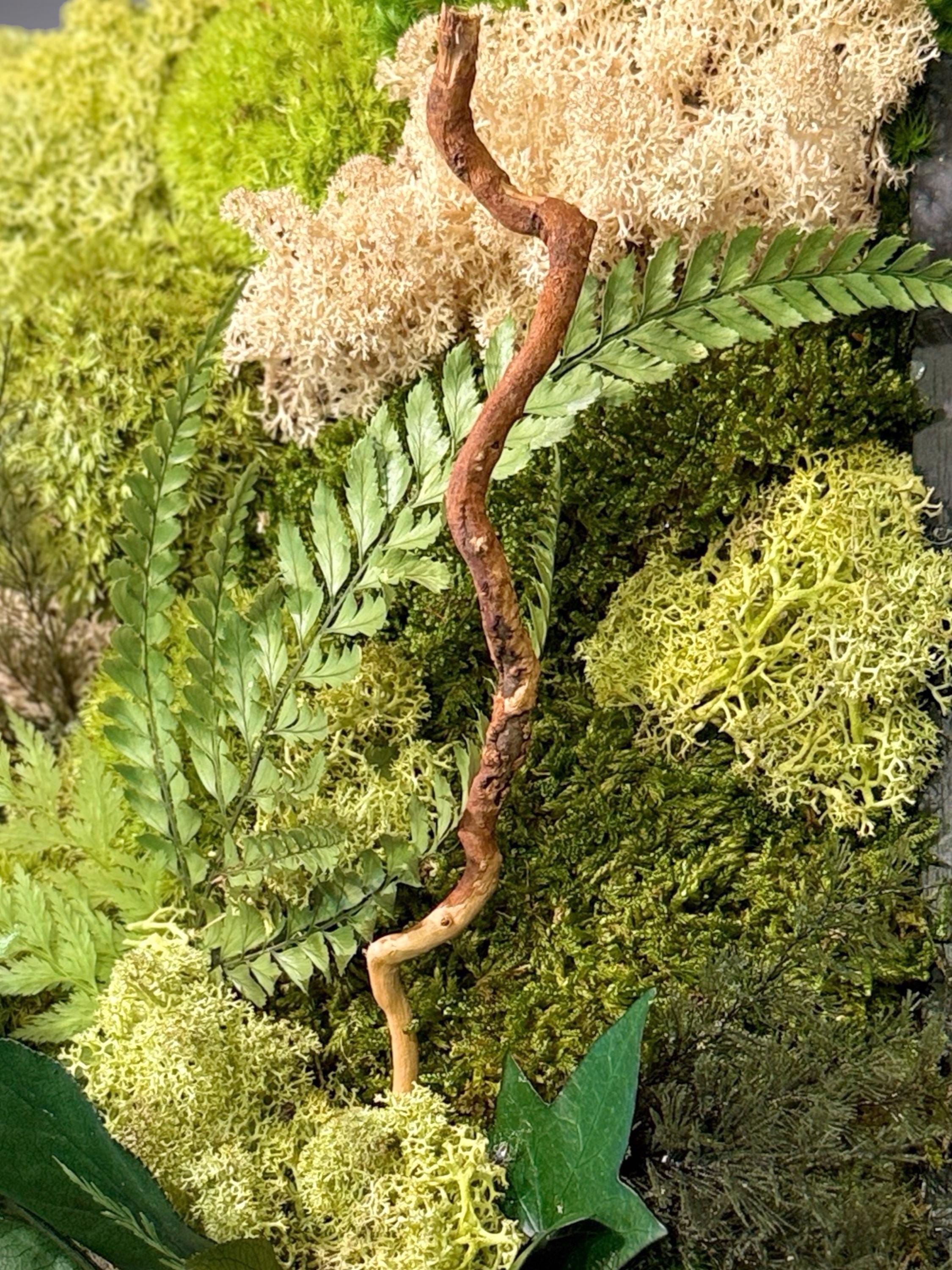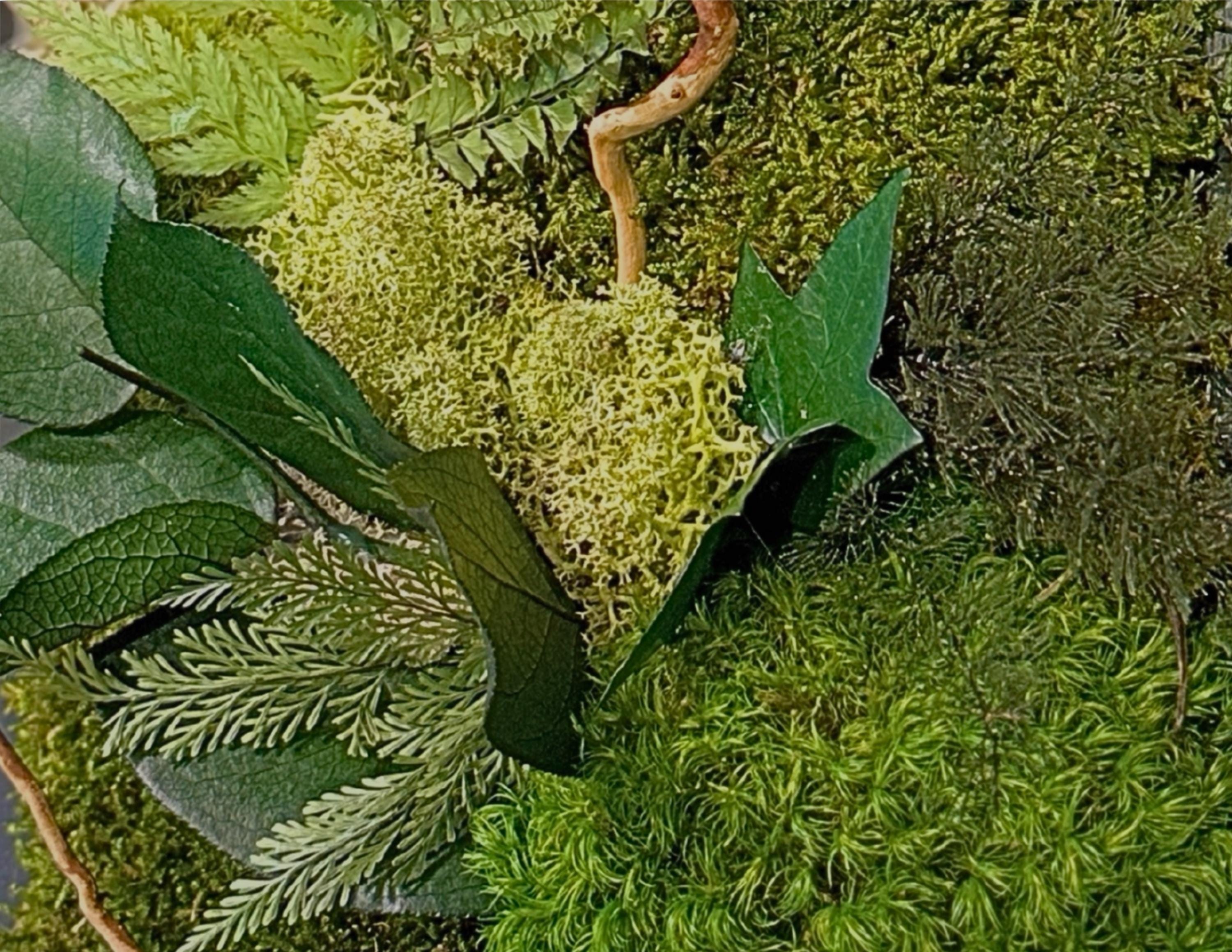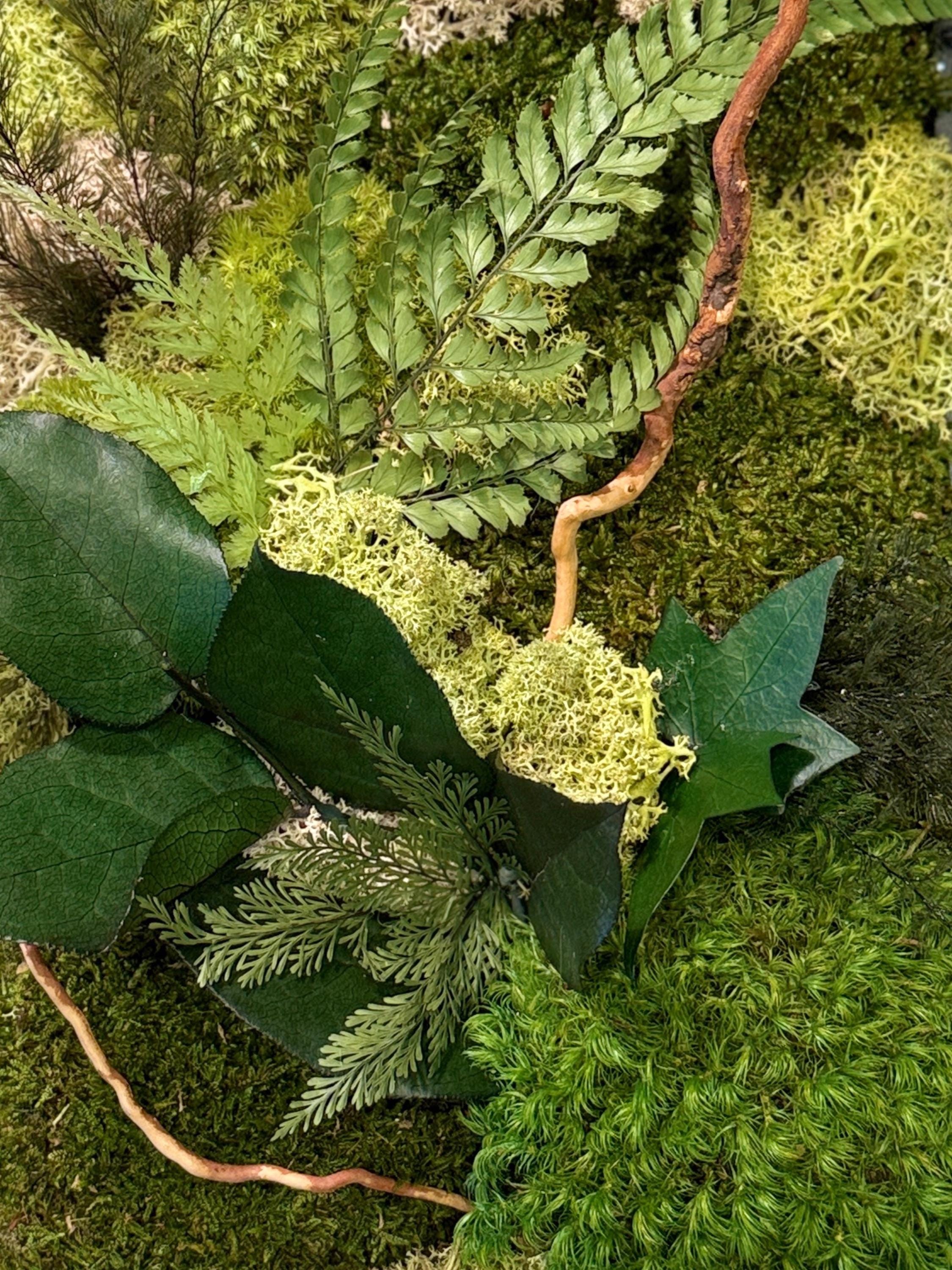 Chaque composition est unique, réalisée à la main avec des végétaux stabilisés : mousse plate, mousse de renne, lichen beige, fougère et eucalyptus.