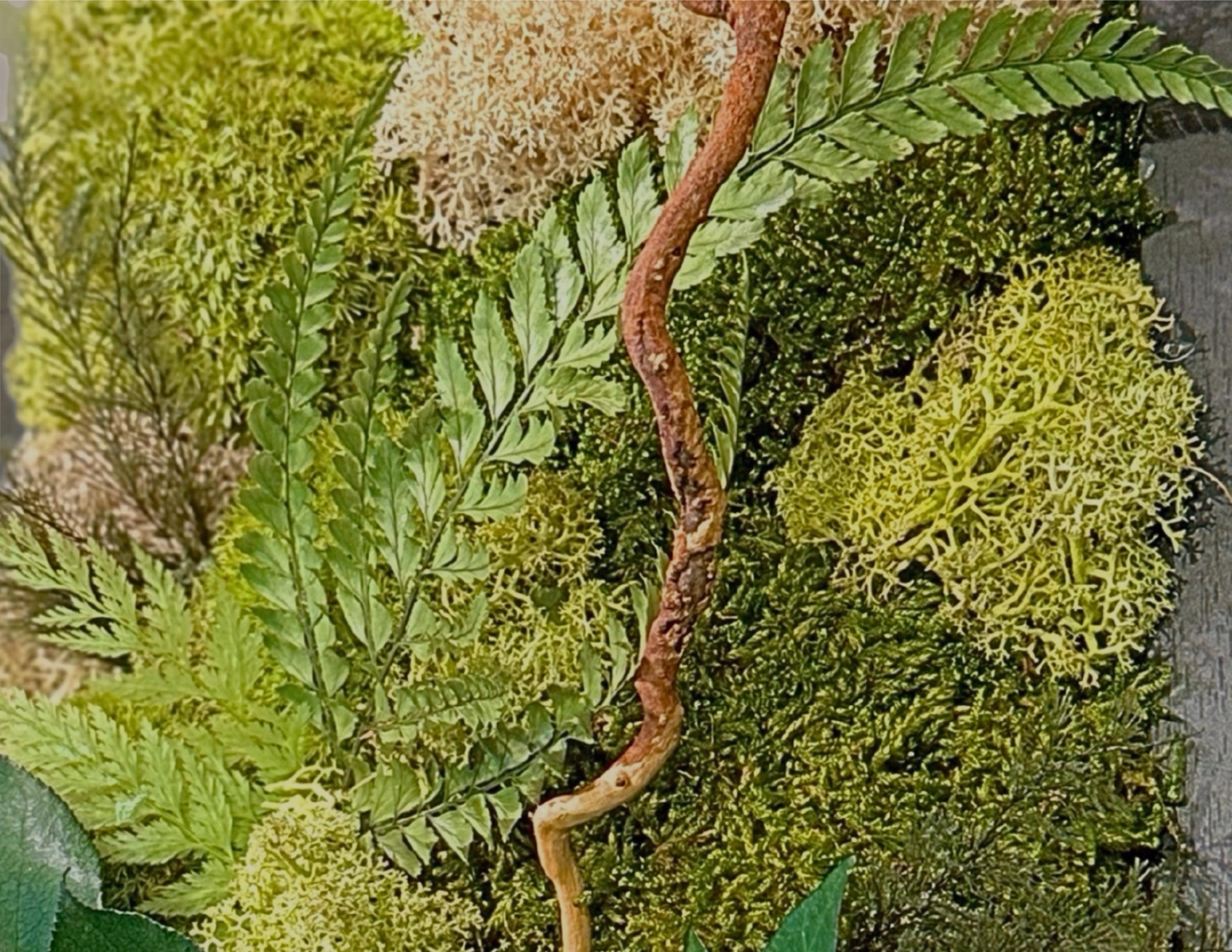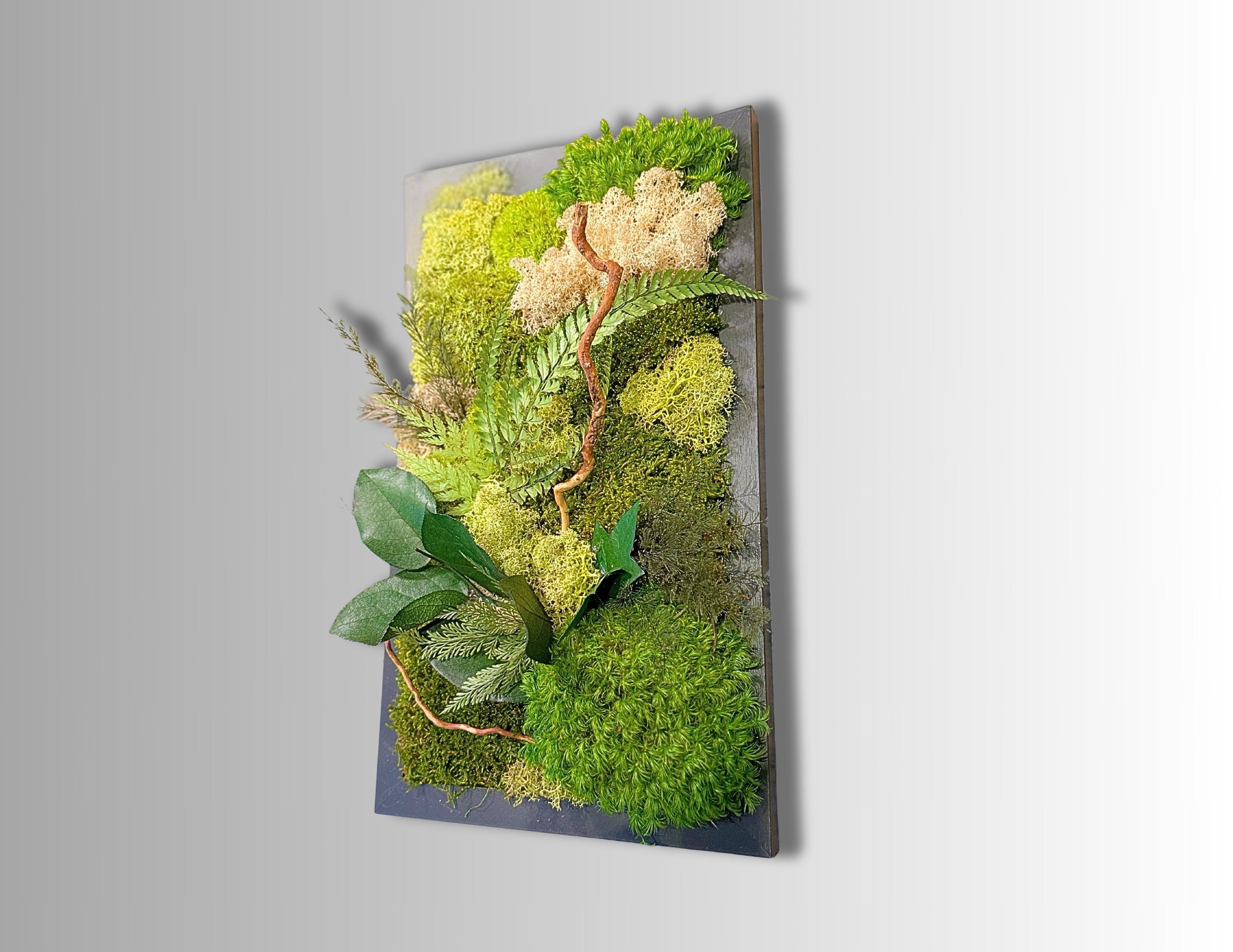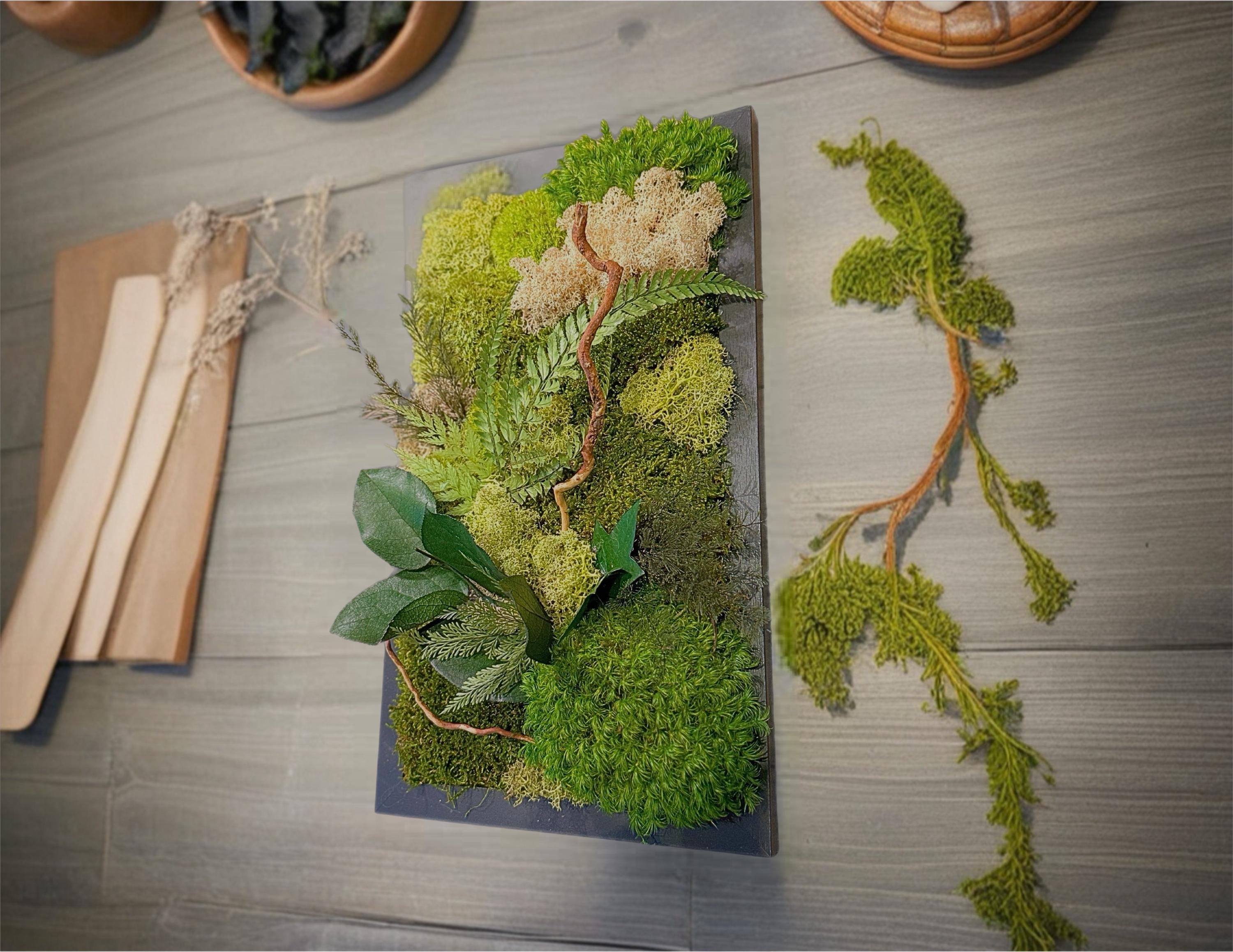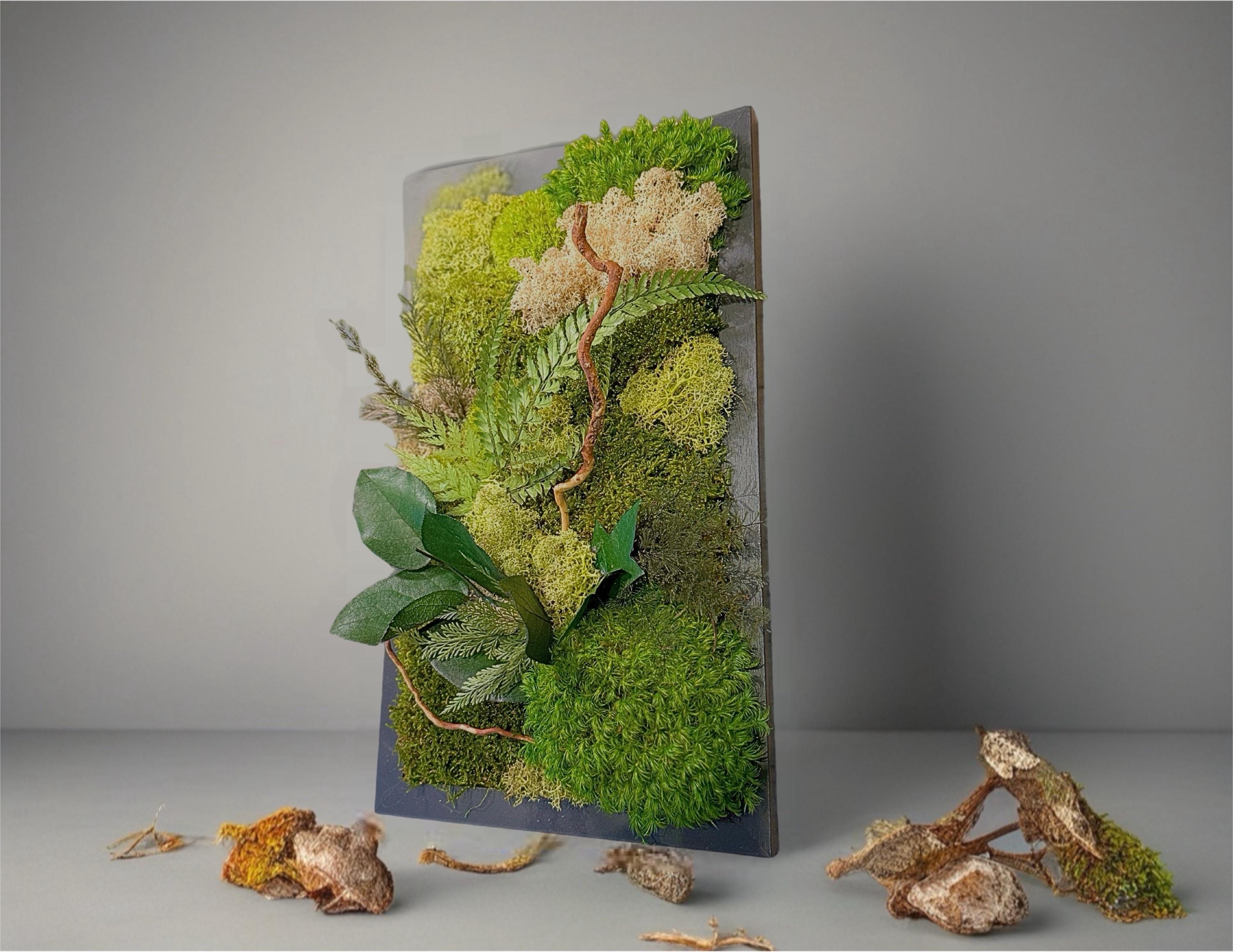 Chaque composition est unique, réalisée à la main avec des végétaux stabilisés : mousse plate, mousse de renne, lichen beige, fougère et eucalyptus.