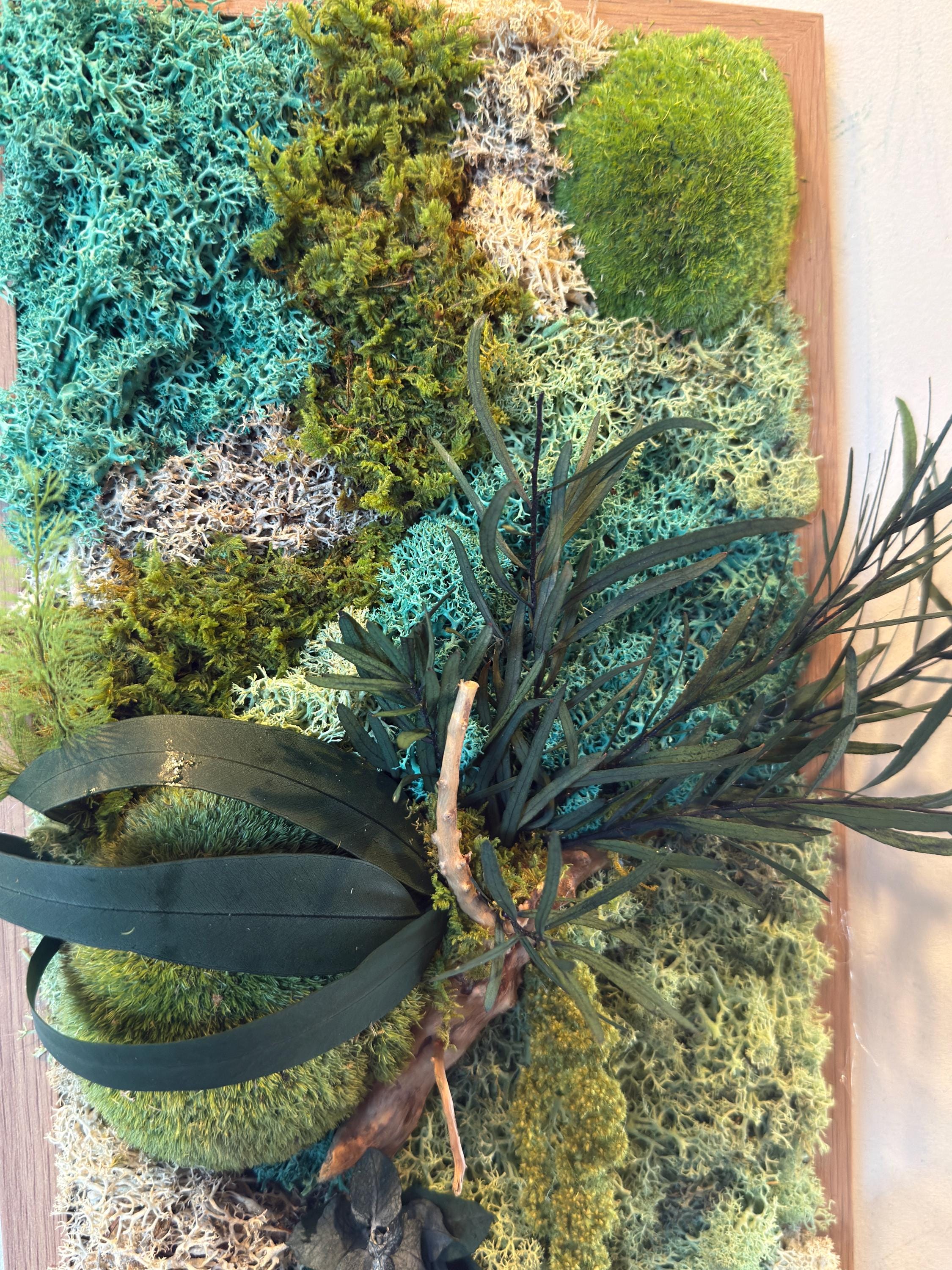 Apportez une touche de nature et de sérénité à votre intérieur avec ce cadre végétal stabilisé artisanal, mêlant nuances de verts et de bleus profonds.